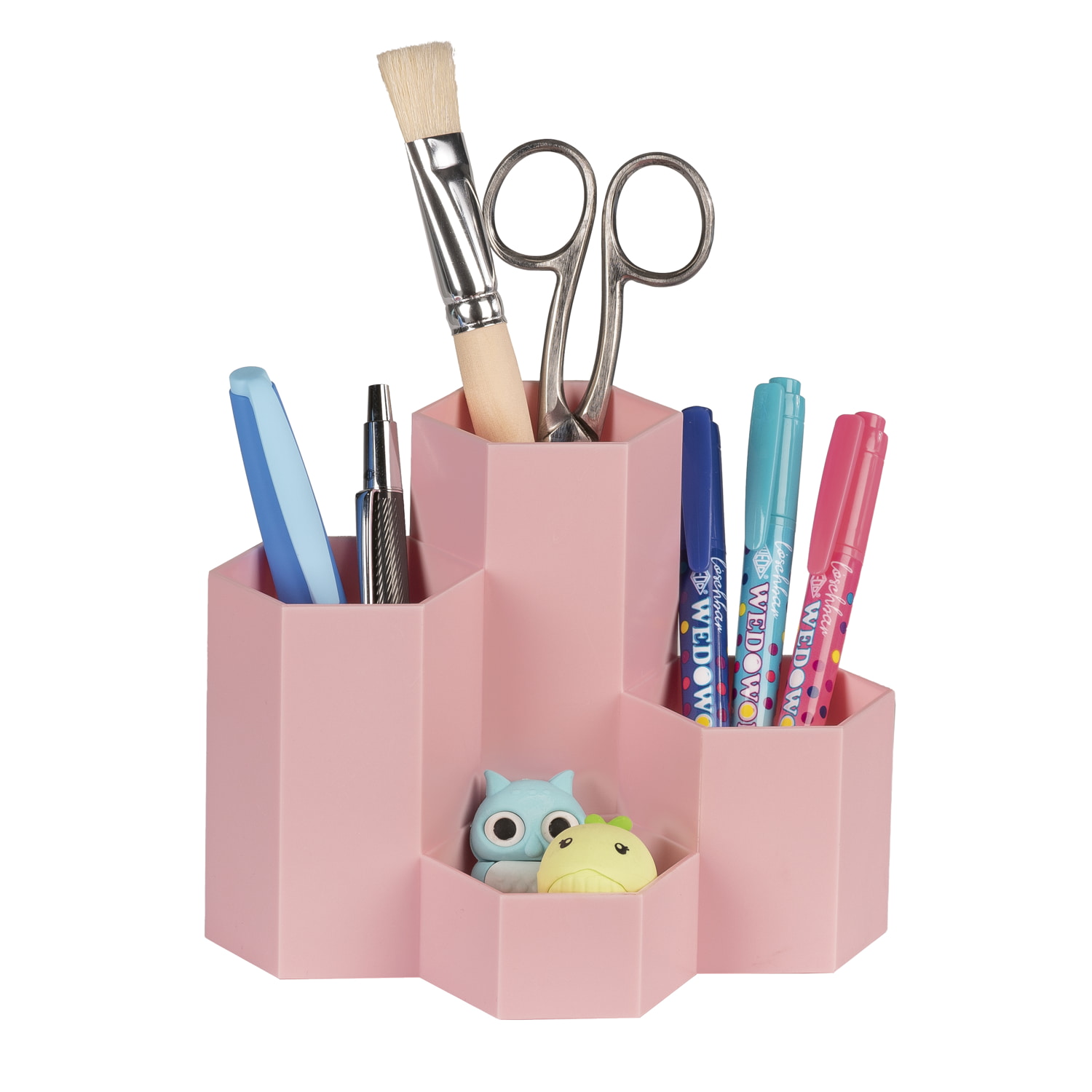 WEDO Sechseck-Butler „Honeycomb“ in rosa, mit 4 Sechseck-Röhren aus besonders haltbarem, schlagfesten Polypropylen. Durch Wabenform optimal platzsparend zu einer Gruppe zu arrangieren. In verschiedene Höhen angeordnet, bieten die 4 Röhren Platz für Lineal, Pinsel, Schere, Stifte und kleine Dinge, wie Spitzer und Radierer. Umweltfreudlich in Karton mit Sichtfenster verpackt. Maße Köcher: 16,00 x 11,20 x 12,00 cm