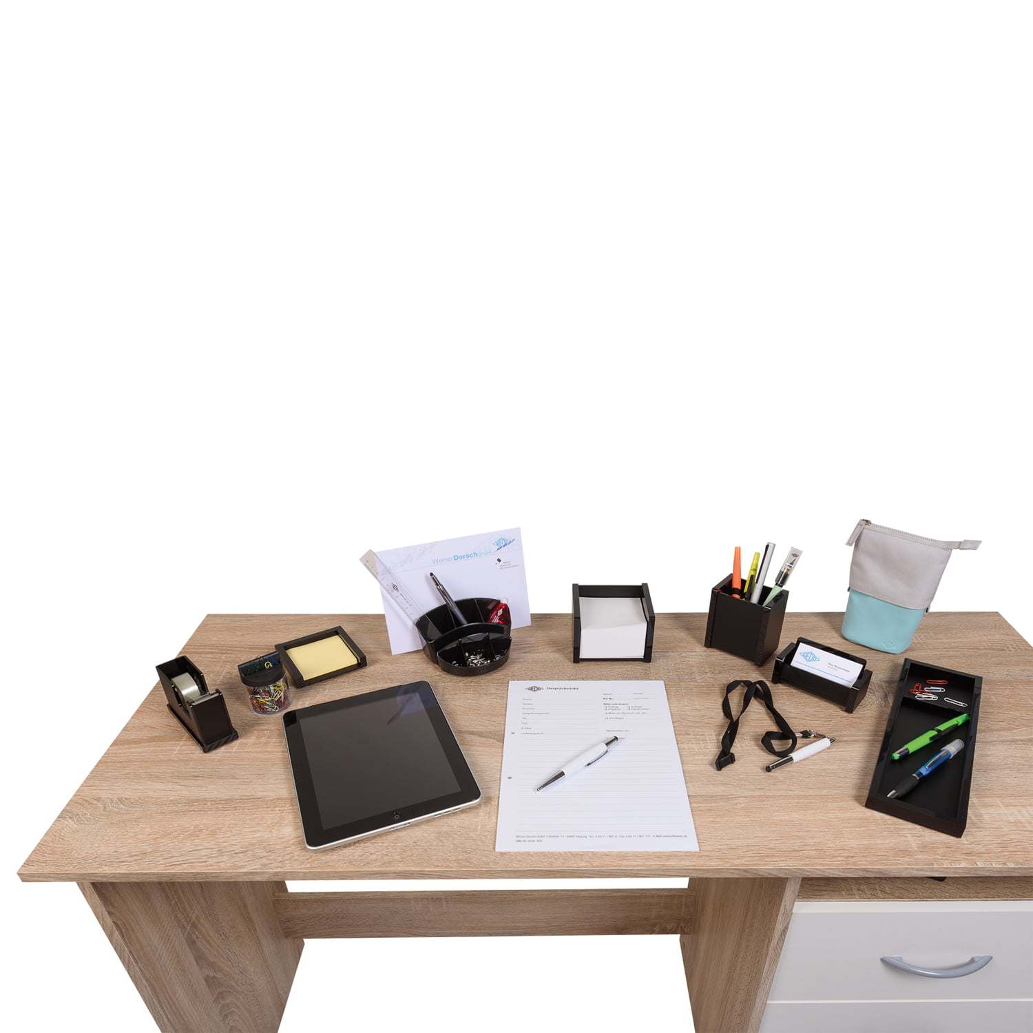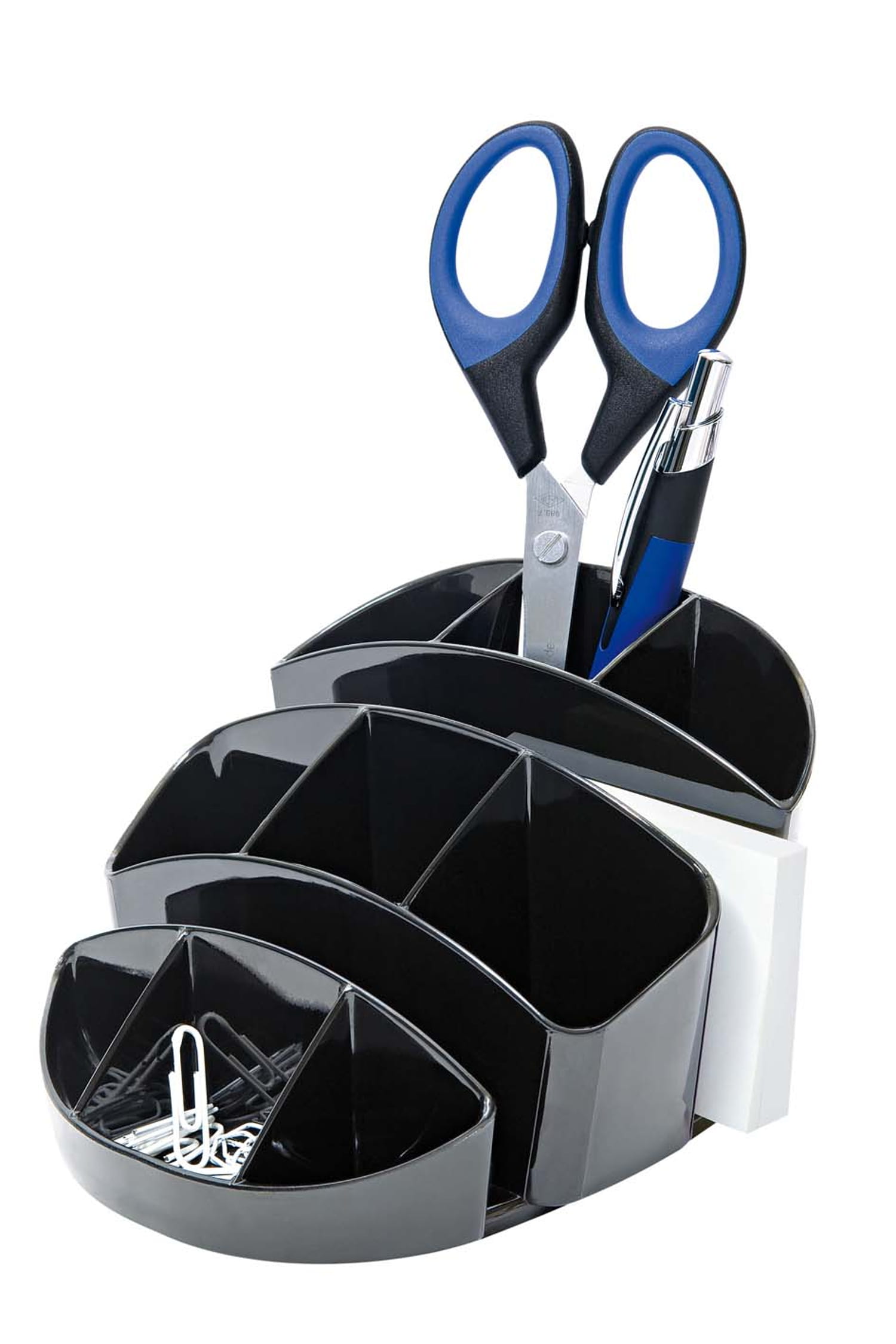 WEDO Butler Rotondo. Hält Ordnung auf dem Schreibtisch. Aus Polystyrol gefertigt, mit 9 Fächern für Stifte und Utensilien, einer Briefablage und einem Zettelfach. Gummifüße sorgen für einen rutschsicheren Stand und sind zugleich möbelschonend. Maße: ca. 15,0 x 13,5 x 9,0 cm, Farbe: schwarz. Lieferung im bebilderten Einzelkarton.
