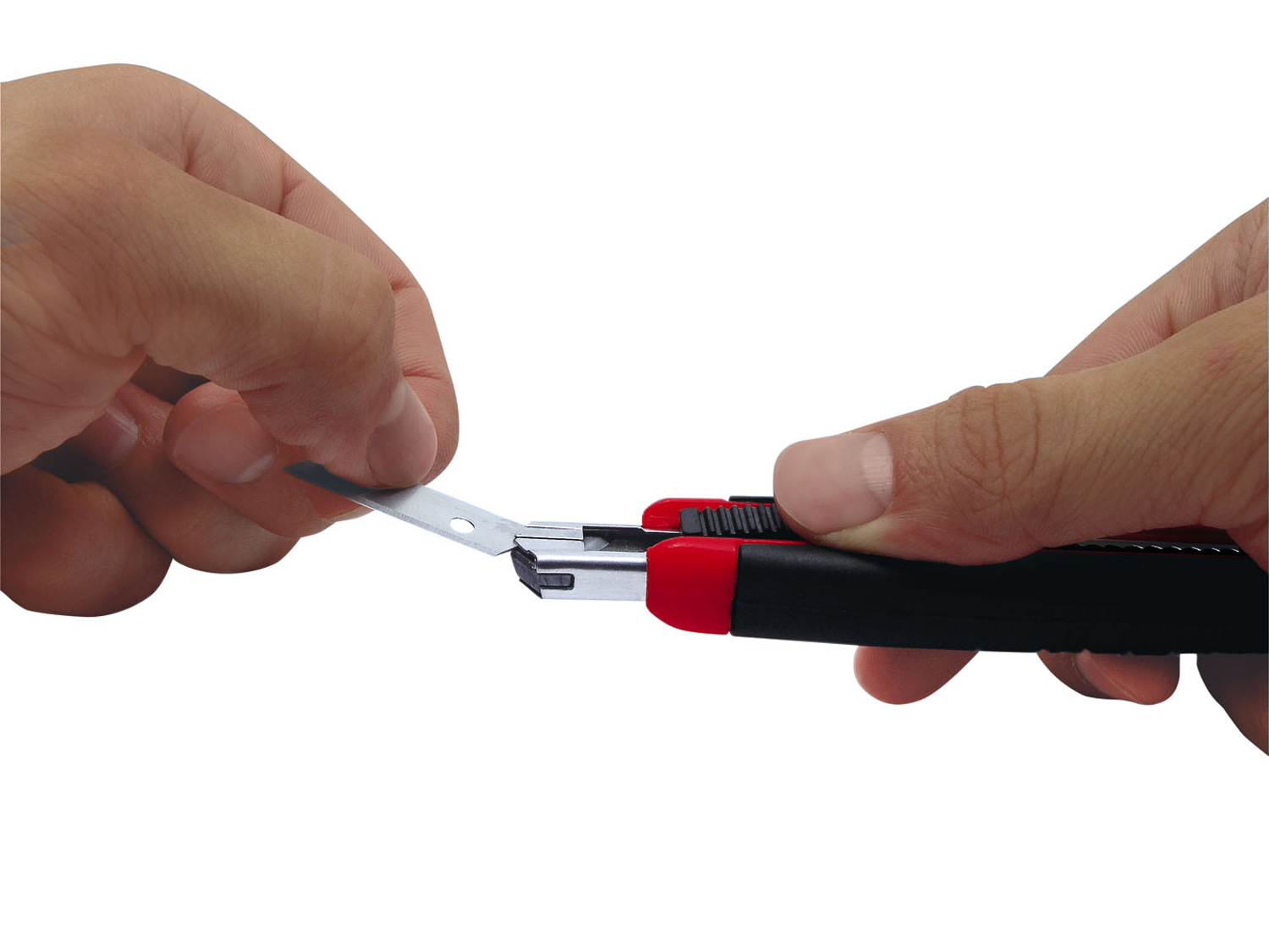WEDO Auto-Load Profi-Cutter, 9 mm, mit automatischem Klingentausch aus integriertem Magazin. Robustes Abbrechmesser aus ABS-Kunststoff mit komfortablem, rutschsicher gummiertem Griff. Klingenführung aus Metall. Mit Rastervorschub und Auto-Stop. Automatischer Klingentausch aus dem integrierten Klingenmagazin für 5 Klingen. Dazu wird der Schieber ganz nach vorne geschoben und die verbrauchte Klinge schräg nach oben entnommen. Durch das erneute Zurück- und Vorschieben ist die neue Klinge automatisch geladen. Lieferung in farbig bedruckter Kartonverpackung mit Hängelochung, inklusive Abbrechhilfe und fünf Klingen. Maße: ca. 14,0 x 1,5 x 3,0 cm, Gewicht: 58 g, Farbe: schwarz/rot