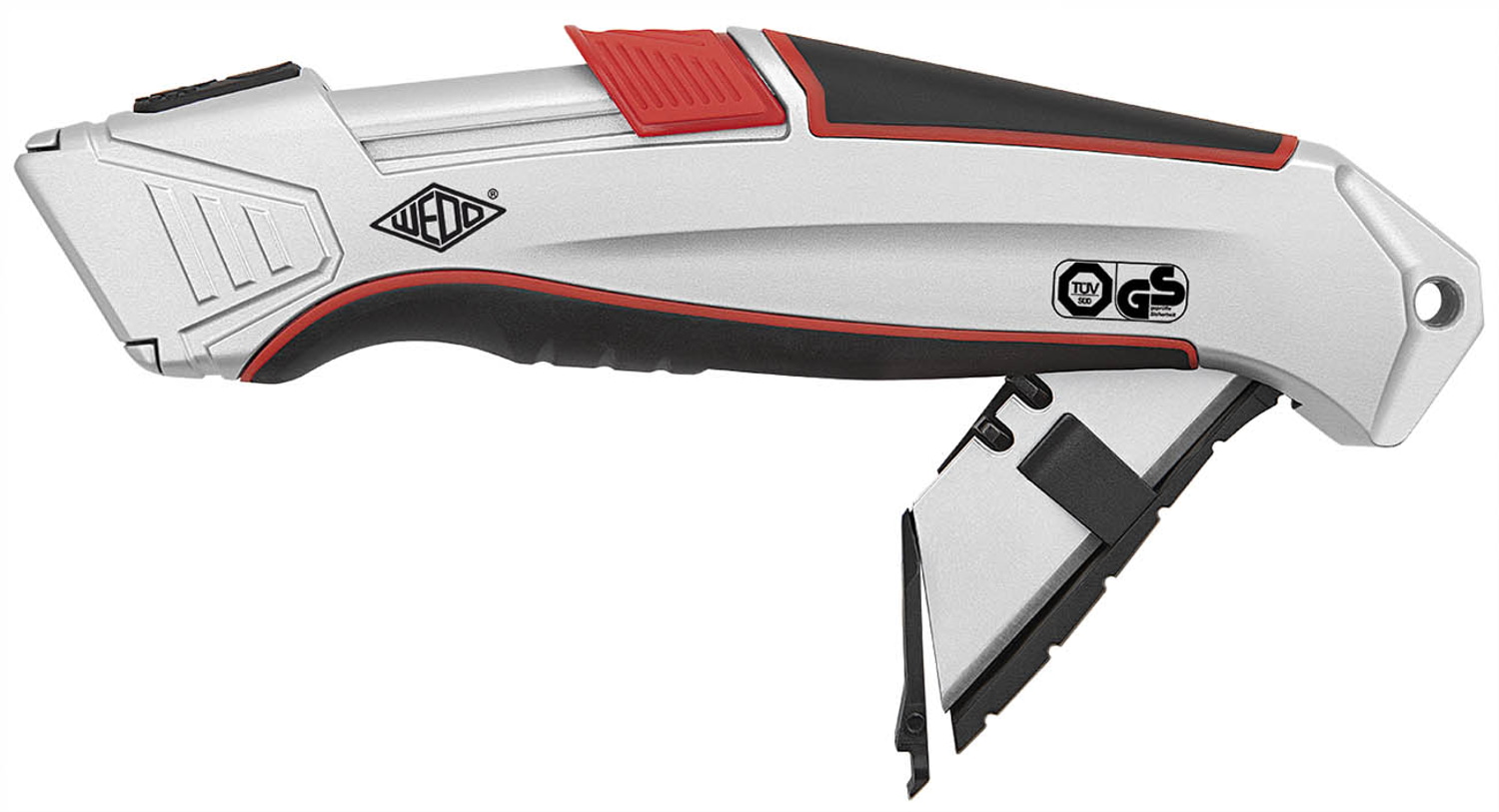 WEDO Safety-Cutter ALU im leichten Aluminium-Gehäuse mit automatischem Klingenrückzug. Die federbelastete Trapezklinge zieht sich nach dem Schnitt automatisch zurück (Schieber während des Schneidens nicht festhalten). Das robuste Aluminiumgehäuse mit gummierter Griffzone liegt leicht und sicher in der Hand. Durch die Positionierung des Klingenschiebers auf dem Messerrücken kann der Cutter sowohl von Rechts- als auch von Linkshändern benutzt werden. Leichter Klingenwechsel aus dem integrierten Magazin für 3 Ersatzklingen. TÜV/GS-geprüft. Maße: ca. 16,5 x 2,0 x 4,0 cm, Gewicht: ca. 108 g, Farbe: silber/schwarz/rot. Lieferung mit einer hochwertigen Trapez-Ersatzklinge aus SK5-Carbonstahl im integrierten Magazin.