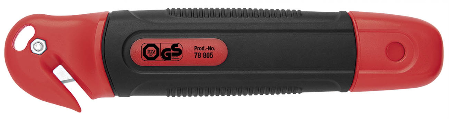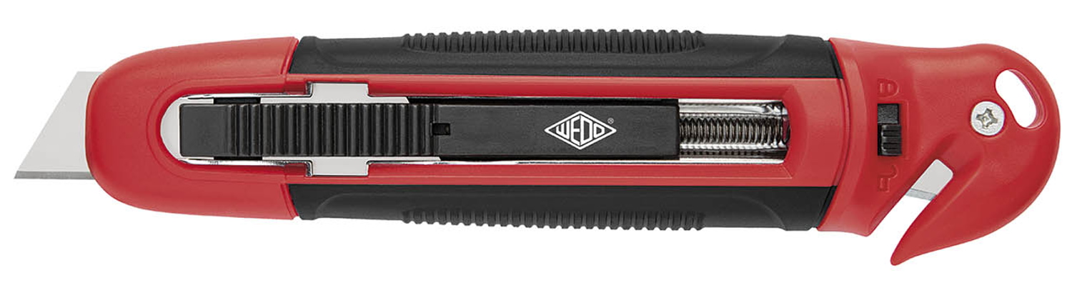 WEDO Safety Cutter STANDARD mit automatischem Klingenrückzug und integriertem Folienschneider. Die federbelastete Trapezklinge zieht sich nach dem Schnitt automatisch zurück, wenn der Schieber während des Schneidens nicht festhalten wird. Das robuste Gehäuse aus ABS-Kunststoff mit gummierter Griffzone liegt leicht und sicher in der Hand. Klingenführung aus Metall. Klingenaustritt bis 1,5 cm. Klingenwechsel ohne Hilfsmittel durch Vorschieben und Zurückklappen des Klingenschiebers. Die Klinge ist für Linkshänder umsteckbar. Mit der Sicherheitsarretierung kann das Vorschieben der Trapezklinge blockiert werden. Die geschützte Klinge an der Rückseite sorgt für das sichere Schneiden von Schrumpffolie, Kordeln, Umreifungsbändern u.ä. Der Cutter ist außerdem mit einem Aufhängeloch ausgestattet. Lieferung mit hochwertigen Klingen aus SK5-Carbonstahl. Maße: ca. 15,8 x 3,6 x 2,1 cm. Farbe: rot/schwarz, TÜV/GS-geprüft.