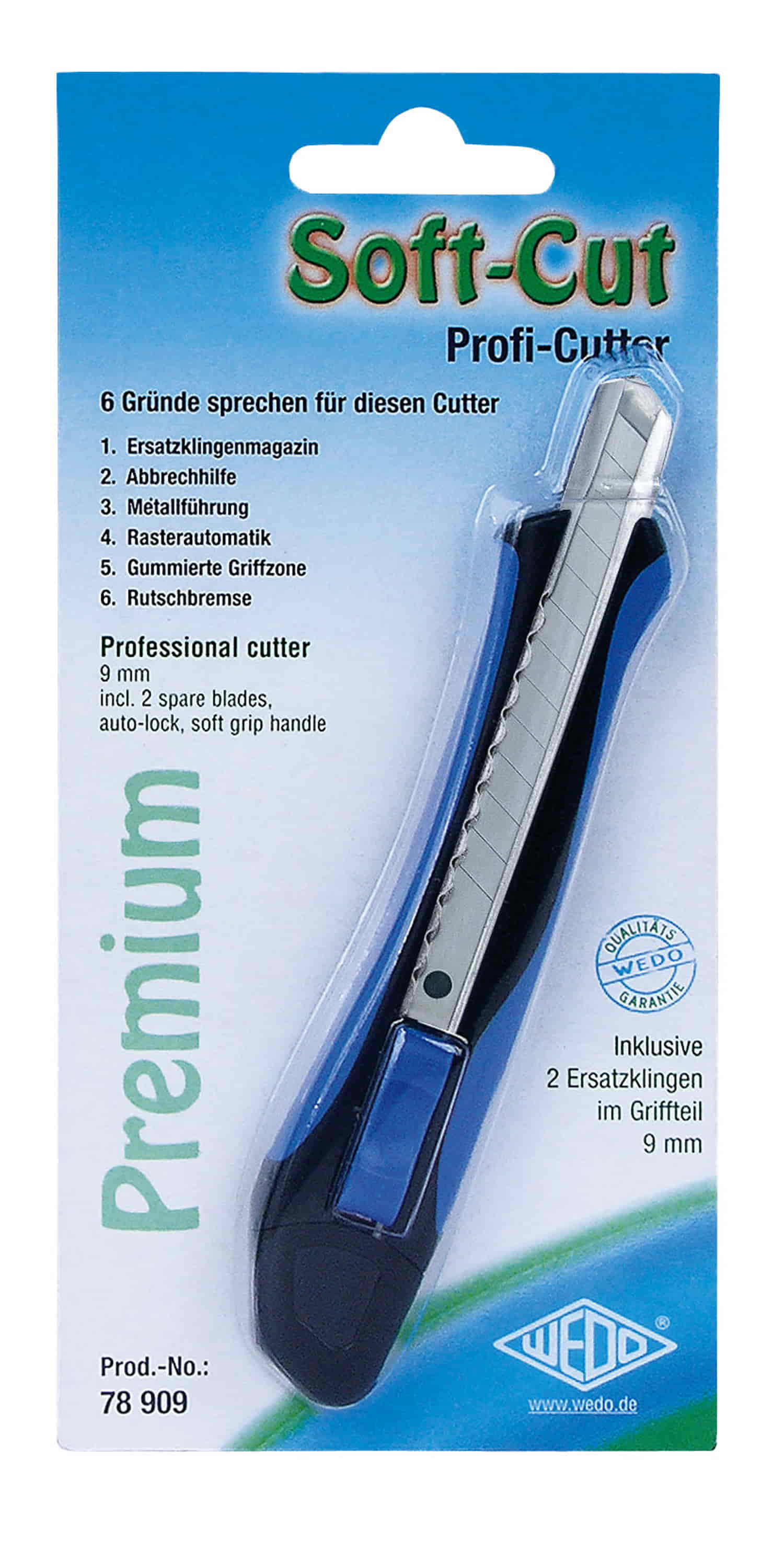 WEDO Softgrip-Cutter 9 mm, in Profi-Qualität. Durch das edle Design und die gummierte Griffzone wird das Schneiden zum Vergnügen. Die gummierten Griffschalen mit Rutschbremse erlauben eine optimale Handhabung. Eine exakte Klingenführung wird durch den Metallkern gewährleistet, die Rasterautomatik sichert die Klinge in der eingestellten Position. Zwei Ersatzklingen befinden sich im Klingenmagazin des Griffteils ... jederzeit griffbereit ! Länge 13,5 cm.