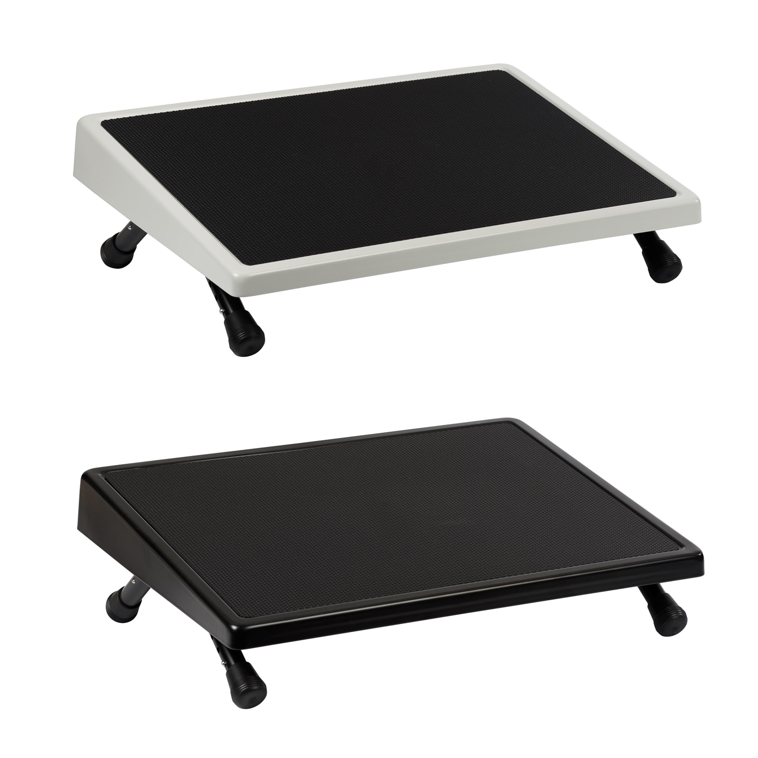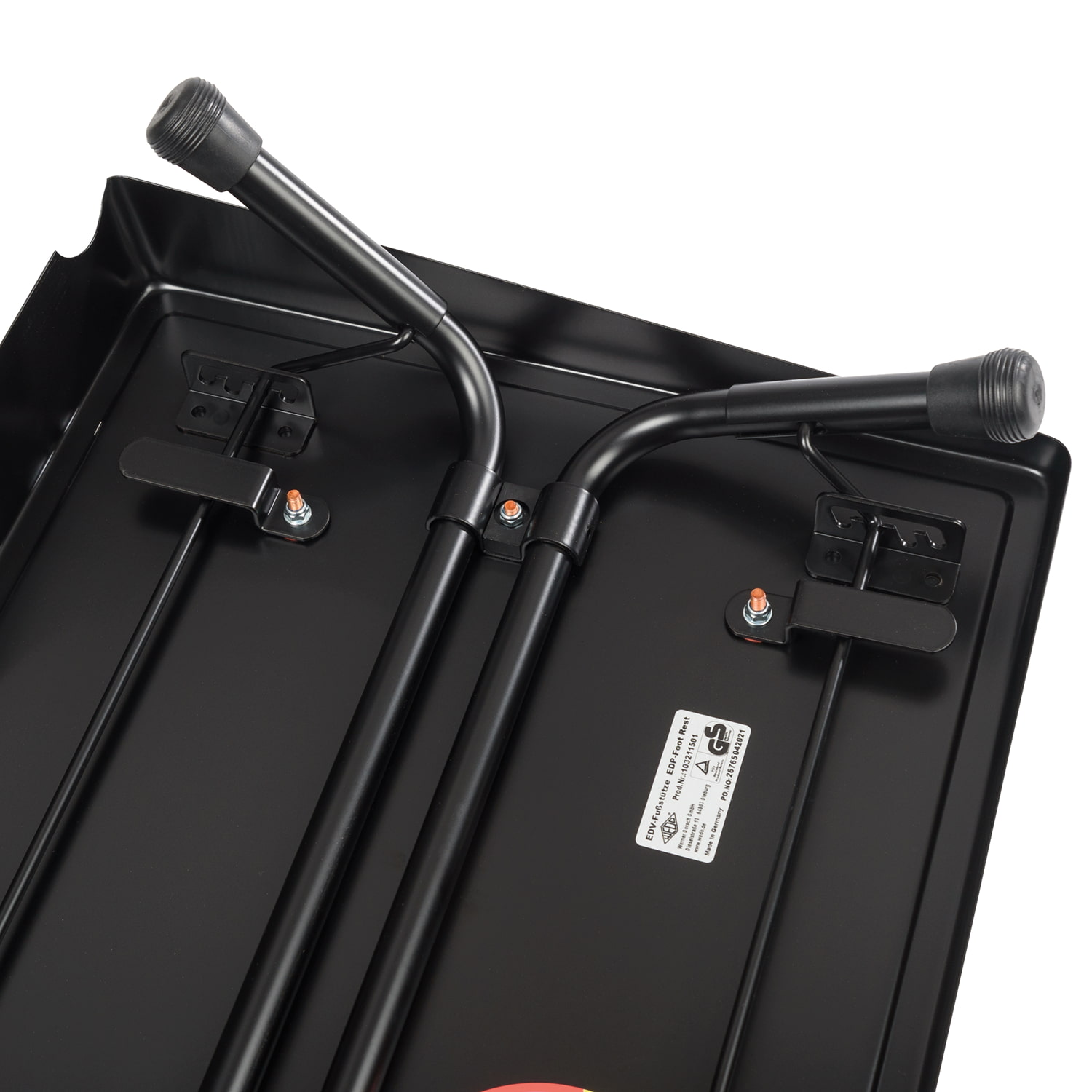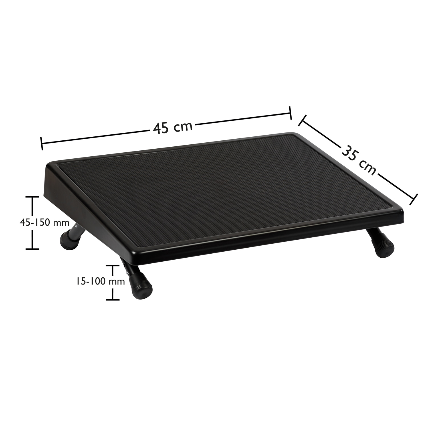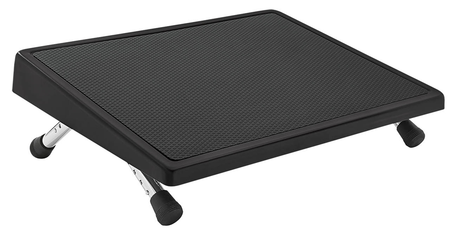 WEDO EDV Fußstütze. Eine stabile Konstruktion aus gezogenem Stahlblech mit abgerundeten Kanten. Die Trittfläche ( 45,0 x 35,0 cm) ist mit einem rutschfesten Gummibelag versehen. Die Neigung ist in vier Höhenstufen individuell einstellbar. Dicke Gummifüße garantieren gute Standfestigkeit. Entspricht DIN 4556, TÜV- und GS-geprüft, 3 Jahre Garantie. Höhen vorne 30 - 110 mm, hinten 60 - 175 mm. Farbe: schwarz (RAL9005).