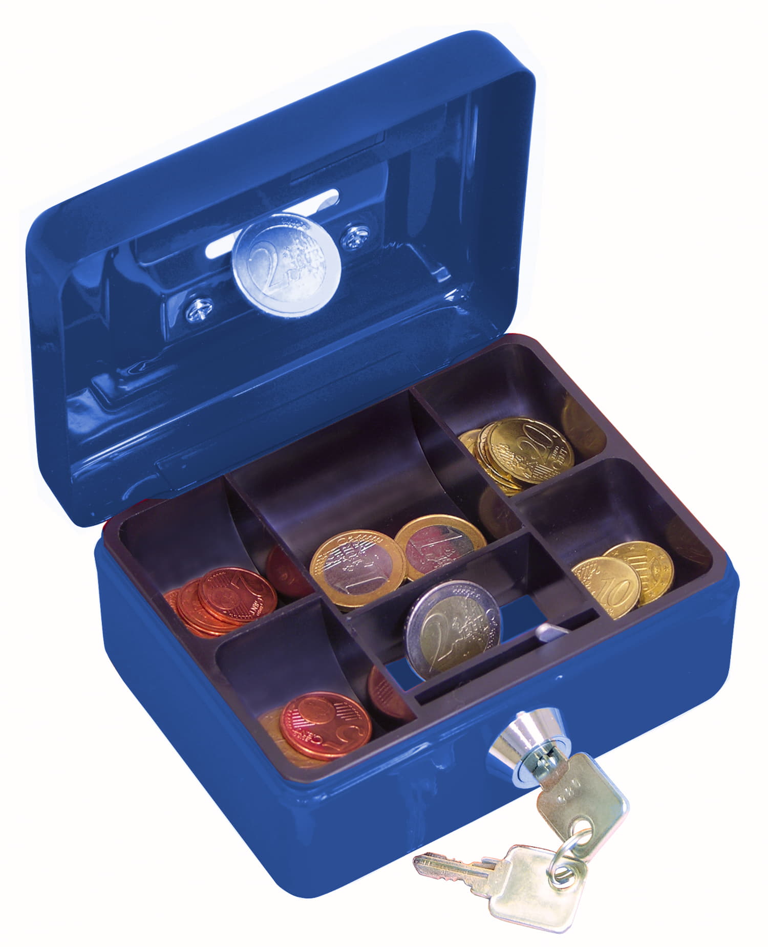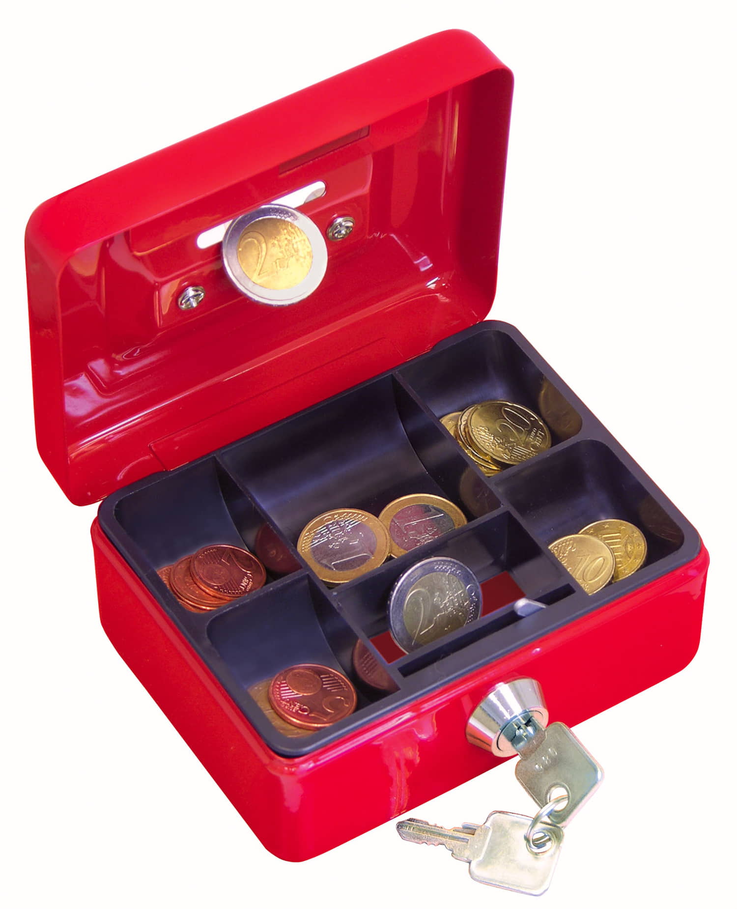 WEDO Geldkassette mit Einwurf-Schlitz. Aus Stahl nahtlos gezogen, kratzfest pulverbeschichtet, Zylinder-Sicherheitsschloss mit 2 Schlüsseln, 5-Fächer-Muldeneinsatz aus Kunststoff, Schlüssel-Nr. auf dem Schloss eingraviert. Griff im Deckel versenkt. Größe: 12,5 x 9,5 x 6,3 cm. 6 Stück sortiert im Verkaufsdisplay.