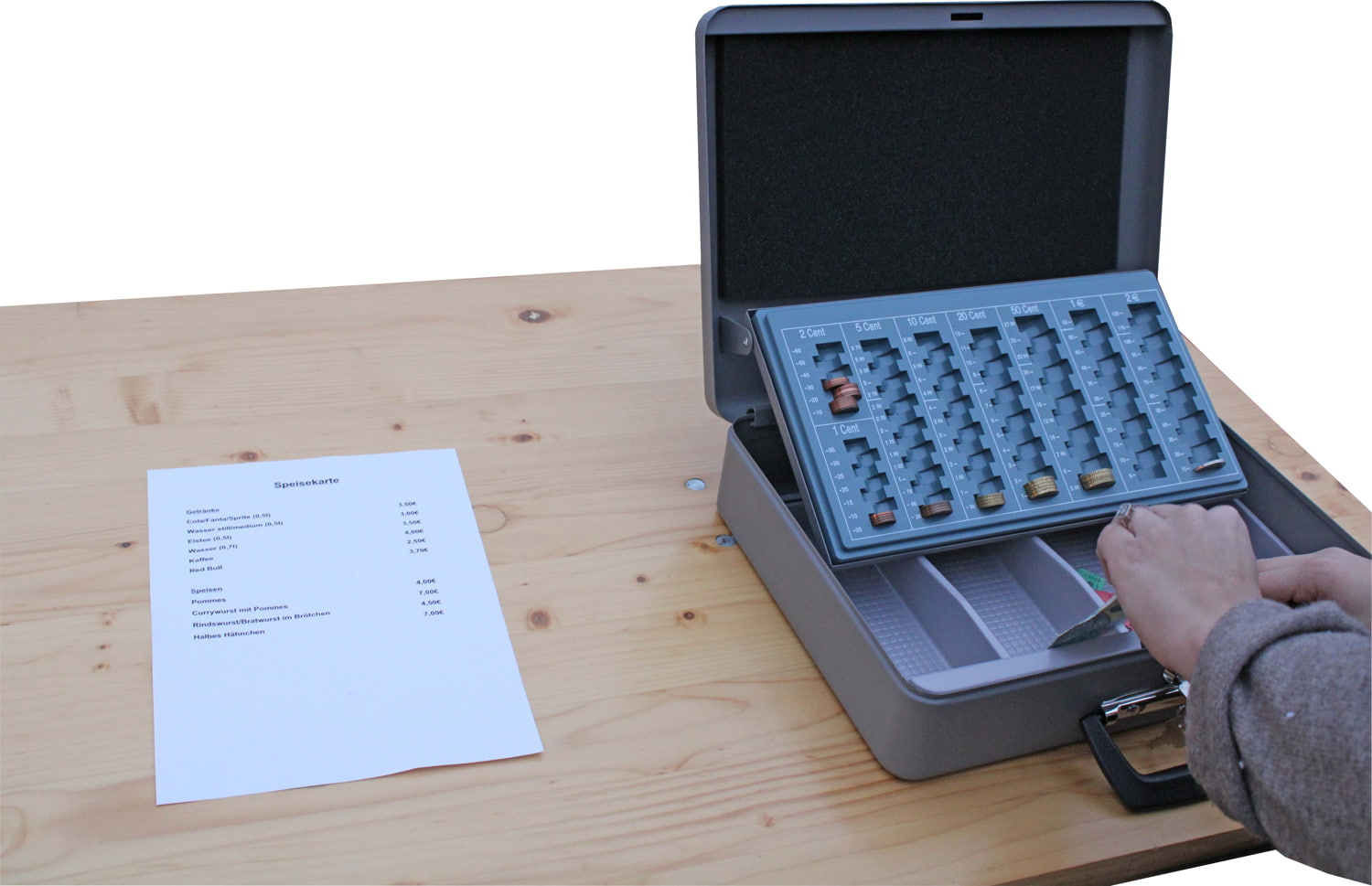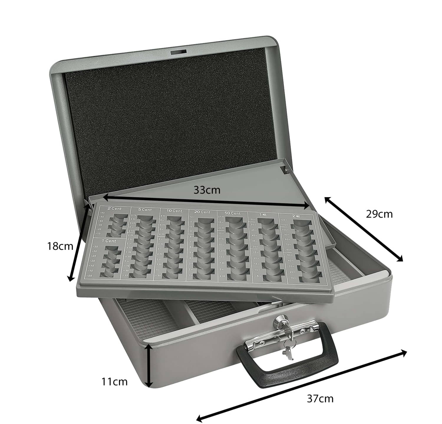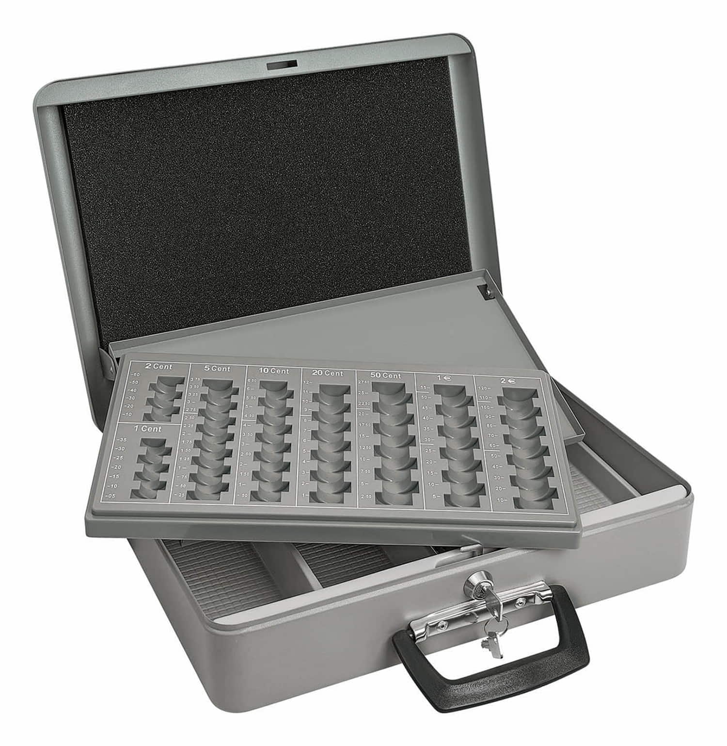 WEDO Geldzählkassette MAXI, Fassungsvermögen Euro 225,70 Hartgeld. Gefertigt aus pulverbeschichtetem Stahlblech mit zwei Tragegriffen für Münzen und Banknoten. Die Kassette ist mit einem Zylindersicherheitsschloss mit 2 Schlüsseln ausgestattet. Der Hartgeldeinsatz gleitet beim Öffnen des Koffers automatisch nach hinten. Das Münzgeld wird durch den Schaumstoffeinsatz im Deckel beim Transport fixiert. Geldscheinmulde mit 4 Banknotenfächern. Maße: 37,0 x 29,0 x 11,0 cm. Farbe: grau. Lieferung im Einzelkarton.
