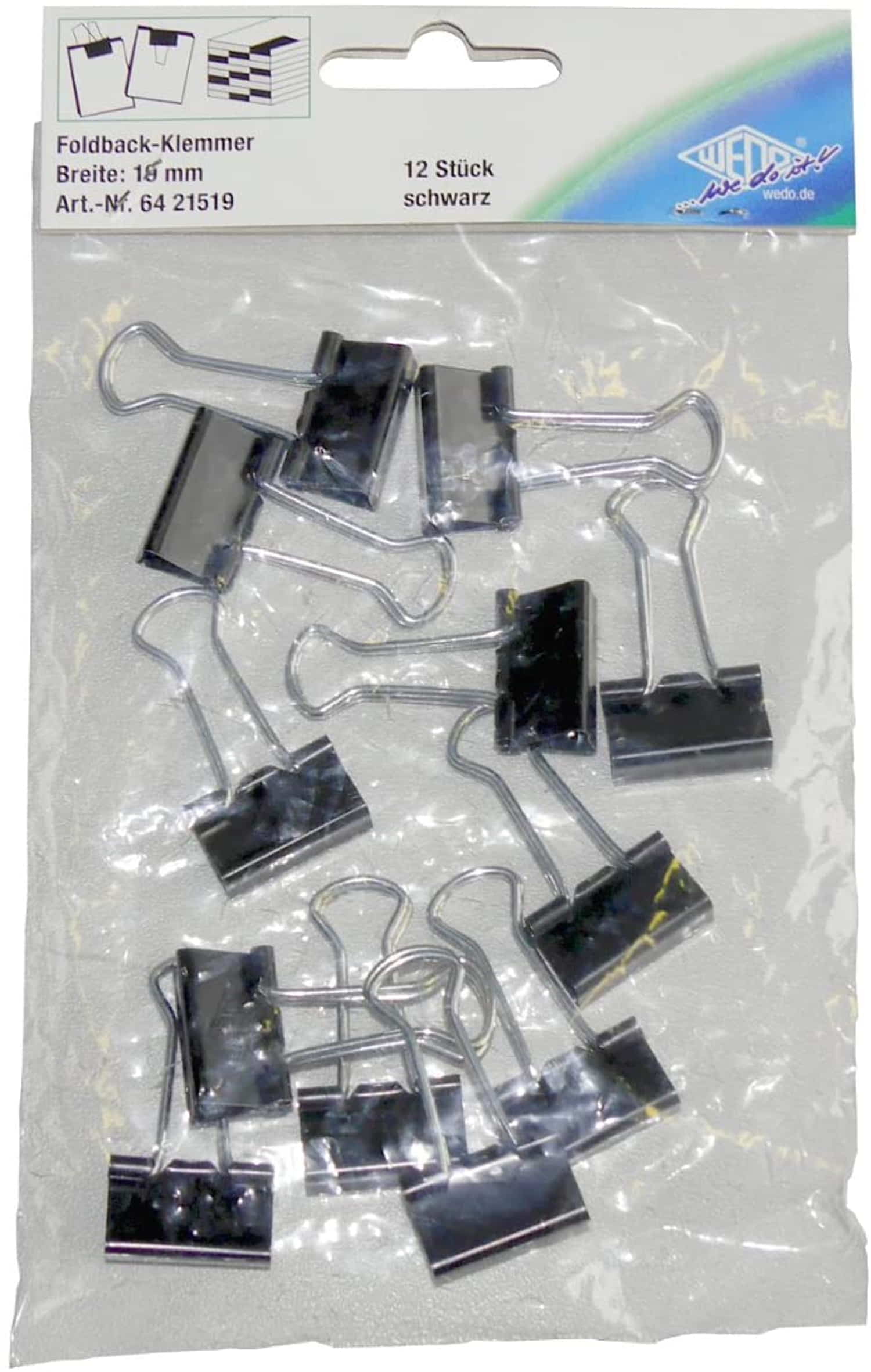 WEDO Foldback-Klemmer 19 mm schwarz. Hält Notizen zusammen, oder dient zur Befestigung von allen möglichen Dingen. Aus lackiertem Metall, mit starker Feder und abnehmbaren, vernickelten Bügel. Sperrweite 7 mm, Breite 19 mm. SB-Verpackung mit 12 Klemmern.