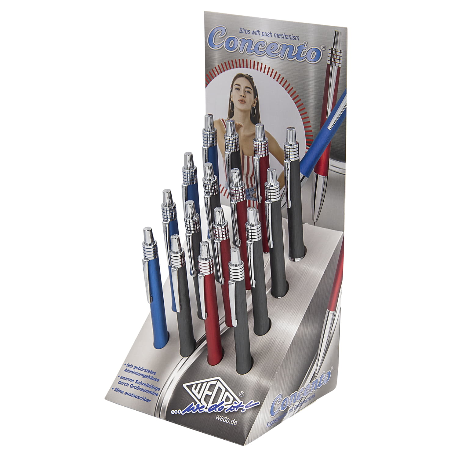 WEDO Kugelschreiber Concento NEW - wertiger Kugelschreiber, ausgestattet mit Druckmechanik, praktischem Clip und einer blauen auswechselbaren Metallmine im Parker-Format. Die mattgebürstete Edelstahloberfläche hat eine schöne Haptik und ist ein echter Blickfang. Der Kugelschreiber ist gravierbar. Die Druckmechanik ist chromfarben abgesetzt und mit 4 markanten Linien in der Gehäusefarbe betont. Stiftlänge: ca. 13,5 cm. Lieferung im attraktiven Keildisplay mit 16 Ball Pens zu je 4 Stück in den Farben Rot und Stahlblau und 8 Stück in der Farbe Anthrazit. Displaygröße inkl. Kopfschild: ca. 12,5 x 12,5 x 27,5 cm