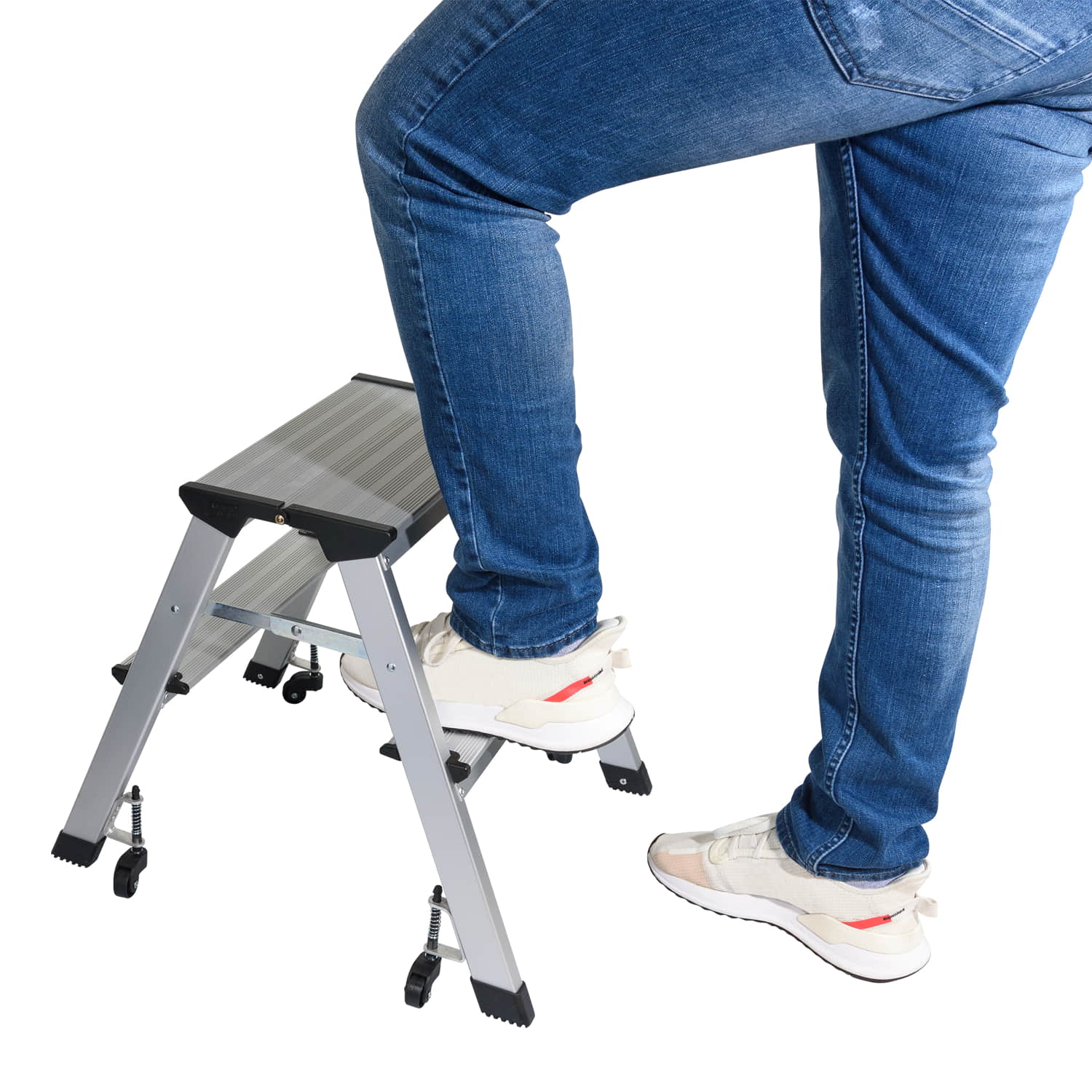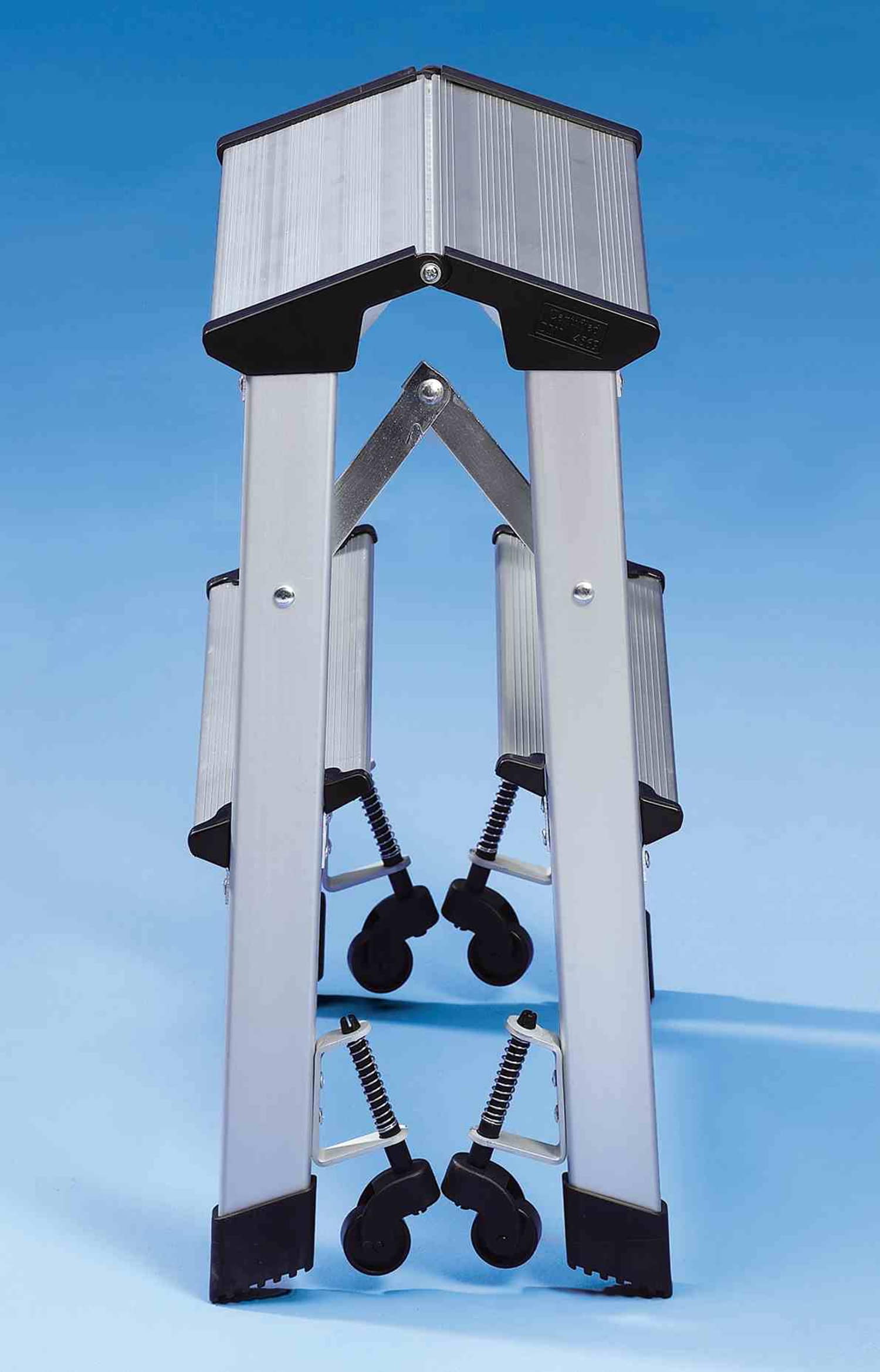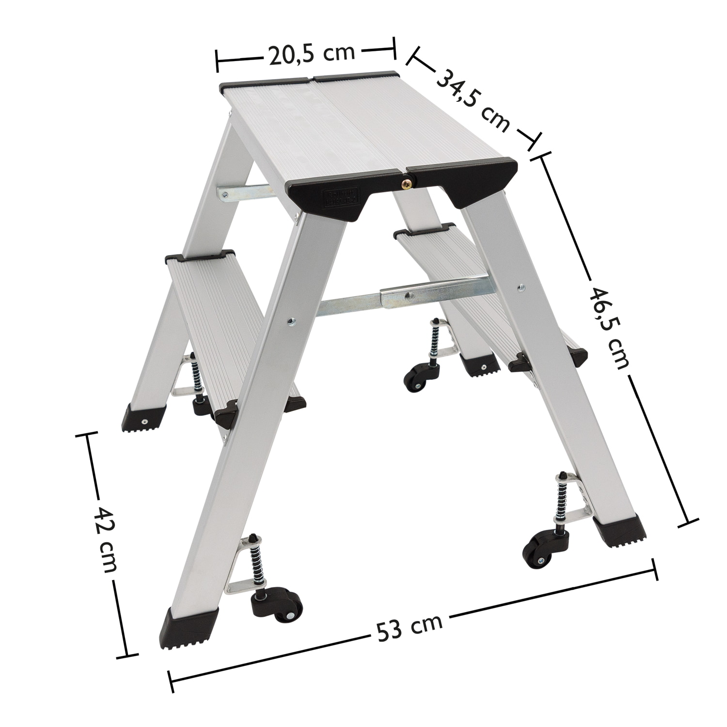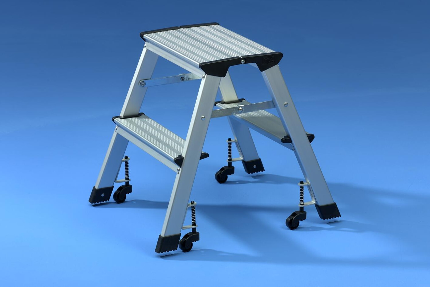 WEDO Mobile Trittleiter. Robuste 2x2-stufige Trittleiter aus Aluminium, die sich mit einem leichten Kick auf ihren vier Gleitrollen in alle Richtungen bewegen lässt. Bei Belastung der geriffelten Trittstufen senkt sich die Trittleiter unverrückbar und bietet sicheren Stand. Alle Kanten sind durch Kunststoffkappen geschützt und bieten so optimalen Schutz vor Verletzungen. Zusammengeklappt (22 cm) passt sie selbst in kleinste Zwischenräume und ist so sicher eine gute Hilfe für Beruf, Hobby und Haushalt. TÜV- und GS-geprüft nach EN 14183-B-2. Tragkraft 150 kg. Maße: ca. 53 x 41 x 44,5 cm (L/B/H), geklappt ca. 41 x 22 x 49,5 cm (L/B/H). Gewicht 1,9 kg.