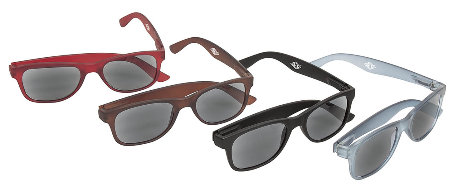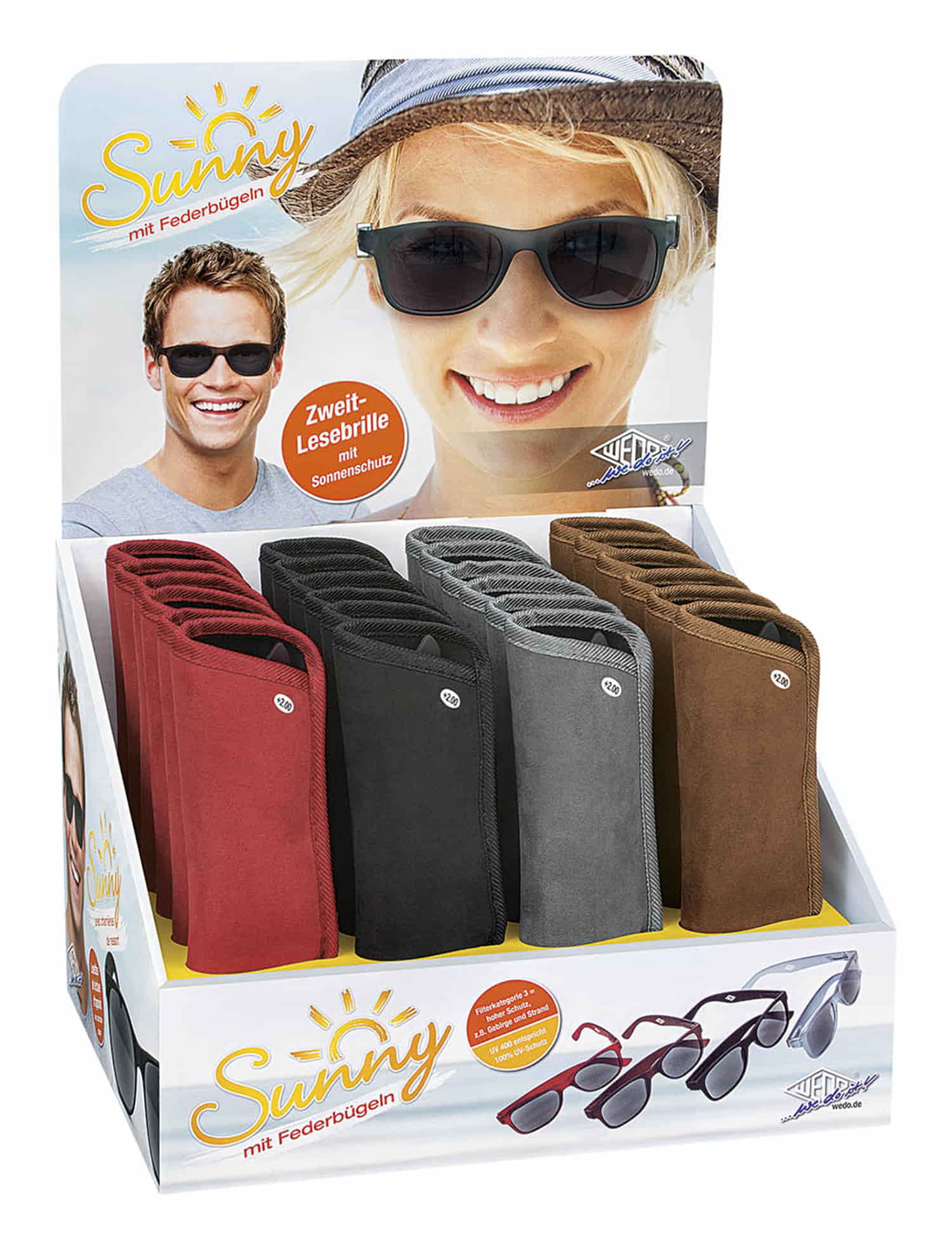 WEDO Zweit-Lesebrillen SUNNY mit Sonnenschutz und Federbügeln. Ob beim Lesen auf dem Balkon, im Garten oder am Strand, die getönten Gläser dieser modischen Lesebrillen schützen die Augen vor hellem Sonnenlicht und sorgen für ungetrübten Lesespaß. Das Brillengestell ist aus transluzentem Kunststoff gefertigt und mit Federbügel-Scharnieren für hohen Tragekomfort ausgestattet. Die Kunststoffgläser entsprechen der Filterkategorie 3 nach DIN EN ISO 12312-1:2013+A1:2015 und bieten 100% UV-Schutz. Erhältlich in vier Farben und vier Dioptrien-Stärken in farblich passenden Etuis. Größe des Etuis: ca. 15,8 x 5,7 x 3,1 cm. Lieferung im attraktiven Display mit 24 Brillen: 4 x 1,5 Dioptrien, 8 x 2,0 Dioptrien, 8 x 2,5 Dioptrien und 4 x 3,0 Dioptrien, jeweils in Rot, Braun, Schwarz und Grau. Displaygröße: ca. 28,5 x 24,5 x 40 cm. Eine Deko-Lesebrille zum Einsetzen in das Kopfschild liegt jedem Display bei.