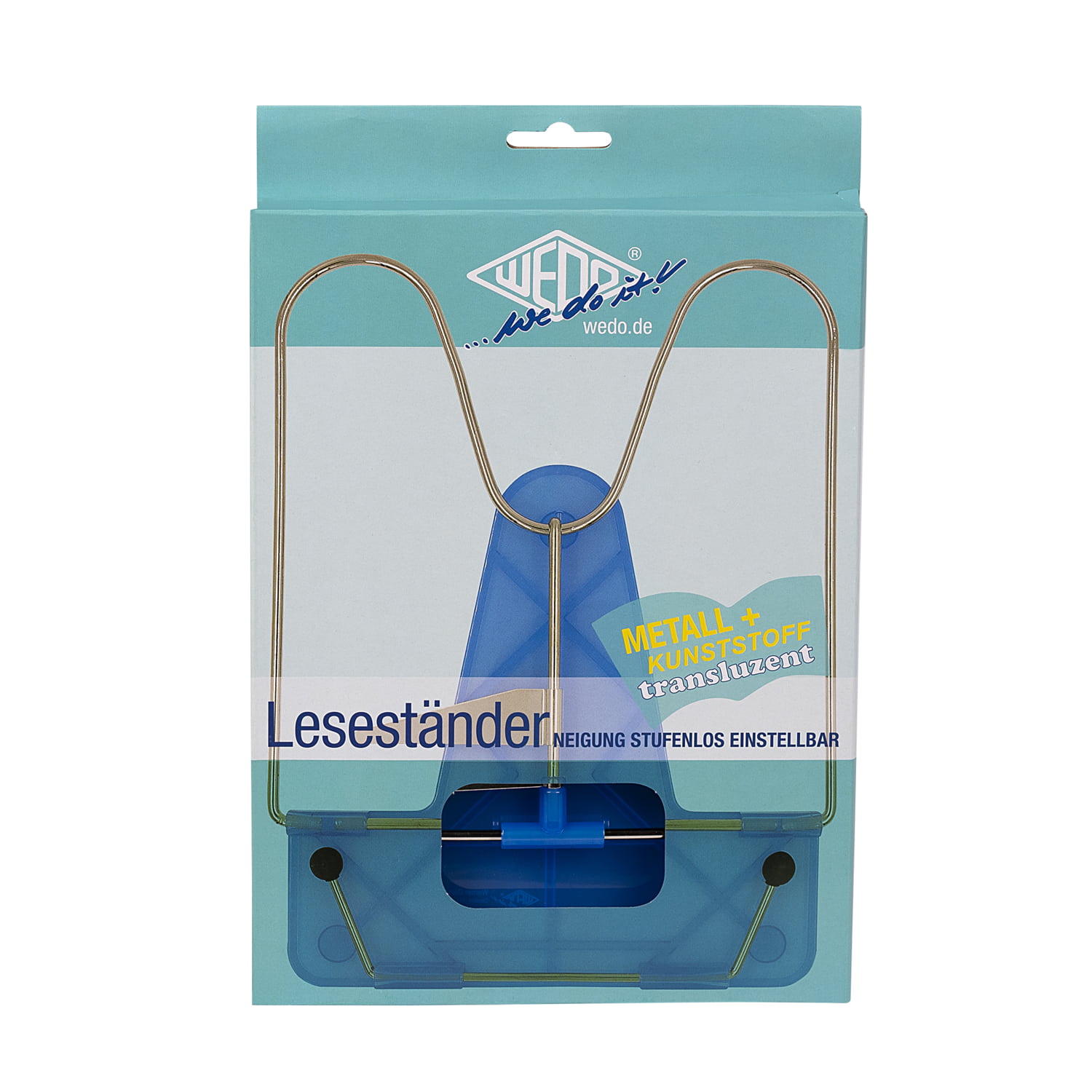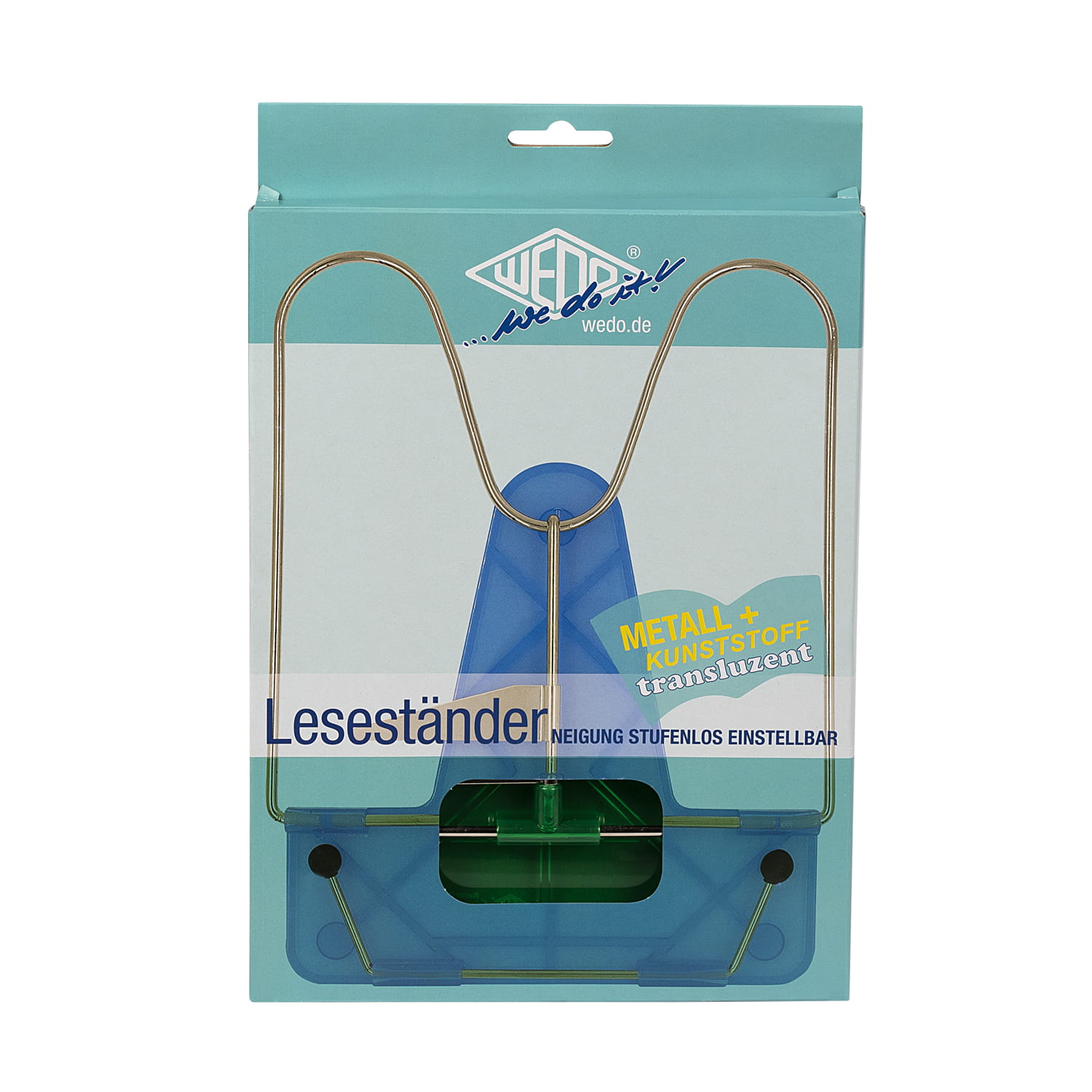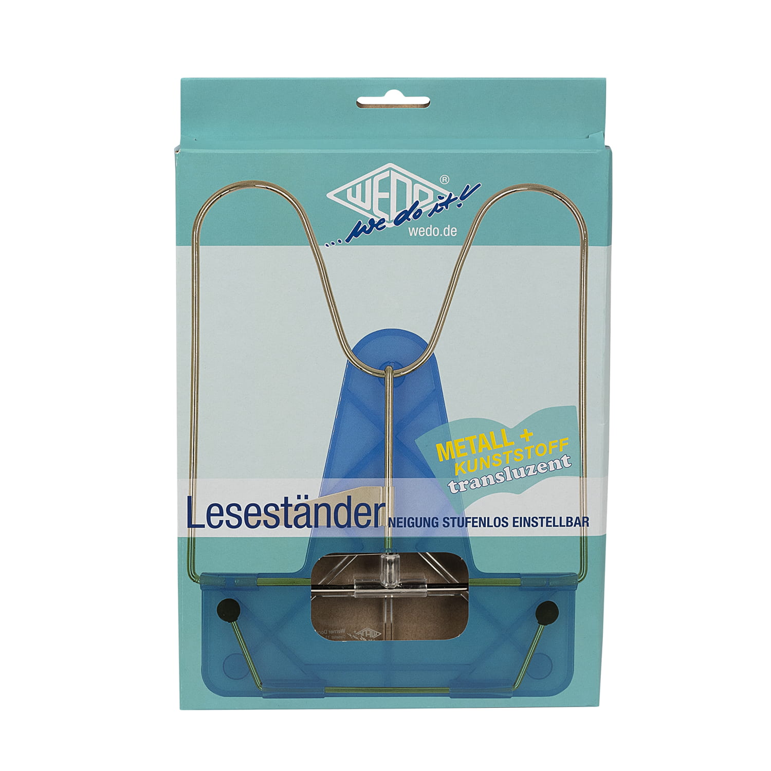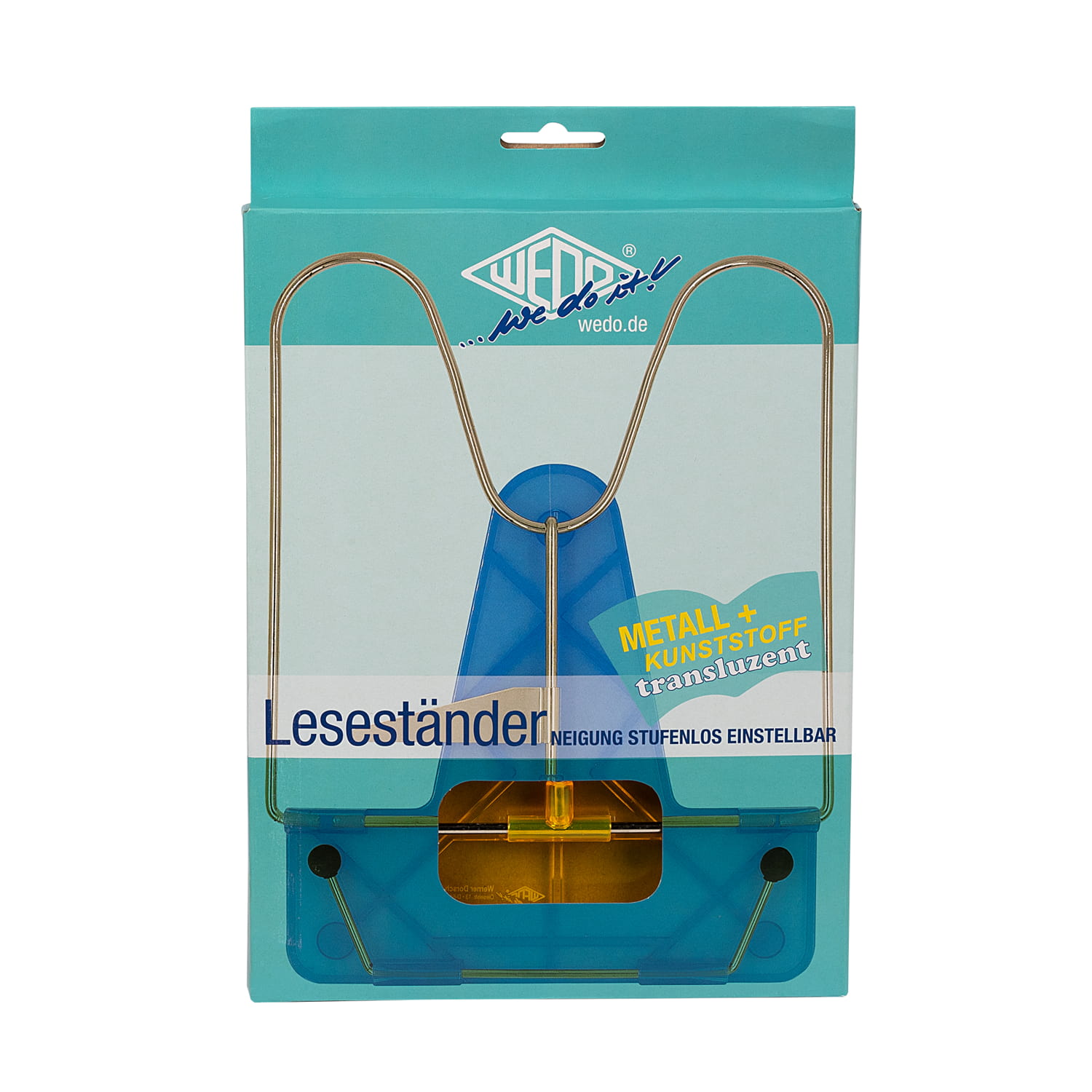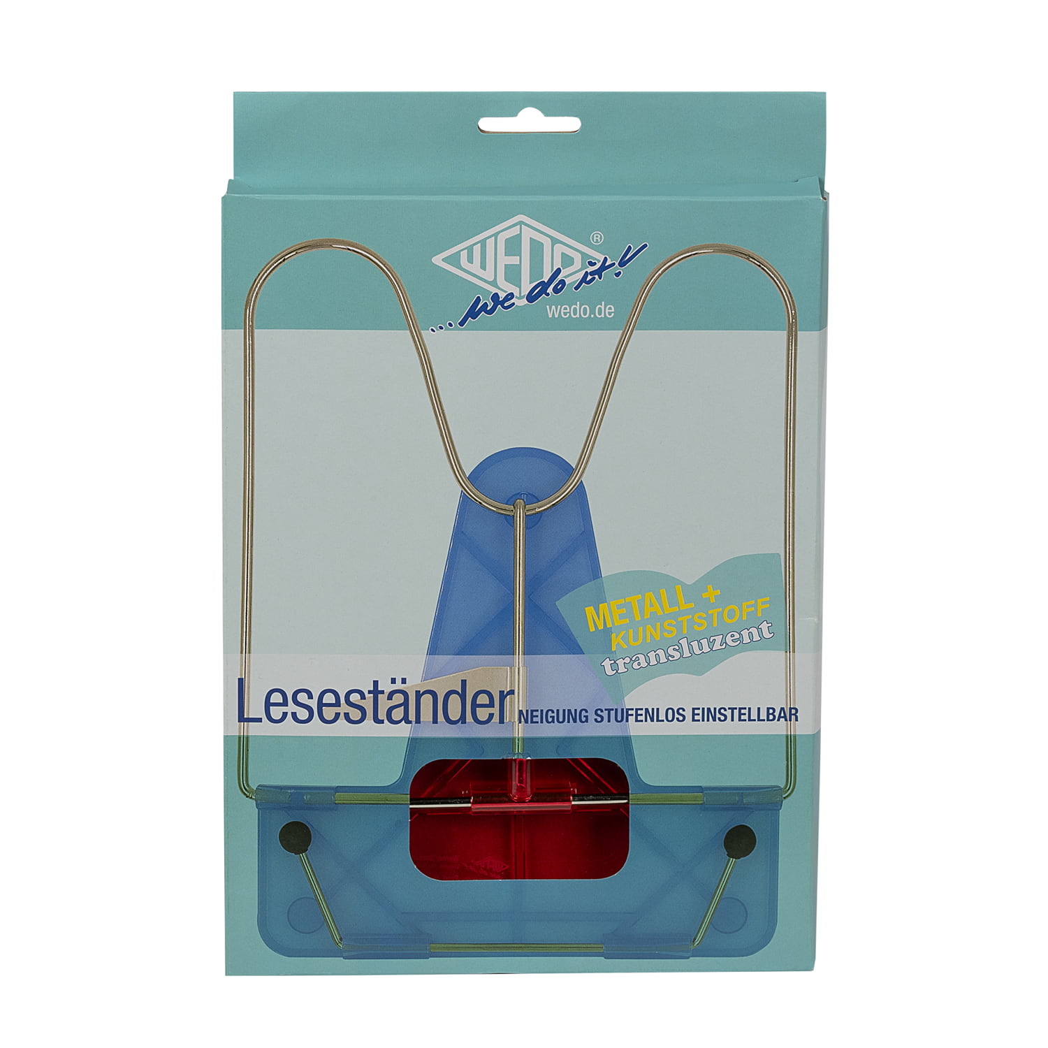 WEDO Leseständer in leuchtend schönen Farben. Gefertigt aus transparentem Kunststoff und mit Metallbügeln ausgestattet. Vielseitig einsetzbar in Schule, Hobby und Beruf - auch als Notenständer. Die Schräglage ist stufenlos verstellbar. Maße: ca. 22,4 x 17,1 x 1,5 cm (zusammengeklappt). Lieferung farbig sortiert in SB-Karton mit Euroloch.
