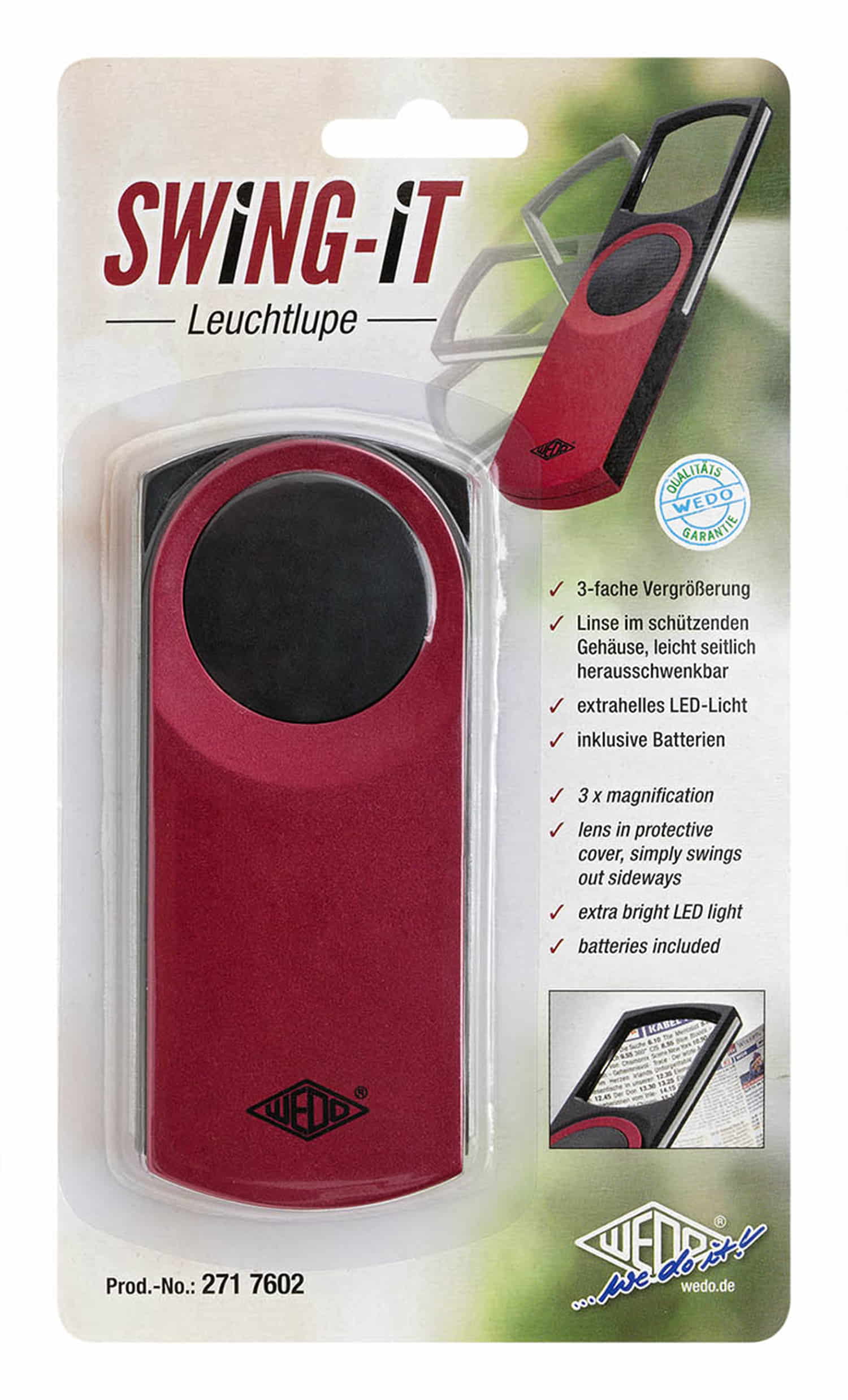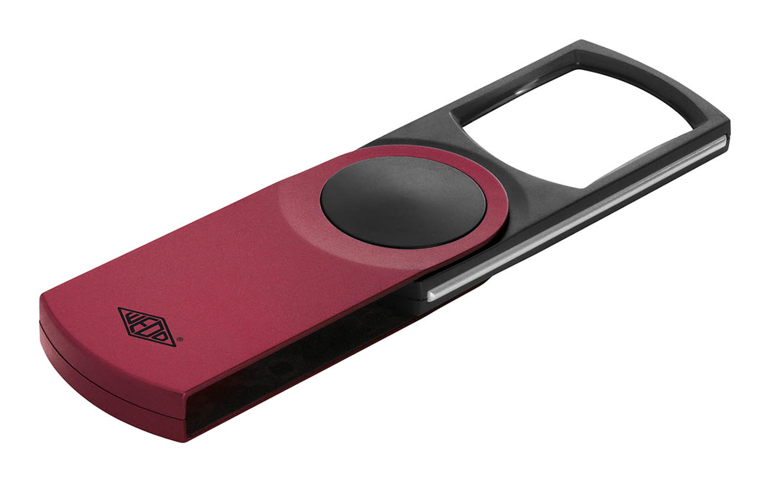 WEDO Leuchtlupen SWING-IT mit 3-facher Vergrößerung, rot-metallic. Die Linse dieser eleganten Lupen verbirgt sich – vor Schmutz und Kratzern gesichert – im schützenden Kunststoffgehäuse. Sie lässt sich leicht seitlich aus dem Gehäuse herausschwenken. Das extrahelle weiße LED-Licht wird dabei automatisch eingeschaltet und geht nach dem Zurückschwenken wieder aus. Die ca. 4,8 x 3,8 cm große Kunststofflinse vergrößert 3-fach. Das flache Gehäuse mit mattierter Kunststoffoberfläche liegt leicht und angenehm in der Hand. Maße: ca. 11,2 x 5,0 x 1,3 cm, Gewicht: 52 g. Lieferung inkl. 2 x 3V CR2016-Batterien auf attraktiver SB-Karte.