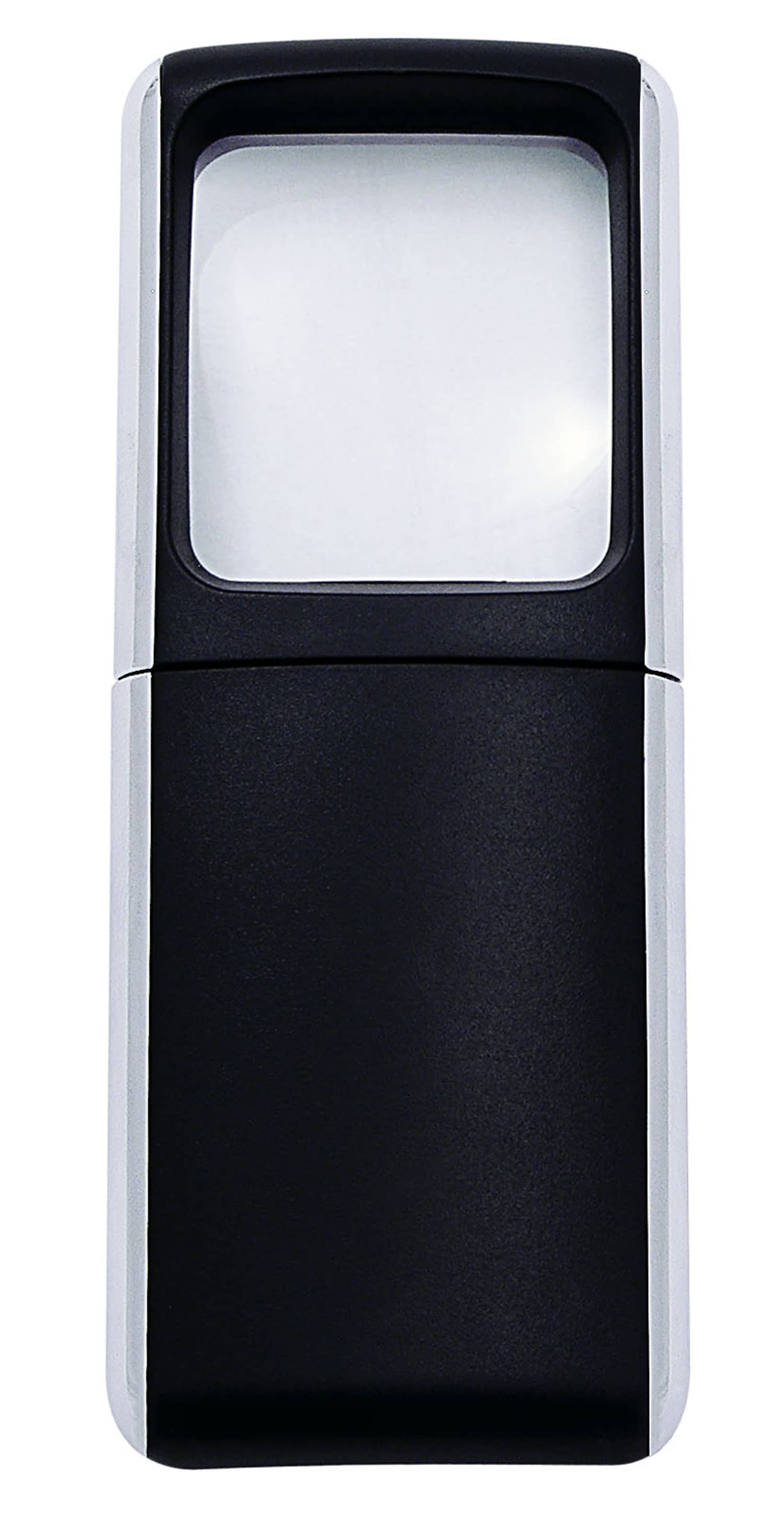 WEDO Rechtecklupen mit LED-Beleuchtung, schwarz. Das extrahelle weiße LED-Licht wird durch einfaches Hochziehen des Gehäuse-Oberteils eingeschaltet. Die ca. 3,5 x 3,8 cm große Kunststofflinse vergrößert 3-fach. Das elegante, flache Gehäuse mit mattierter Kunststoffoberfläche liegt leicht und angenehm in der Hand. Maße: ca. 11,8 x 4,7 x 1,4 cm, Gewicht: 48 g. Lieferung auf SB-Karte, inkl. 2 x 3V CR1220-Batterien.