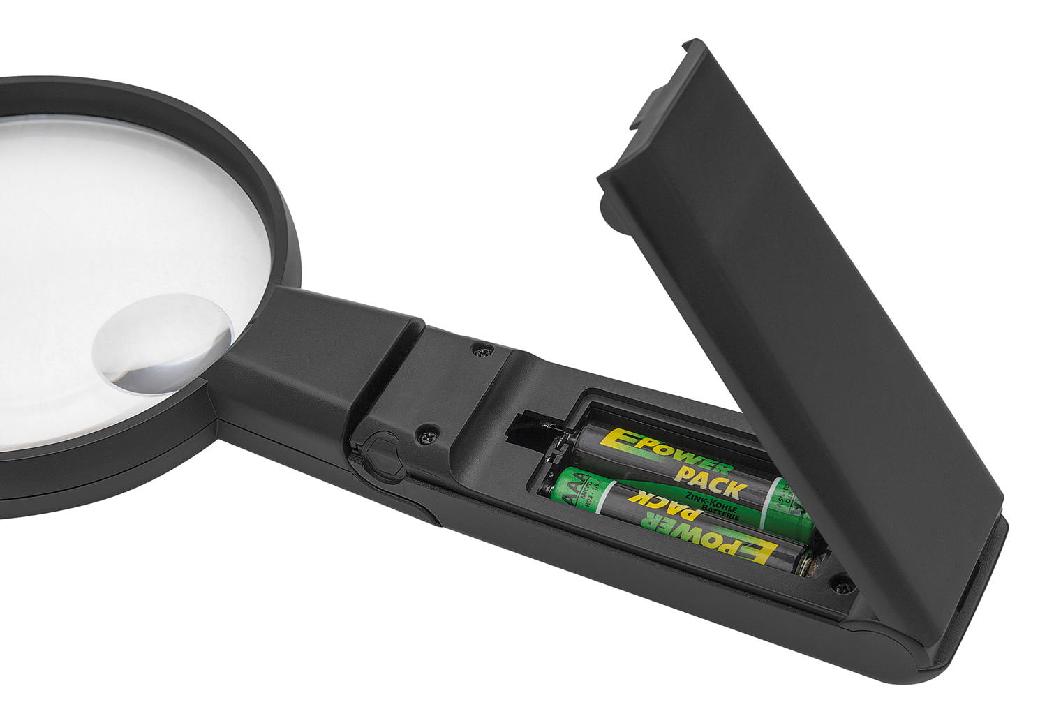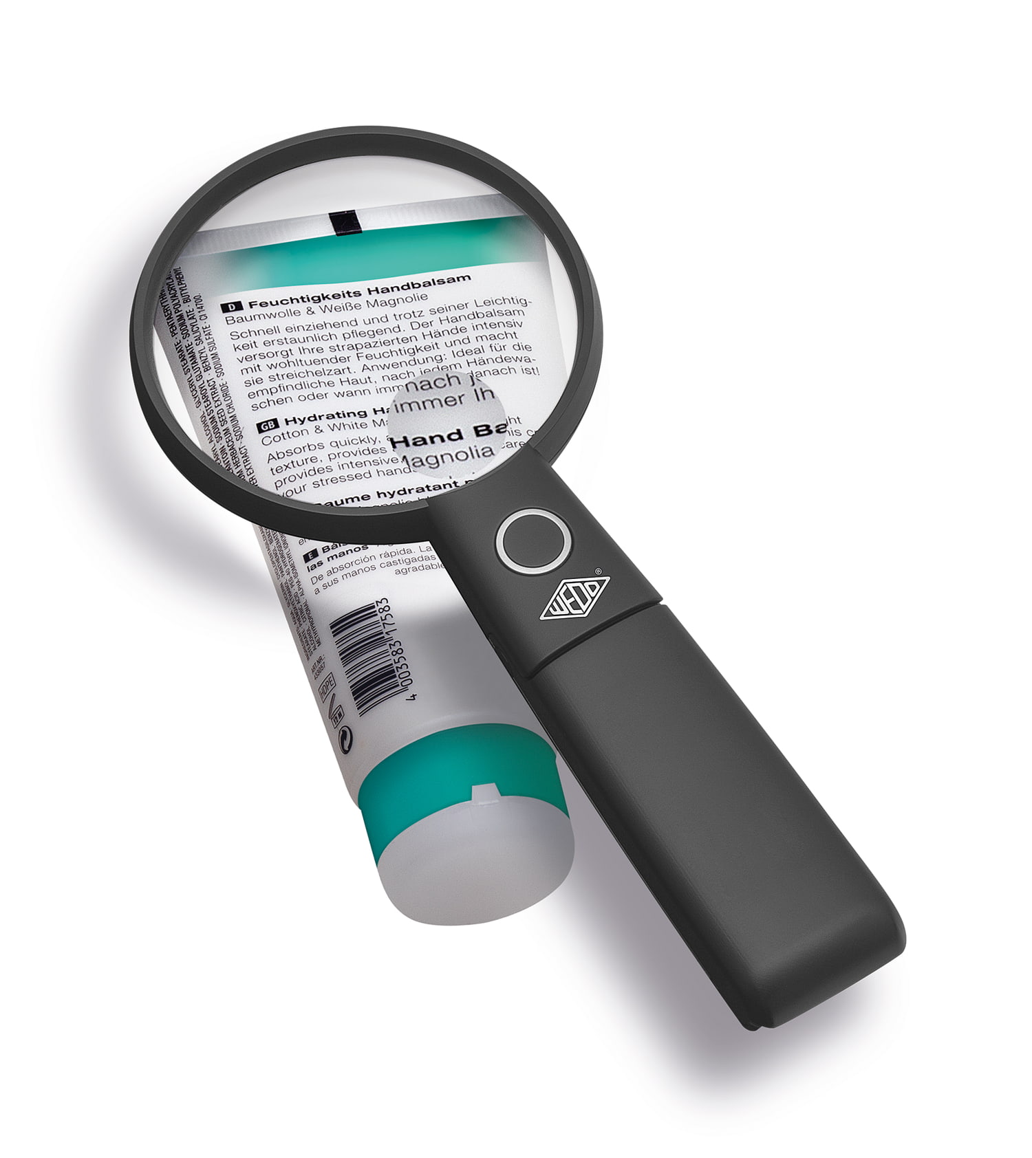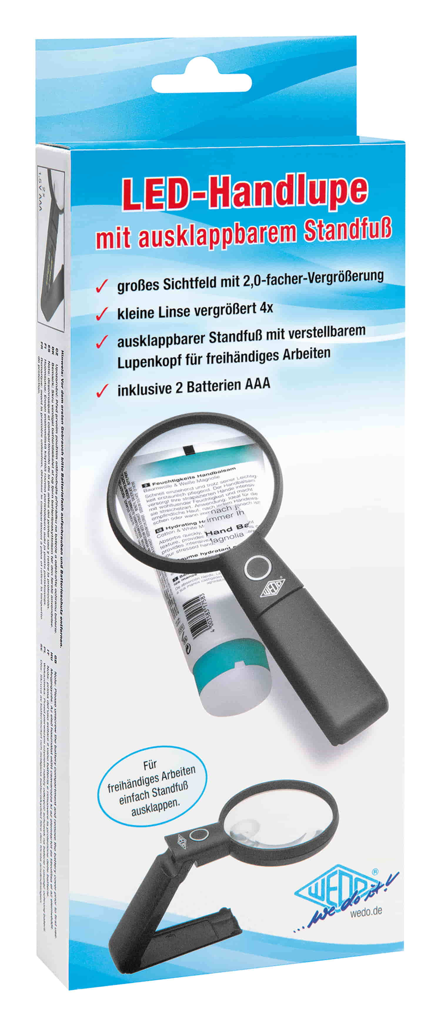 WEDO LED-Handlupe mit ausklappbarem Standfuß und verstellbarem Lupenkopf. Diese praktische Lupe mit großem Sichtfeld und LED-Beleuchtung ist Hand- und Tischlupe in einem. Die hochwertige Acrylglaslinse mit 9 cm Durchmesser vergrößert 2,0-fach, die kleine Zusatzlinse mit 2,5 cm Durchmesser 4-fach. Ideal für Haushalt und Hobby. Alles Kleingedruckte, wie Inhaltsstoffe auf Verpackungen, Anwendungshinweise, Packungsbeilagen u.ä., wird wieder klar und deutlich lesbar. Das zuschaltbare LED-Licht sorgt auch bei Dunkelheit für eine optimale Ausleuchtung. Für freihändiges Arbeiten einfach Standfuß ausklappen und den Lupenkopf in den gewünschten Winkel einstellen. So sind auch filigranen Bastel- und Handarbeiten präzise möglich. Maße: ca. 22,3 x 9,7 x 2,2 cm, Lieferung inkl. 2 x 1,5 V AAA Micro-Batterien im attraktiven SB-Karton.