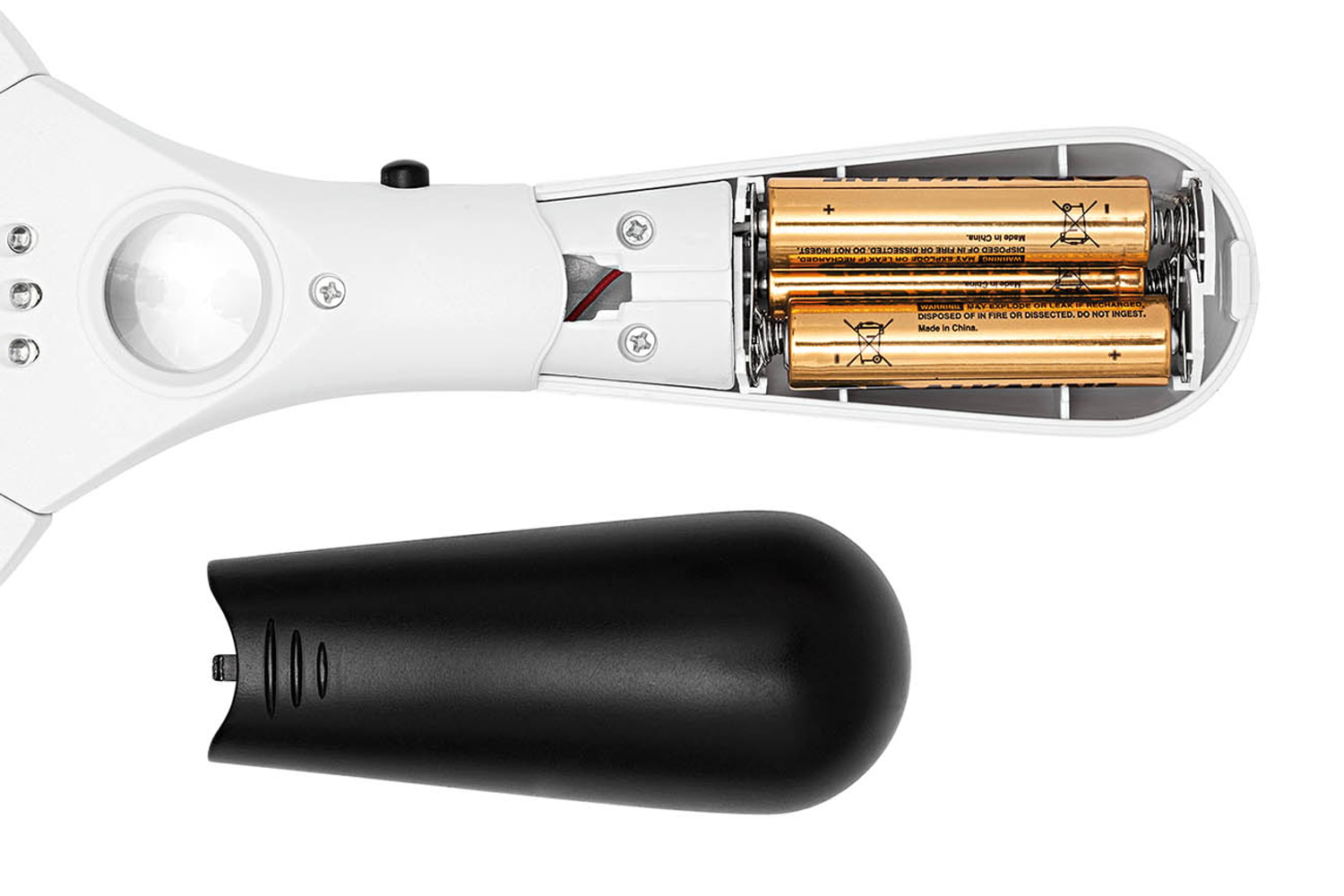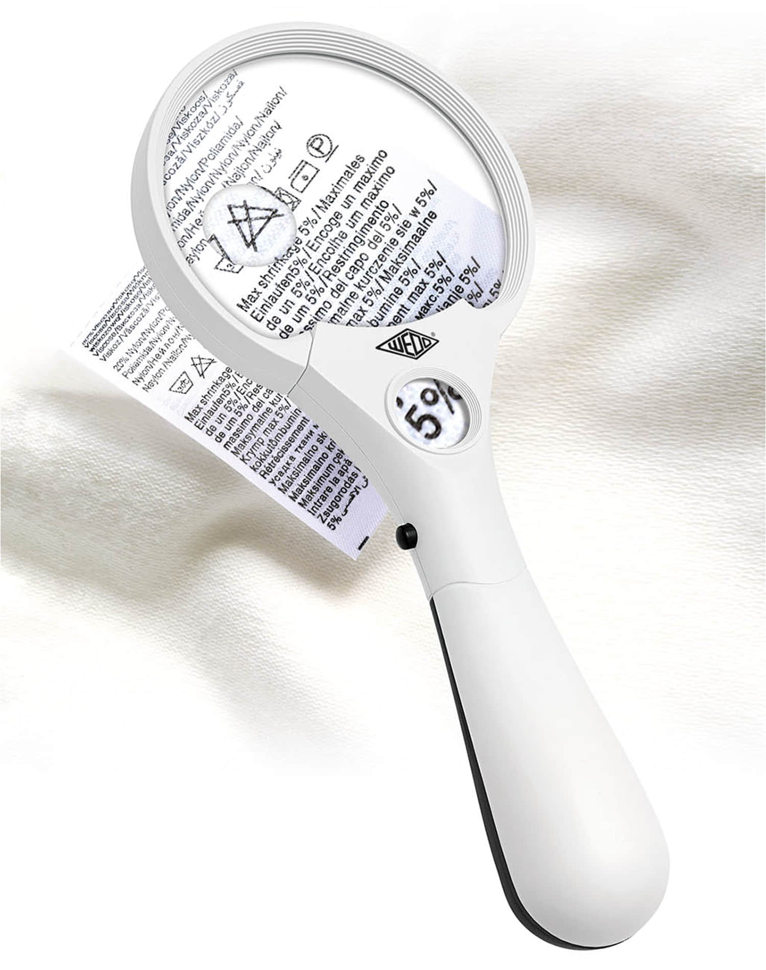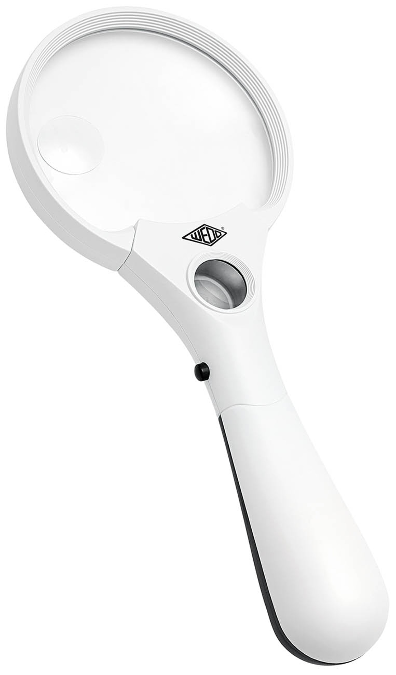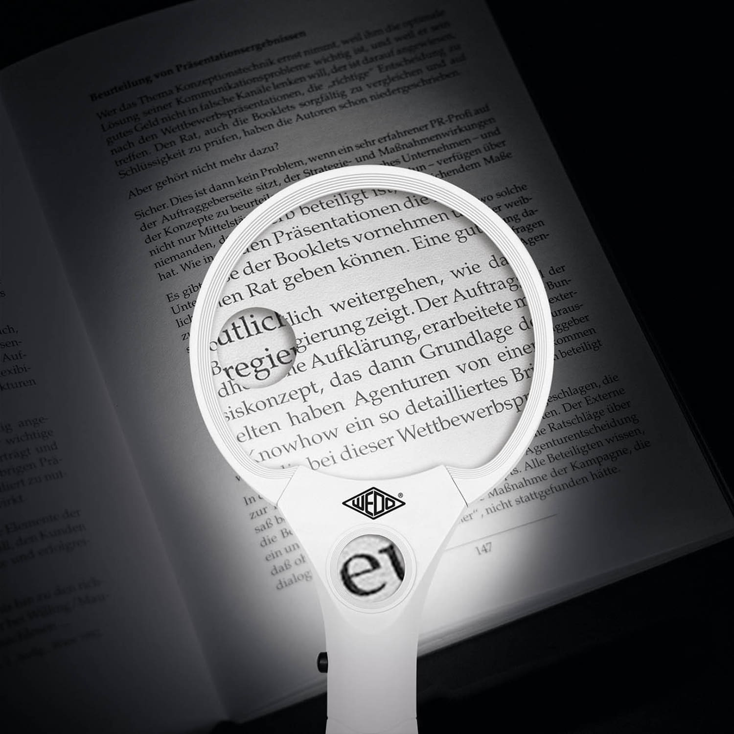 WEDO PROFI-Lupe mit 3 LEDs, Linsen-Durchmesser 9 cm, Vergrößerung 2,5x, 4,5x und 12x, inkl. Batterien. Leichte Leselupe mit ergonomischem Handgriff, großem Sichtfeld und 3 LEDs. Die hochwertige Acryllinse mit 9 cm Durchmesser vergrößert 3-fach, die beiden Zusatzlinsen mit 2 cm Durchmesser vergrößern 4,5x und 12x. Ideal für Haushalt und Hobby. Alles Kleingedruckte, wie Inhaltsstoffe auf Verpackungen, Anwendungshinweise, Packungsbeilagen u.ä., wird wieder klar und deutlich lesbar. Das zuschaltbare LED-Licht hellt den Text auf und sorgt auch bei Dunkelheit für eine optimale Ausleuchtung. Farbe: weiß/schwarz, Maße: ca. 22,4 x 9,5 x 3,5 cm, Gewicht inkl. Batterien: ca. 138 g, Lieferung inkl. 3 x 1,5 V AAA Micro-Batterien im attraktiven SB-Karton.