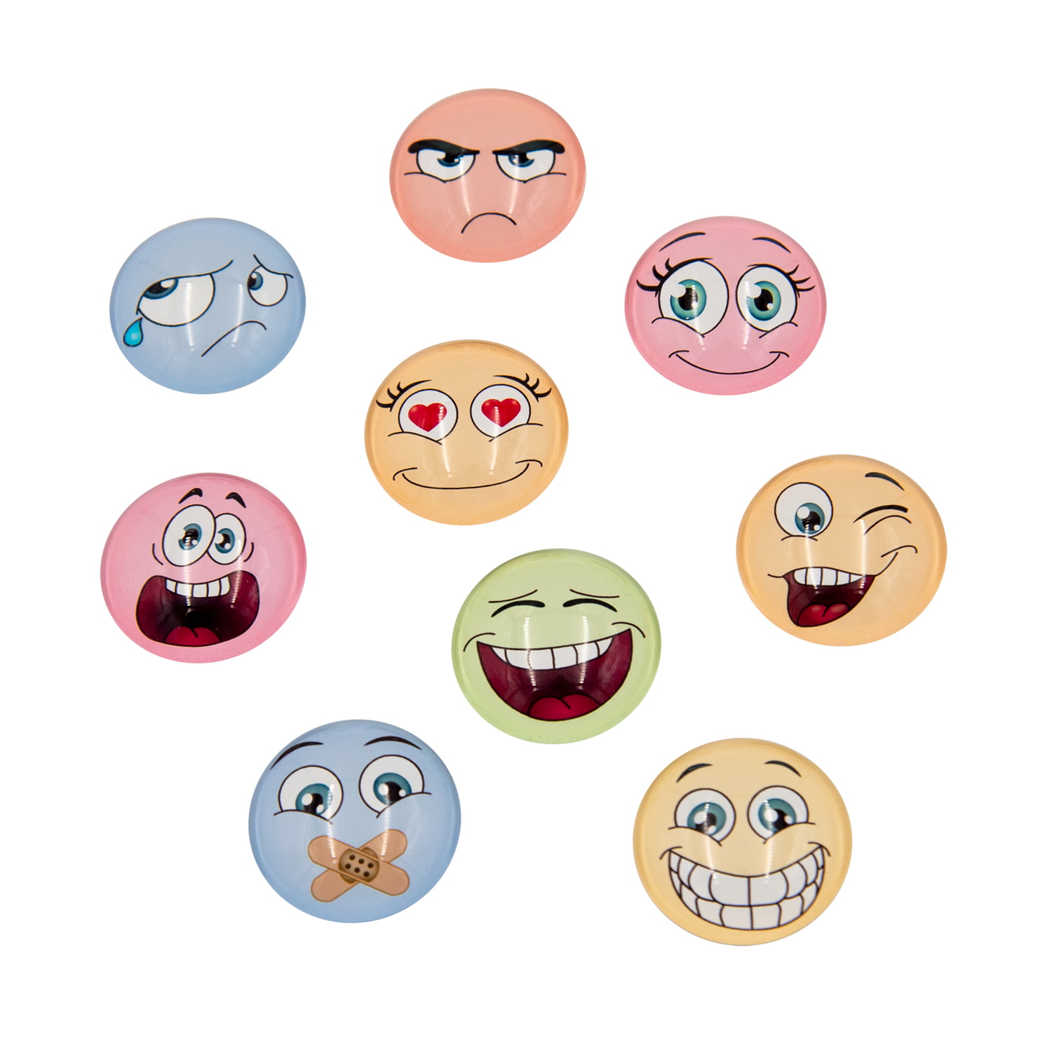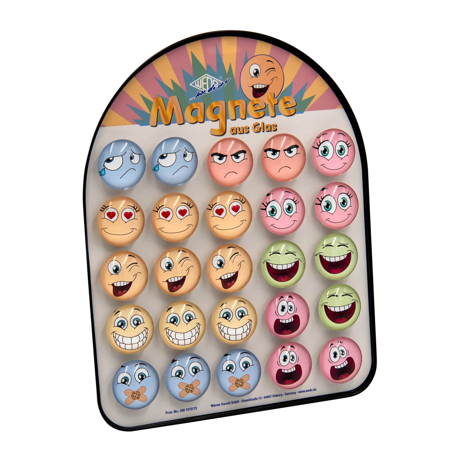 WEDO Magnete aus Glas, rund und pastellfarbig. Die coolen Gesichter der WEDO-Glasmagente liegen voll im Trend! Die leicht gewölbte Form erzeugt einen 3D-Effekt, der die dargestellten Emotionen zu echten Hinguckern macht. Ausgestattet mit einem starken Magneten sorgen sie dafür, dass Ihre Notizen dekorativ auf allen metallischen Oberflächen, wie Kühlschrank, Magnettafeln etc. haften bleiben. Nicht geeignet für Glasmagnetboards. Magnet-Durchmesser: ca. 35 mm. Die Magnete mit 9 verschiedenen Motiven werden farbig sortiert zu 25 Stück - mit Einzel-EAN ausgezeichnet - auf einer Metalltafel geliefert, die wie ein Bilderrahmen aufgestellt werden kann. Maße der Metalltafel (aufgestellt): ca. 22,3 x 1,8 x 27,0 cm.
