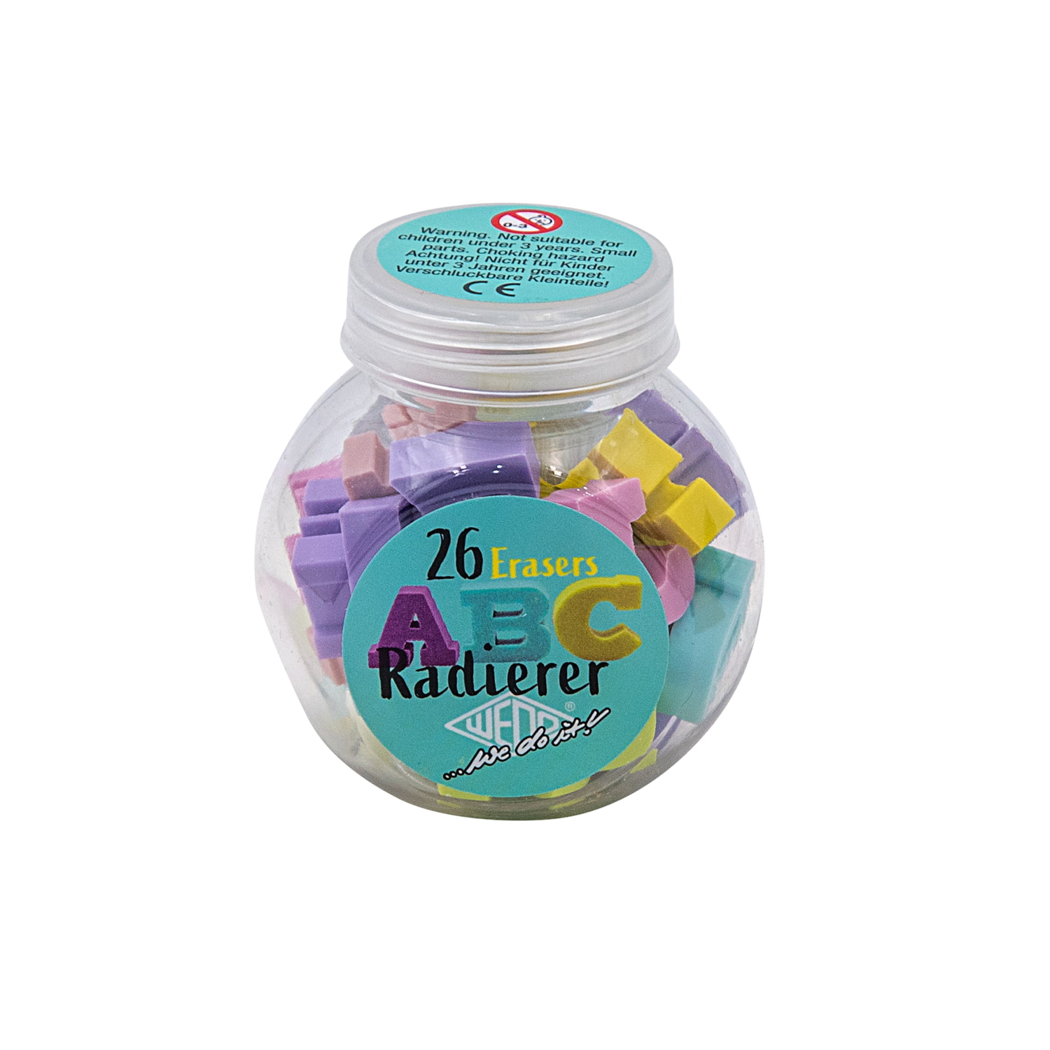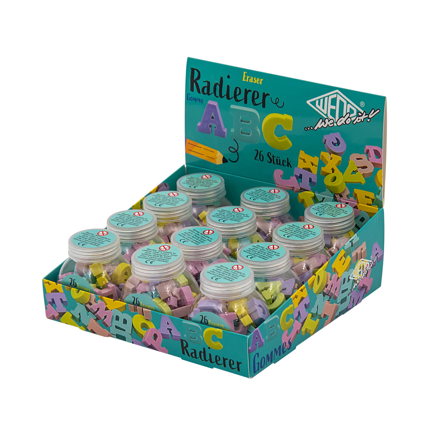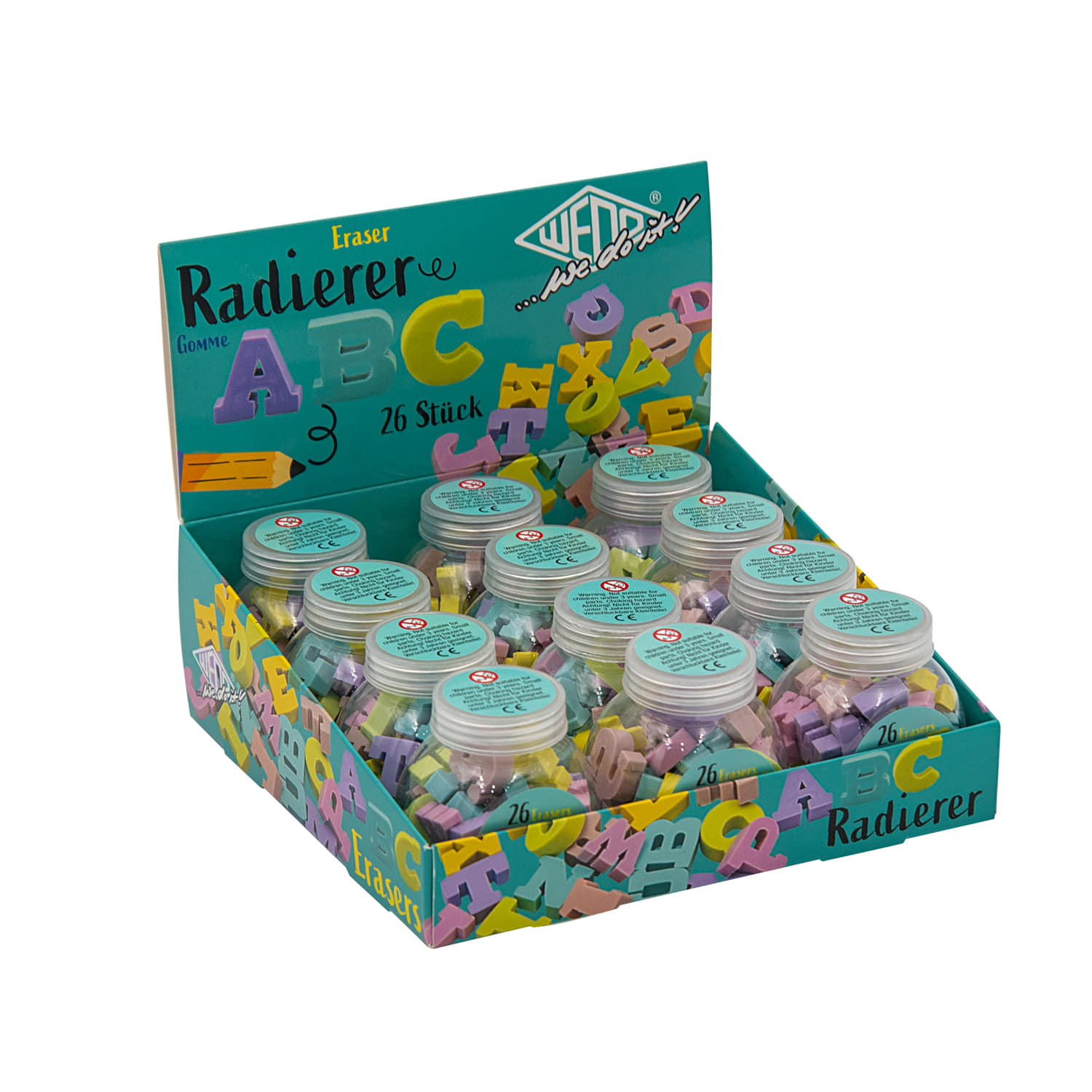 WEDO ABC-Radierer in Pastellfarben. Das ganze ABC mit seinen 26 Buchstaben als kleine Miniradierer befindet sich in einer transparenten Kunststoffdose mit Schraubverschluß und wartet darauf, kleine Fehler wegzuradieren. Prima um Buchstaben und kurze Worte zu üben. Unsere Radierer sind PVC-, phtalath- und latexfrei. Maße Dose: ca. 5,30 x 4,00 x 5,90 cm. Im Display enthalten sind 12 Dosen mit jeweils 26 Radierern. Display Maße: 16,60 x 16,20 x 13,80 cm (aufgestellt). Achtung: Nicht für Kinder unter 3 Jahren geeignet. Enthalten sind verschluckbare Kleinteile.