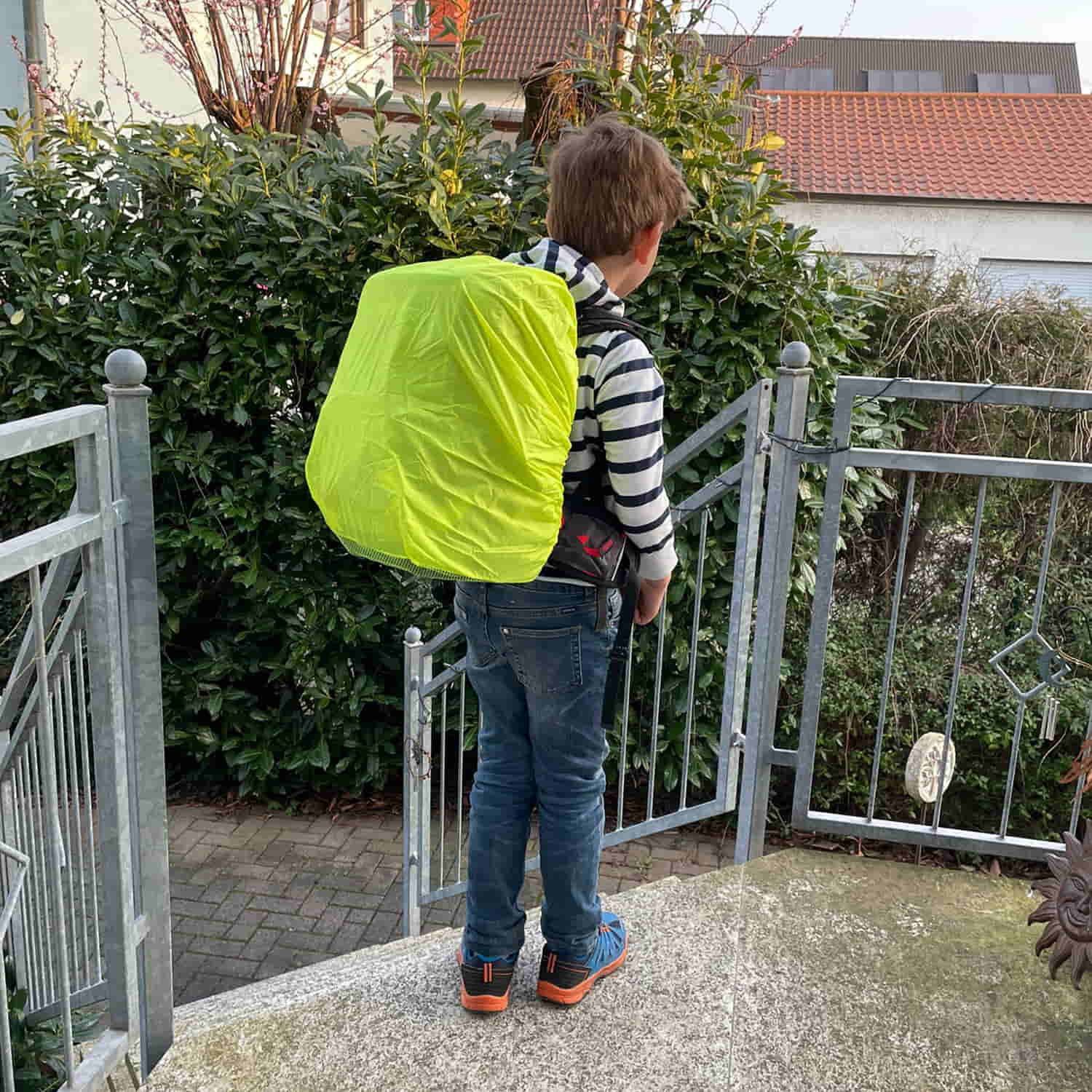 WEDO Regenhülle für Schulranzen. Praktischer Wetterschutz aus Polyester für Schulranzen und Schulrucksäcke bis zu einer max. Größe von 50 x 50 cm. Durch das eingearbeitete Netz am Boden wird der Reflexionsstreifen nicht verdeckt und bleibt voll funktionsfähig. Das Netz und das leuchtende Neongelb bieten somit auch erhöhte Verkehrssicherheit. Einzeln verpackt im Polybeutel mit EAN-Auszeichnung.