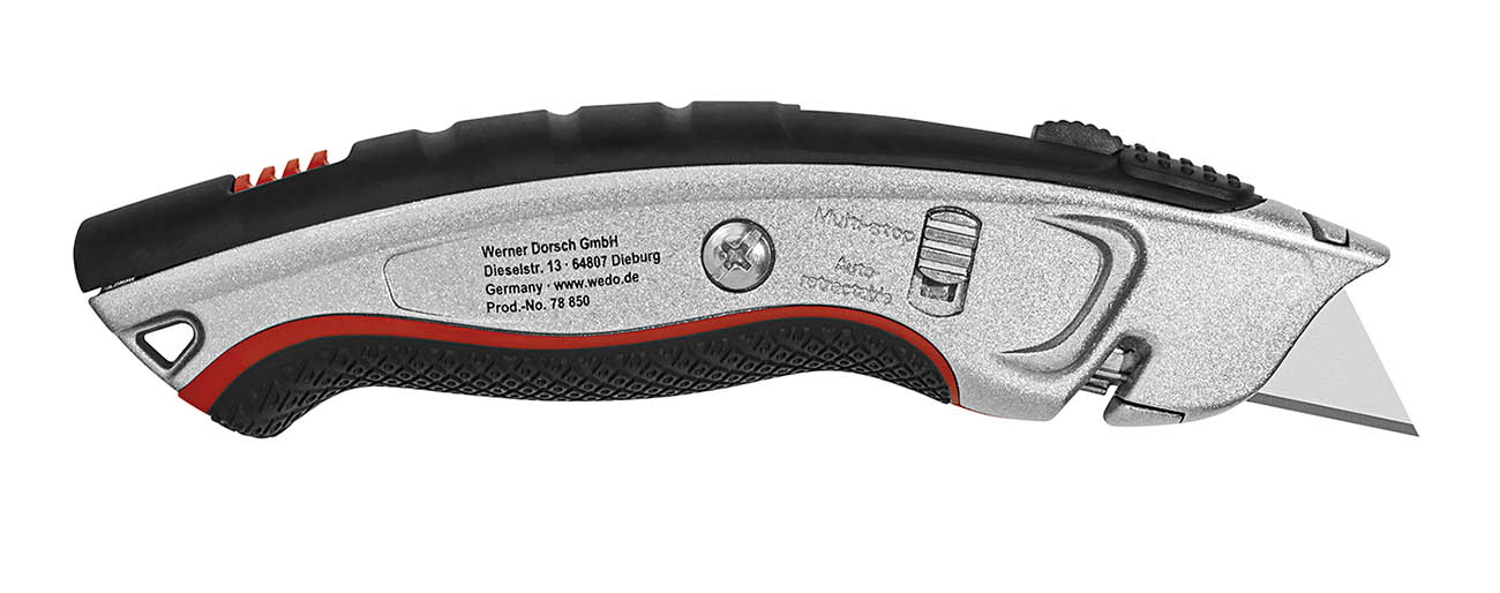 WEDO Safety-Cutter Profi Plus - Sicherheit durch automatischen Klingenrückzug. Die Klinge ist federbelastet und zieht sich automatisch zurück, sobald sie keinen Kontakt mehr mit dem Schneidegut hat (Schieber während des Schneidens nicht festhalten). Die Klinge kann aber auch von automatischem Klingenrückzug auf eine Multi-Stop-Rasterautomatik umgeschaltet werden. Klingenaustritt bis 25 mm. Der ergonomisch geformte Metallgriff mit gummierter Griffzone liegt sicher in der Hand. Durch die Positionierung des Klingenschiebers auf dem Messerrücken kann der Cutter sowohl von Rechts- als auch von Linkshändern benutzt werden. TÜV/GS-geprüft. Einfacher Klingenwechsel ohne Hilfsmittel. Mit integriertem Ersatzklingen-Magazin und Kordelschneider. Maße: ca. 18,0 x 3,0 x 4,5 cm, Gewicht: 220 g, Farbe: silber/schwarz. Lieferung mit 5 Trapez-Ersatzklingen im integrierten Magazin.