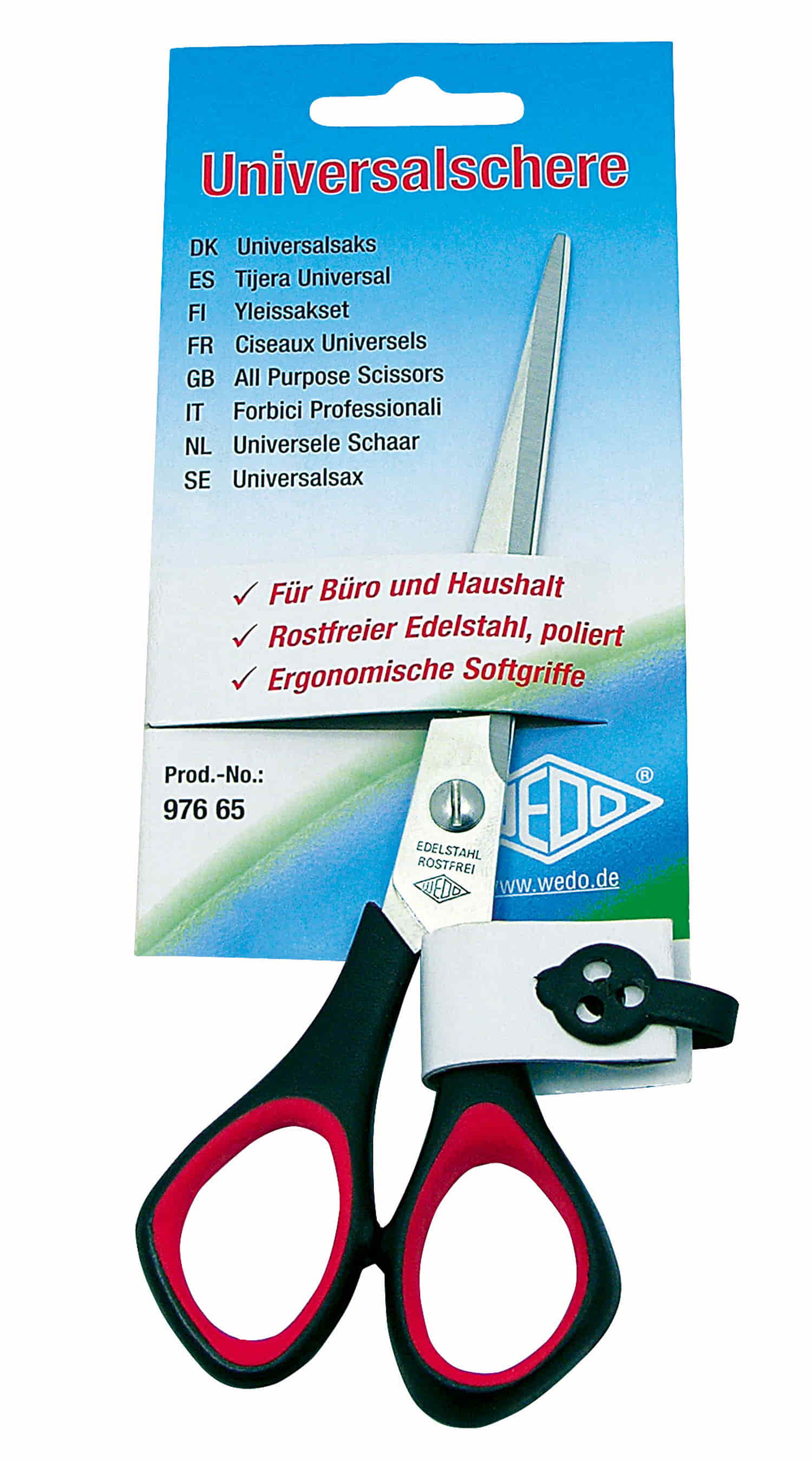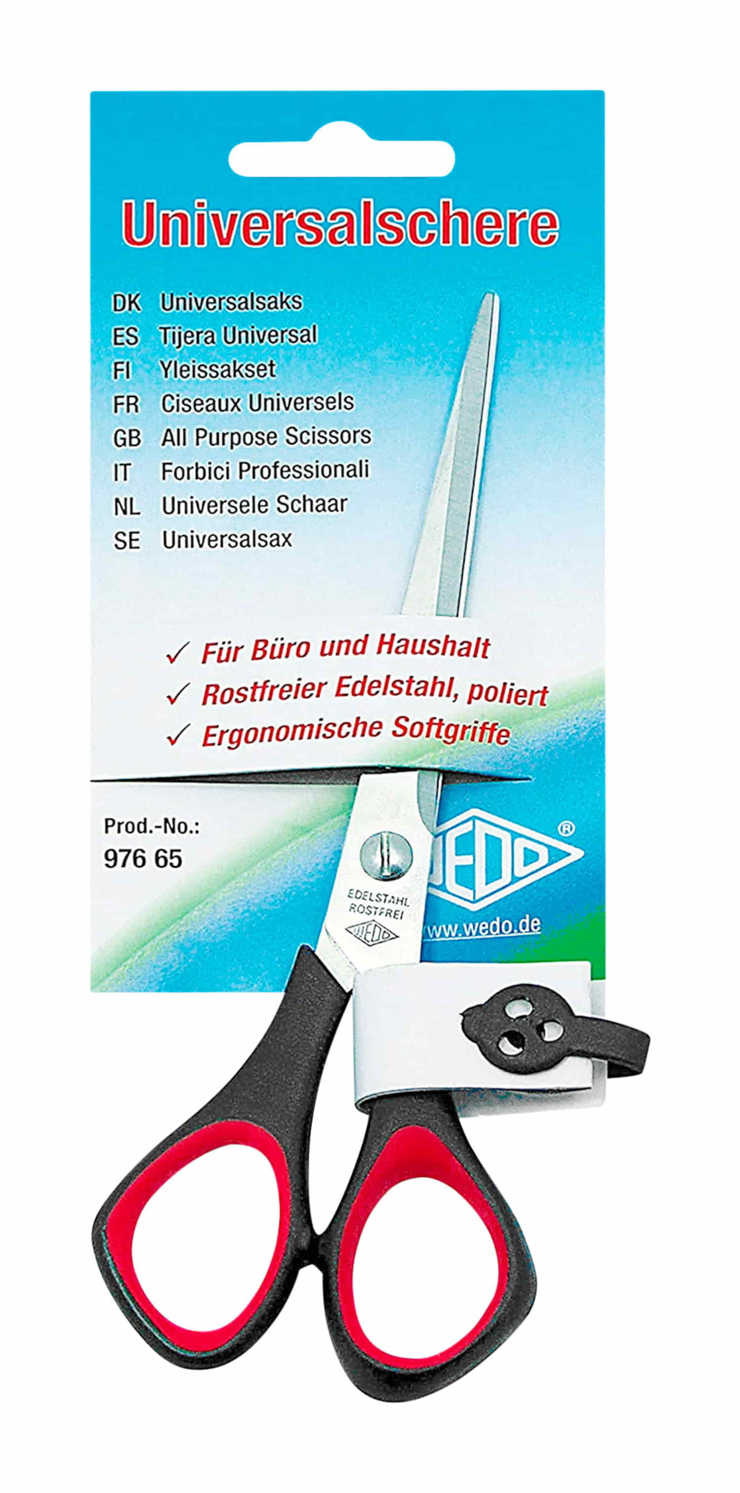WEDO Universalschere aus rostfreiem Edelstahl, poliert. Mit messerscharfer Schneide und leichtem Gang. Einzeln schlank zugeschliffene Scherenblätter, vorne spitz. Handgerecht geformter schwarzer Griff aus Kunststoff (PP) mit roten Soft-Einlagen, auf SB-Probierkarte. Länge: 16,0 cm.