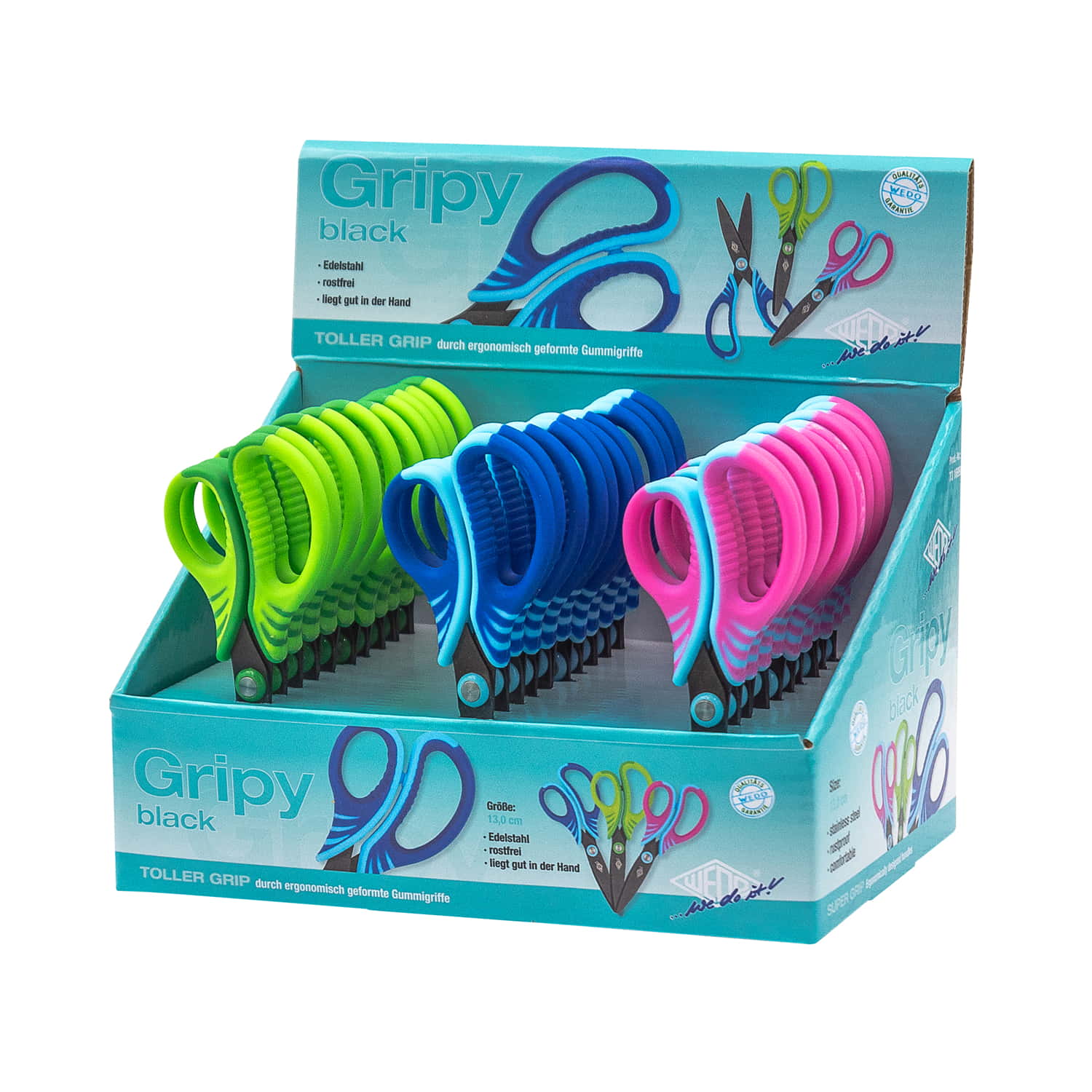 WEDO Bastelschere Gripy black, 13 cm. Die ergonomisch geformten Griffe mit Gummiprofil liegen einfach gut in der Hand und bieten sicheren Halt. Aus rostfreiem Edelstahl mit rund geschliffenem Scherenblatt mit Titanum gun Lackierung gefertigt. Im attraktiven Verkaufsdisplay mit 30 Scheren, farbig sortiert in pink, grün und blau.