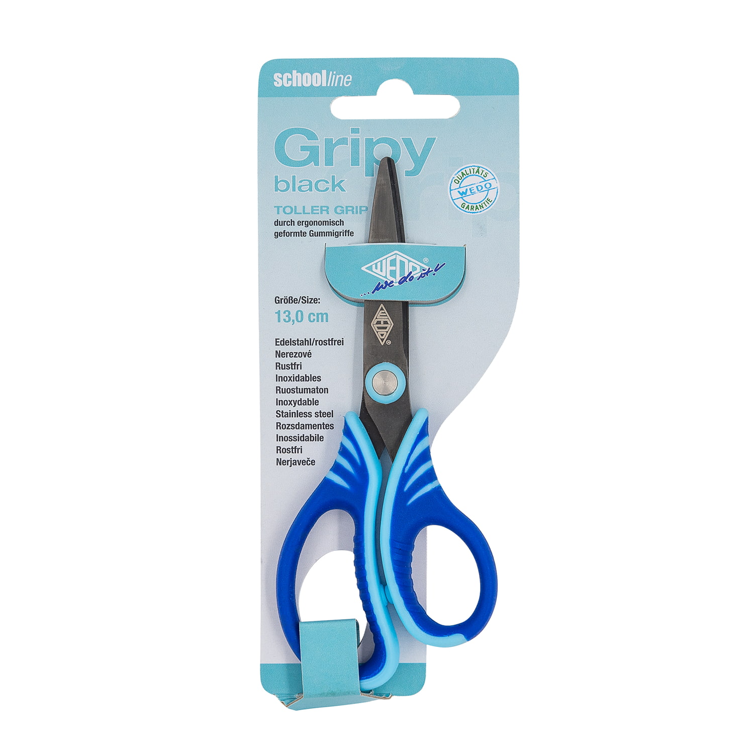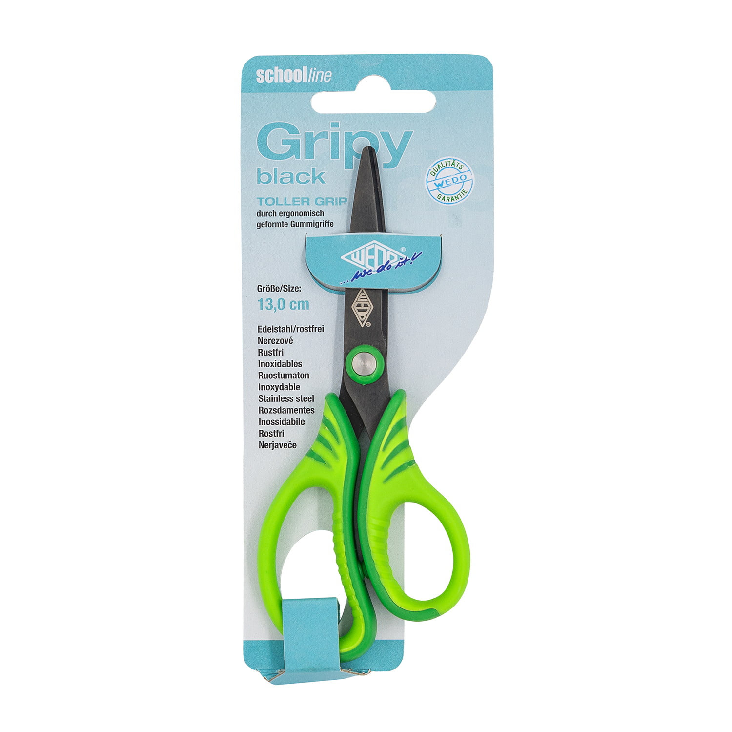 WEDO Bastelschere Gripy black, 13 cm. Die ergonomisch geformten Griffe mit Gummiprofil liegen einfach gut in der Hand und bieten sicheren Halt. Aus rostfreiem Edelstahl mit spitz geschliffenem Scherenblatt mit Titanum gun Lackierung gefertigt. Auf attraktiver SB-Scherenkarte, farbig sortiert in pink, grün und blau.