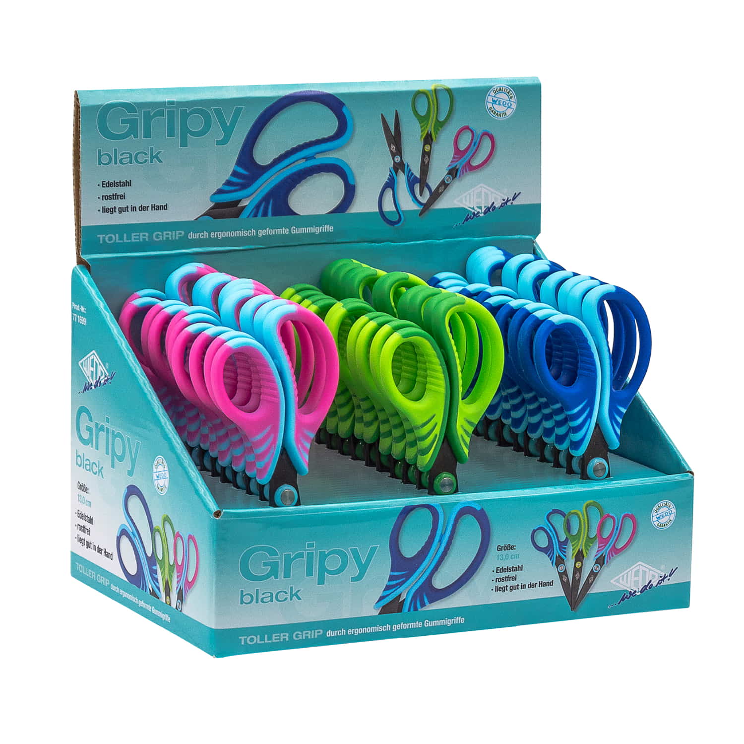 WEDO Bastelschere Gripy black, 13 cm. Die ergonomisch geformten Griffe mit Gummiprofil liegen einfach gut in der Hand und bieten sicheren Halt. Aus rostfreiem Edelstahl mit spitz geschliffenem Scherenblatt mit Titanum gun Lackierung gefertigt. Im attraktiven Verkaufsdisplay mit 30 Scheren, farbig sortiert in pink, grün und blau.