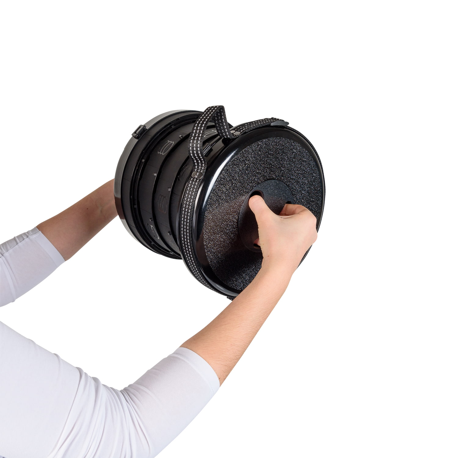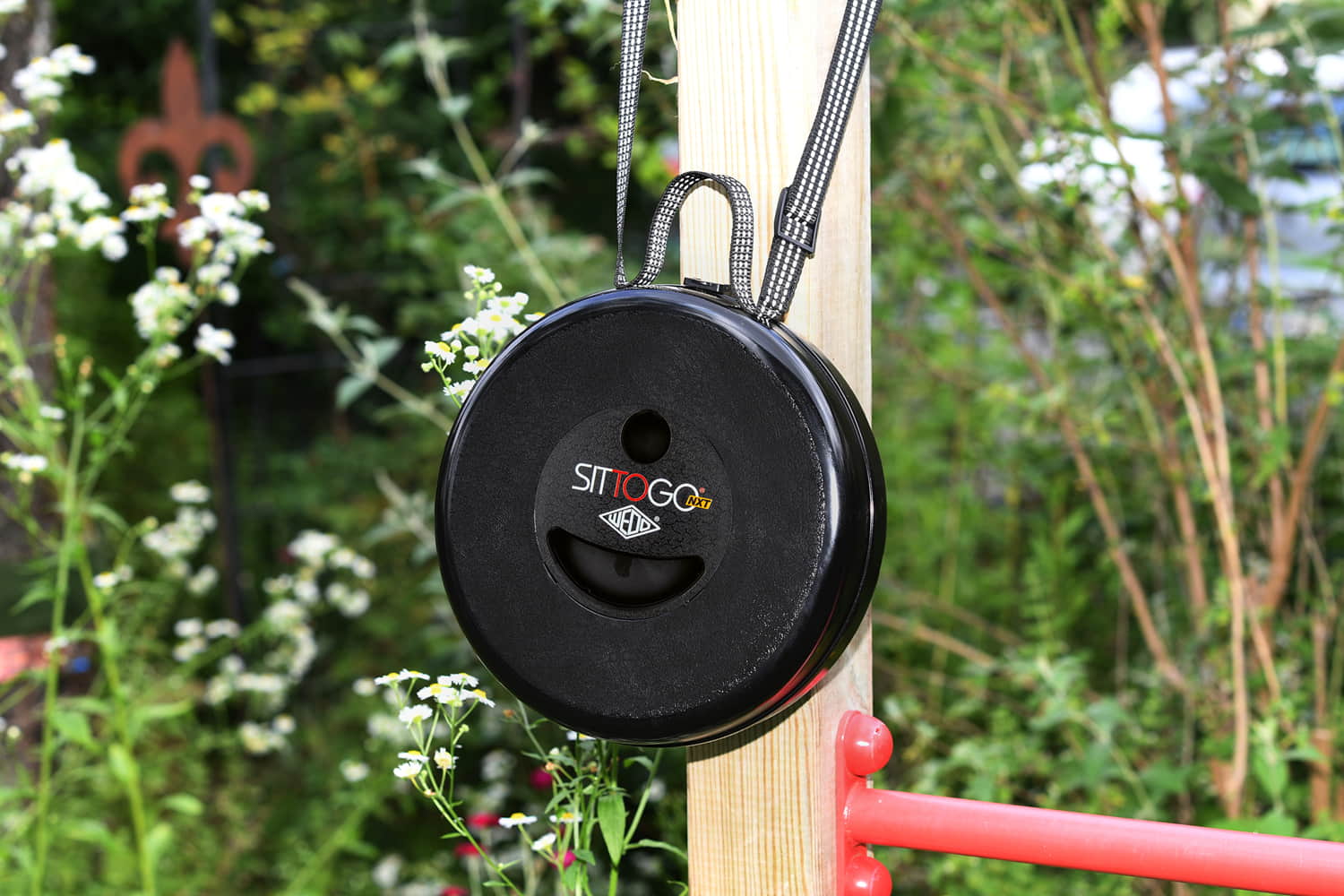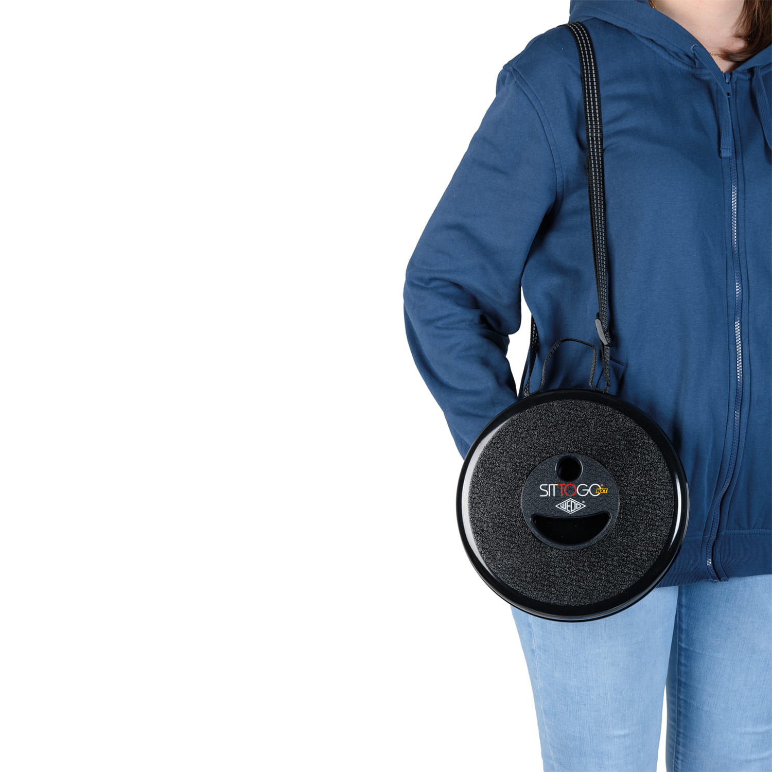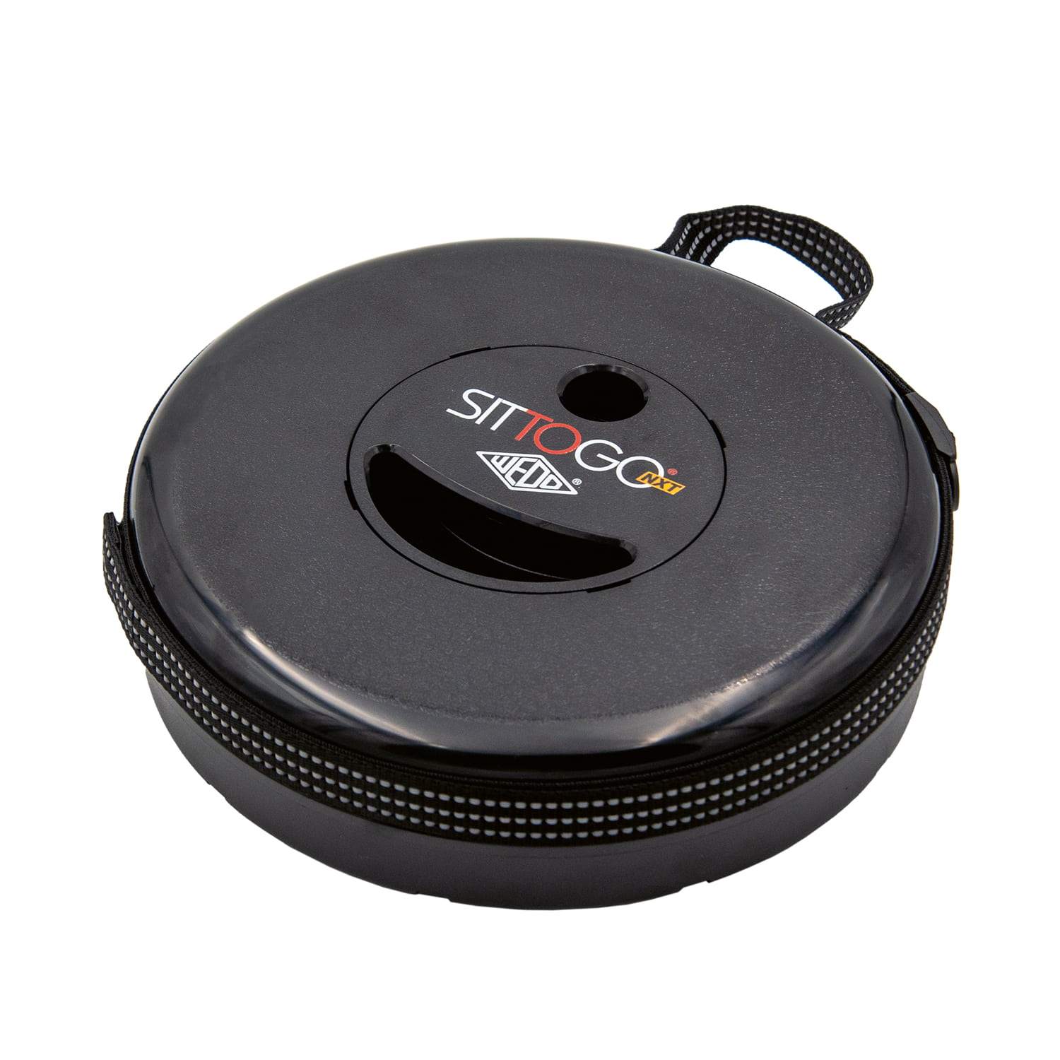 WEDO SITTOGONXT, mobiler Teleskop-Hocker, flach zusammenschiebbar, mit verstellbarem reflektierenden Umhängegurt zum Mitnehmen. Ziehen, drehen und der SITTOGO NXT steht auch in unebenem Gelände sicher und zuverlässig, in der Höhe variabel von 7 - 42 cm, ø 26,2 cm. Material: PP. Gewicht: 1,066 kg, max. Tragkraft: 150 kg. Gehäusefarbe: schwarz, TÜV- und GS-geprüft.