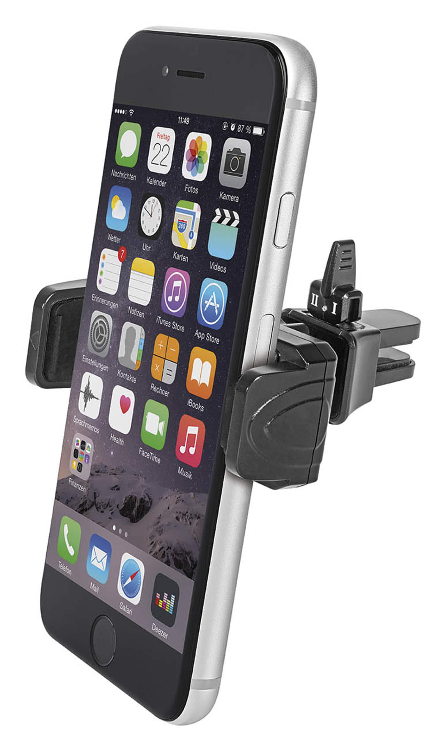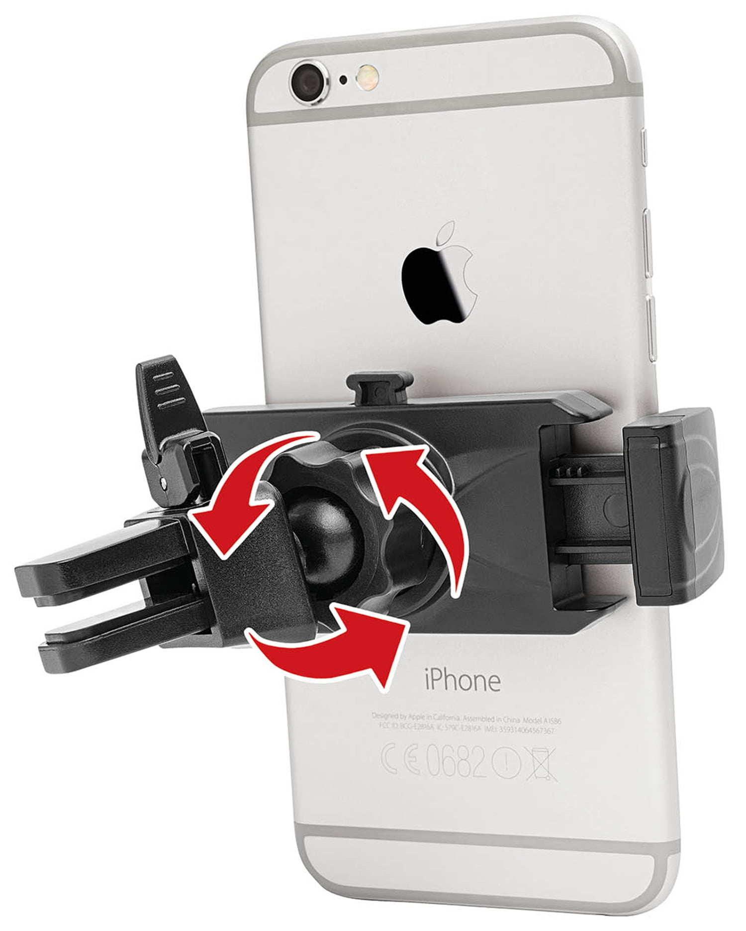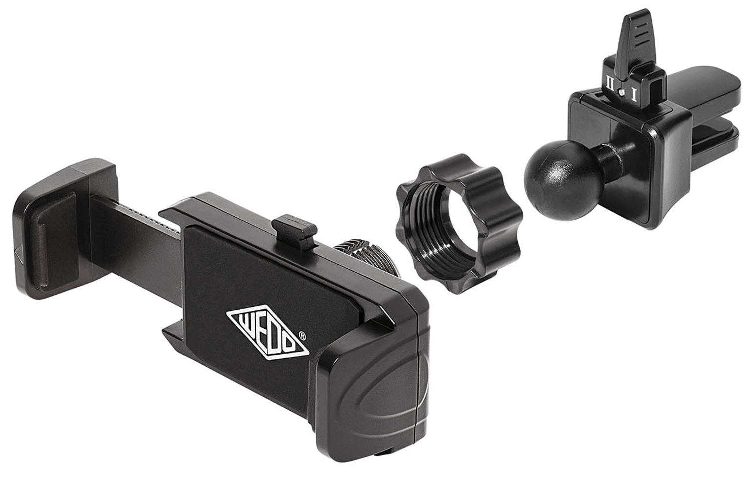 WEDO CLIP-IT plus - dreh- und schwenkbarer Smartphone-Klemmhalter für KFZ-Lüftungsschlitze. Die clevere Halterung für alle 4“-6“-Smartphones mit frei einstellbarem Blickwinkel dank 360°-Kugelgelenk! Schnell anzubringen – der gummierte Stecker mit Kippschalter lässt sich in 2 Stufen (1,5 - 2,5 mm und 2,5 - 3,5 mm) auf die Dicke der Lüftungslamelle einstellen und sorgt so für eine sichere und stabile Fixierung der Smartphone-Halterung. Die Soft-Touch-Bügel mit Rastermechanismus fest zusammendrücken, bis das Smartphone sicher fixiert ist. Mit Druck auf die Quick-out-Taste entriegeln sich die Klemmbügel und das Smartphone kann schnell und einfach entnommen werden. Der CLIP-IT plus hält markenunabhängig jedes Smartphone mit einer Breite von 5,5 – 8,5 cm sicher fest. Alle Funktionen des Smartphones sind frei zugänglich. Maße: 73 mm breit x 91 mm lang. Farbe: schwarz.