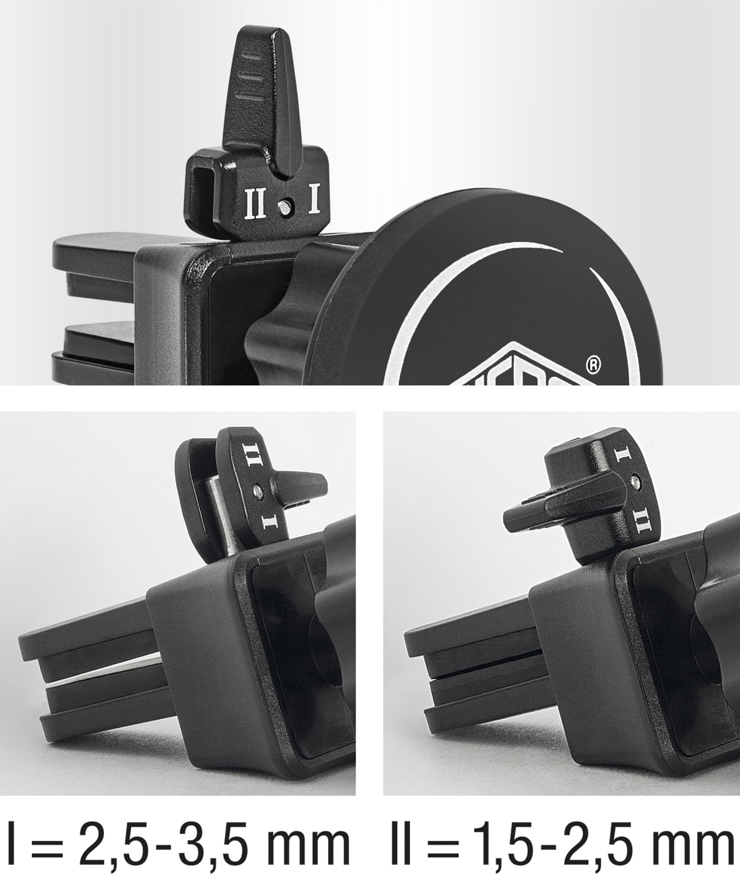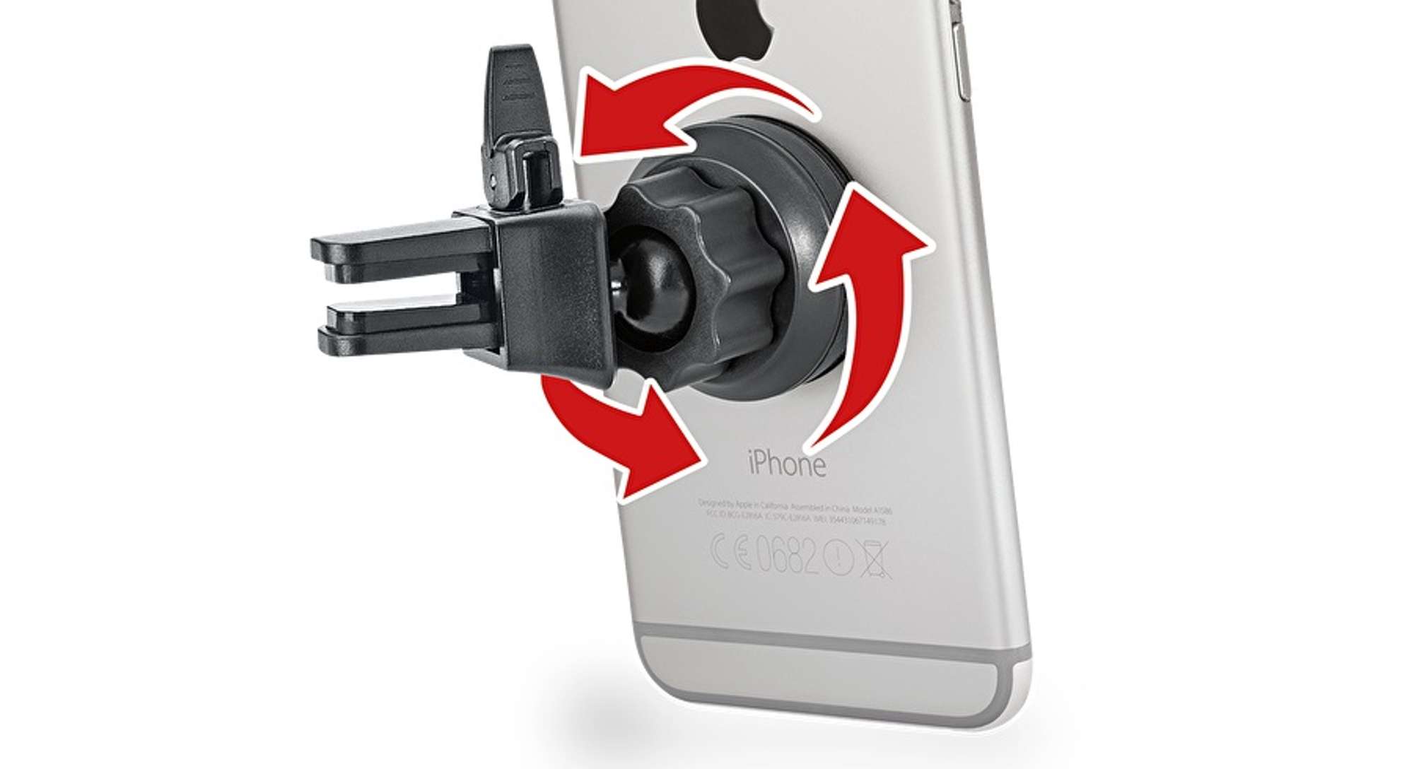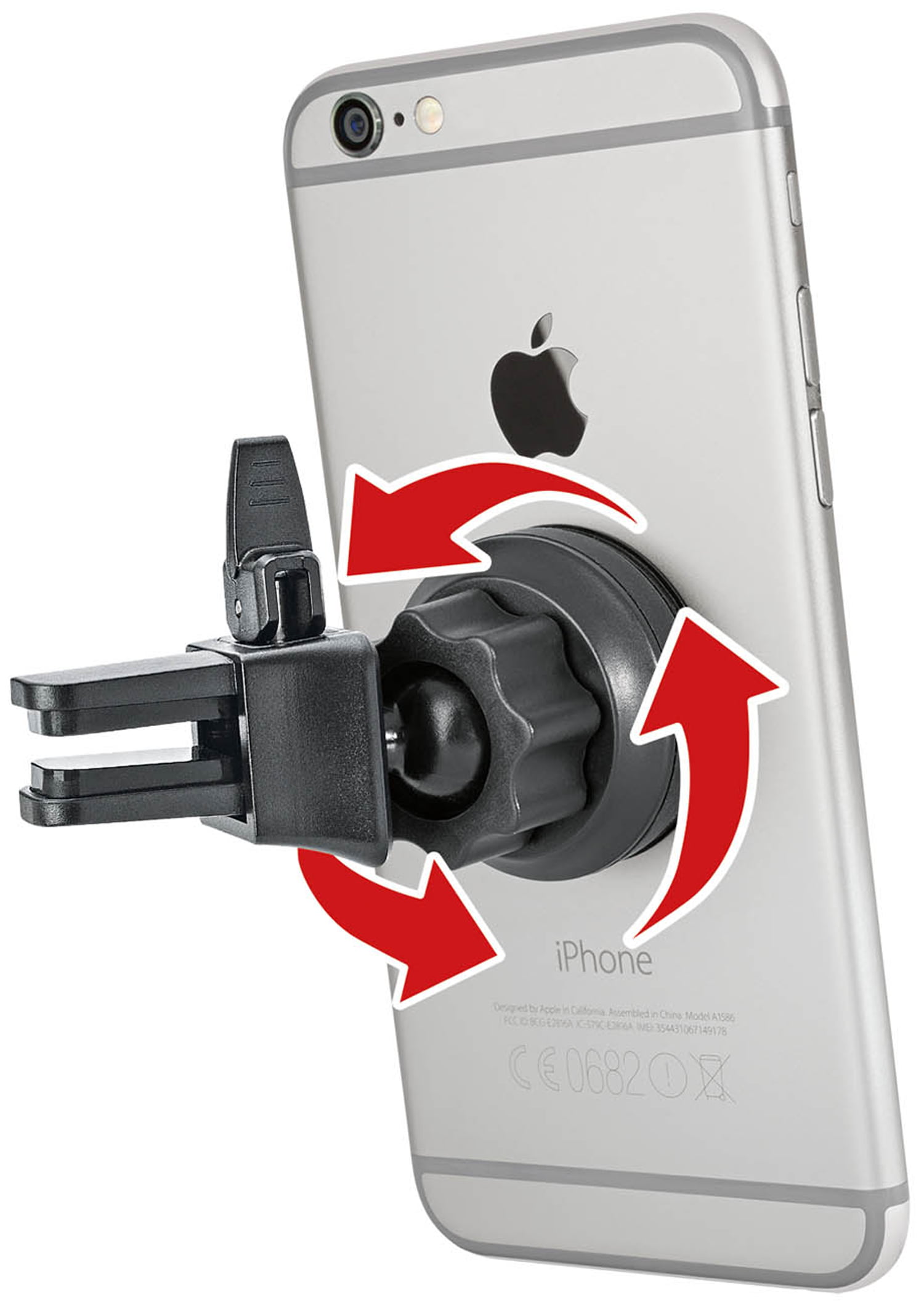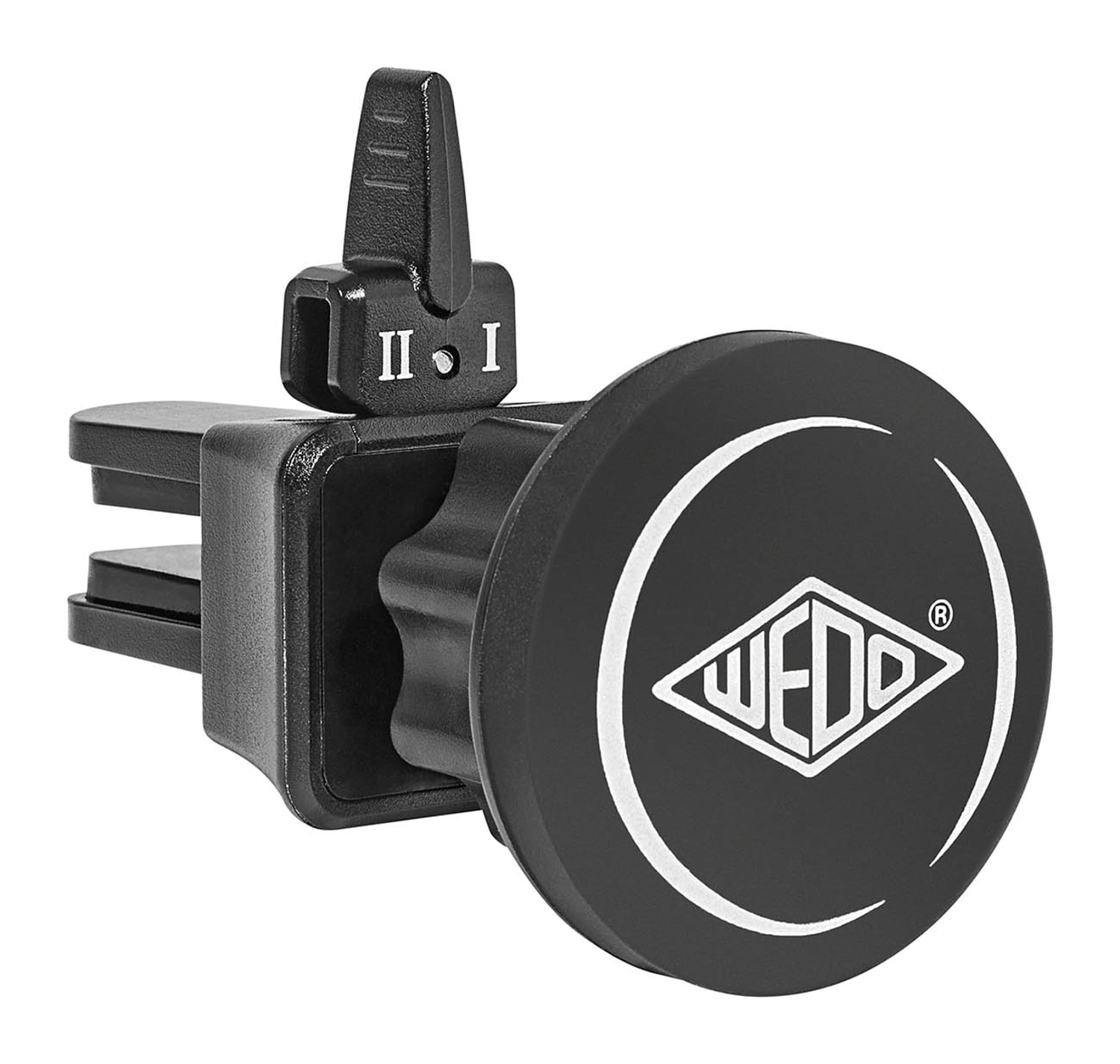 WEDO DOCK-IT, schwenkbarer Smartphone-Magnethalter für KFZ-Lüftungsschlitze. Die clevere Mini-Halterung für alle Smartphones mit frei einstellbarem Blickwinkel dank 360°-Kugelgelenk! Schnell anzubringen – der gummierte Stecker mit Kippschalter lässt sich in 2 Stufen (1,5 - 2,5 mm und 2,5 - 3,5 mm) auf die Dicke der Lüftungslamelle einstellen und sorgt so für eine sichere und stabile Fixierung der Smartphone-Halterung. Der starke Magnet mit Soft-Touch-Oberfläche hält jedes Smartphone in der gewünschten Position. Alle Funktionen des Smartphones sind frei zugänglich, auch das Laden während der Fahrt über ein USB-Ladegerät für Zigarettenanzünder ist möglich. Drei dünne Metallplättchen mit unterschiedlichen Fixierungsmöglichkeiten am Smartphone werden mitgeliefert: mit Gel-Pad-Haftung für rückstandsfreies Entfernen, selbstklebend oder ohne Klebstoff zum Einlegen zwischen Smartphone und Hardcase. Die Haftkraft des Gel-Pads lässt sich durch Säubern unter fließendem Wasser wieder reaktivieren (Oberfläche nicht abtrocknen oder abwischen). Magnethalter-Maße: Durchmesser 3,8 cm, Länge 6,5 cm, Farbe: schwarz. Hinweis zur Nutzung mit Samsung S4 und S4 Mini: Das im Lieferumfang enthaltene Metallplättchen unbedingt in größtmöglichem Abstand zum HALL-Sensor des Telefons montieren. Das verhindert, dass das S4 auf die Magnethalterung reagiert und in den Standby-Modus wechselt.