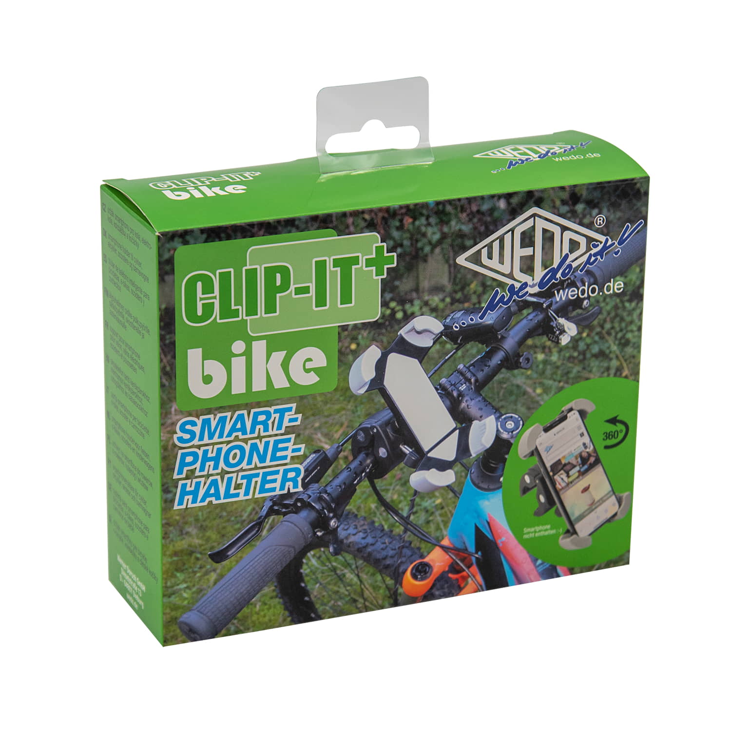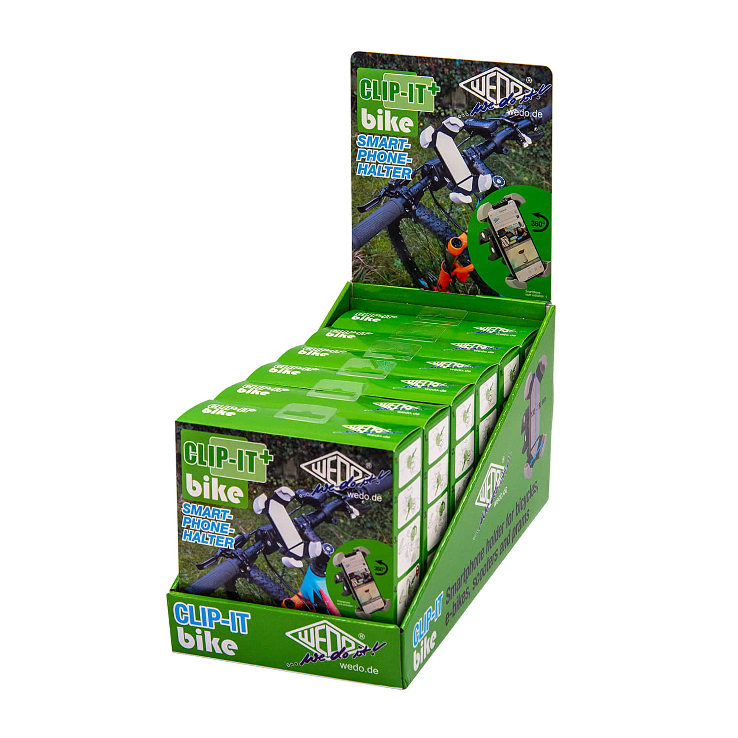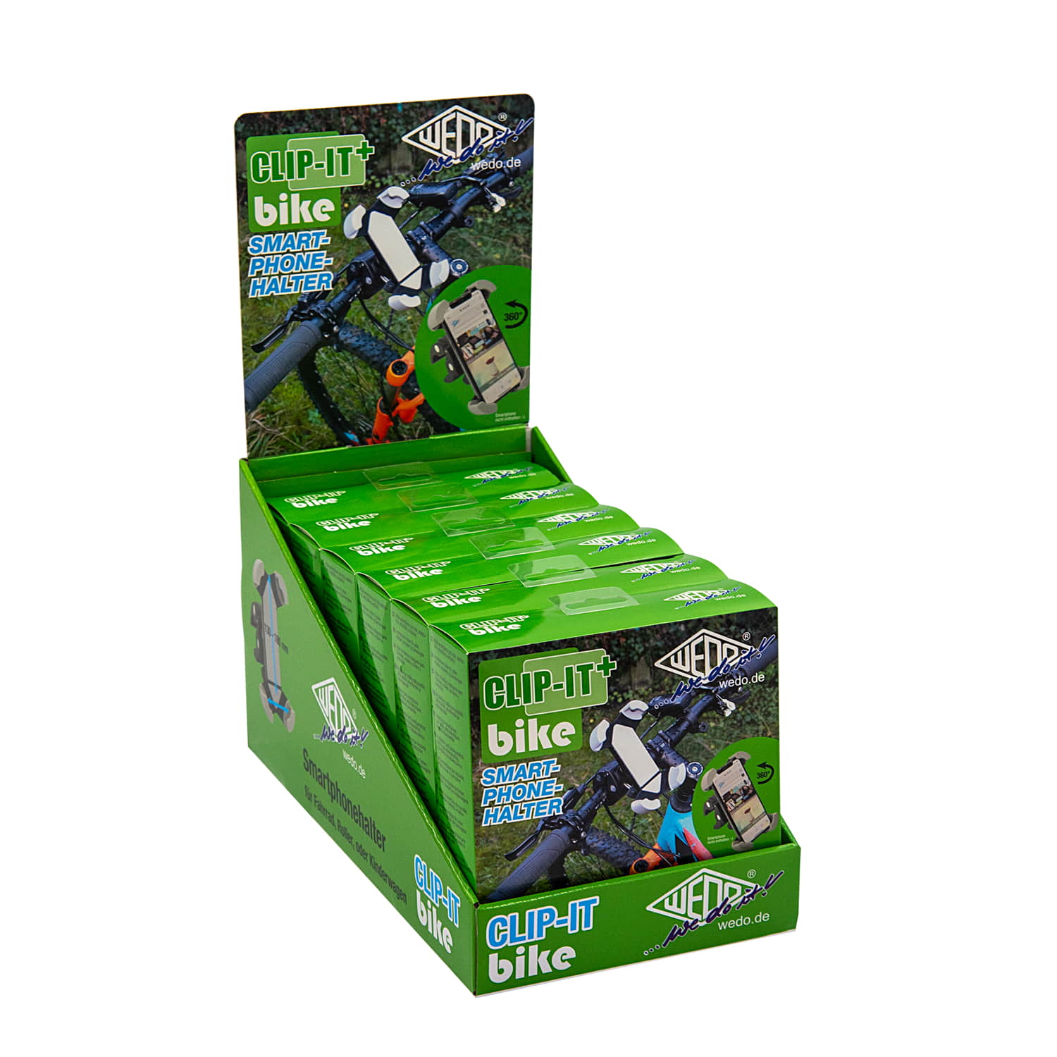 WEDO Smartphonehalter CLIP IT bike … der dreh- und schwenkbare Smartphone-Halter für Fahrrad- und Rollerlenker oder den Kinderwagengriff mit frei einstellbarem Blickwinkel dank 360°-Kugelgelenk! Schnell und flexibel anzubringen – an Griffe, Lenker oder Stangen mit einem Durchmesser von 18 bis 32 mm. Die stabile Klemme mit gummierter Innenseite sorgt mit einem Schraubgewinde mit breiter Stellschraube für eine bequeme, sichere und stabile Fixierung der Smartphone-Halterung. Ausgestattet mit gummiertem Soft-Touch-Bügel mit Rastermechanismus, die Quick-out-Taste auf der Rückseite entriegelt die Klemmbügel und das Smartphone kann schnell und einfach entnommen werden. Der CLIP-IT bike hält markenunabhängig jedes Smartphone mit einer Breite von 5,5 – 8,5 cm sicher fest. Alle Funktionen des Smartphones sind frei zugänglich. Maße Halter gesamt: 9,60 cm x 4,70 cm x 14,00 cm. Maße Klemmung: 7,90cm x 3,60 cm x 7,70 cm. Smartphonehalterung: Höhe von ca. 13,00 bis 18,50 cm x Breite 7,00 cm. Verpackt in Einzelkarton im kompakten 6er Display. Maße Einzelverpackung: 17 x 5,5 x 14 cm, Maße Display aufgestellt: 18 x 35,8 x 38 cm, geschlossen: 36,5 x 19,5 x 19 cm.