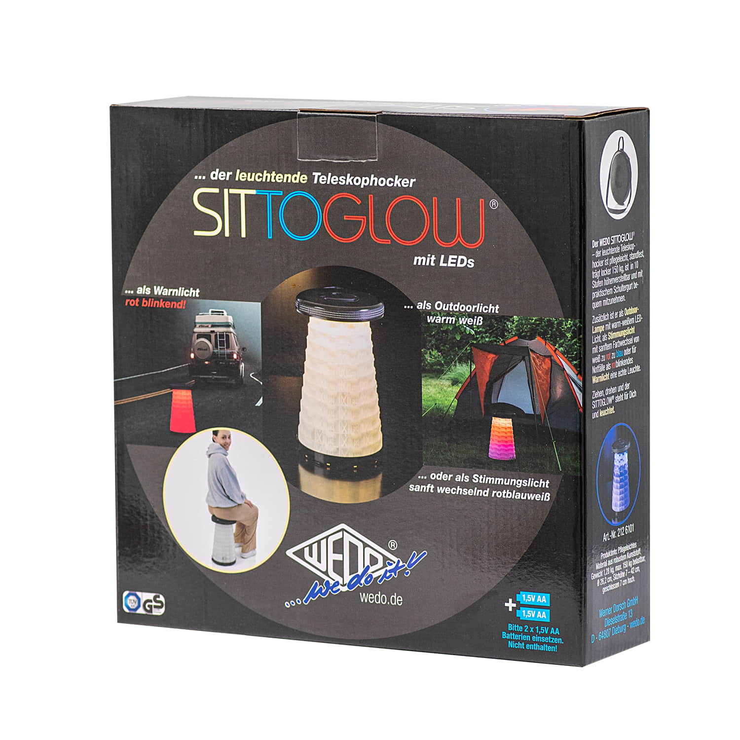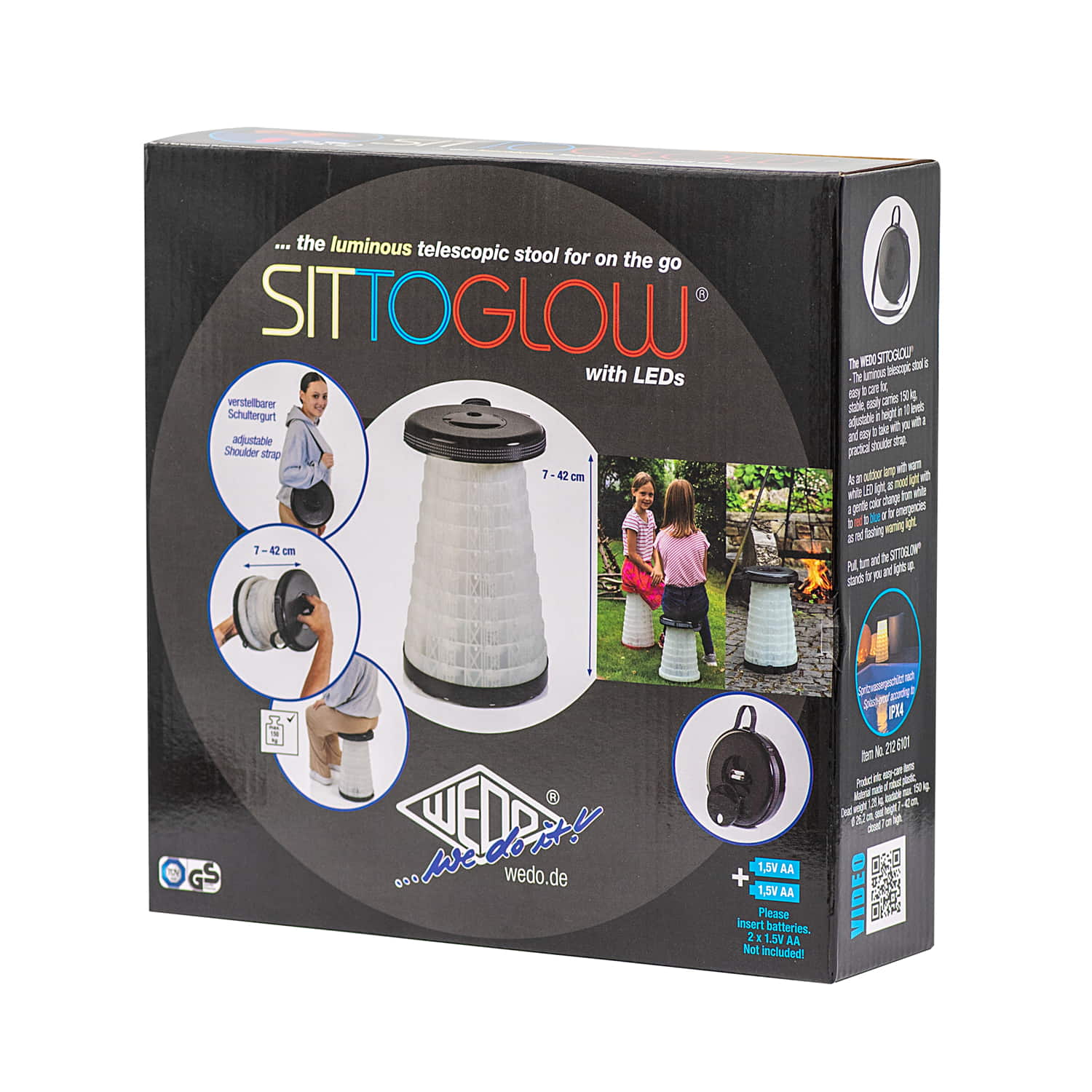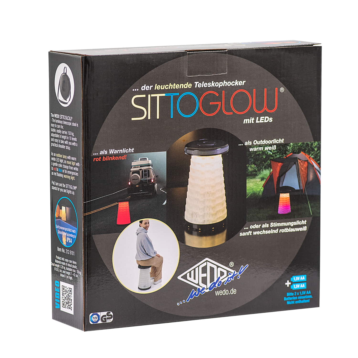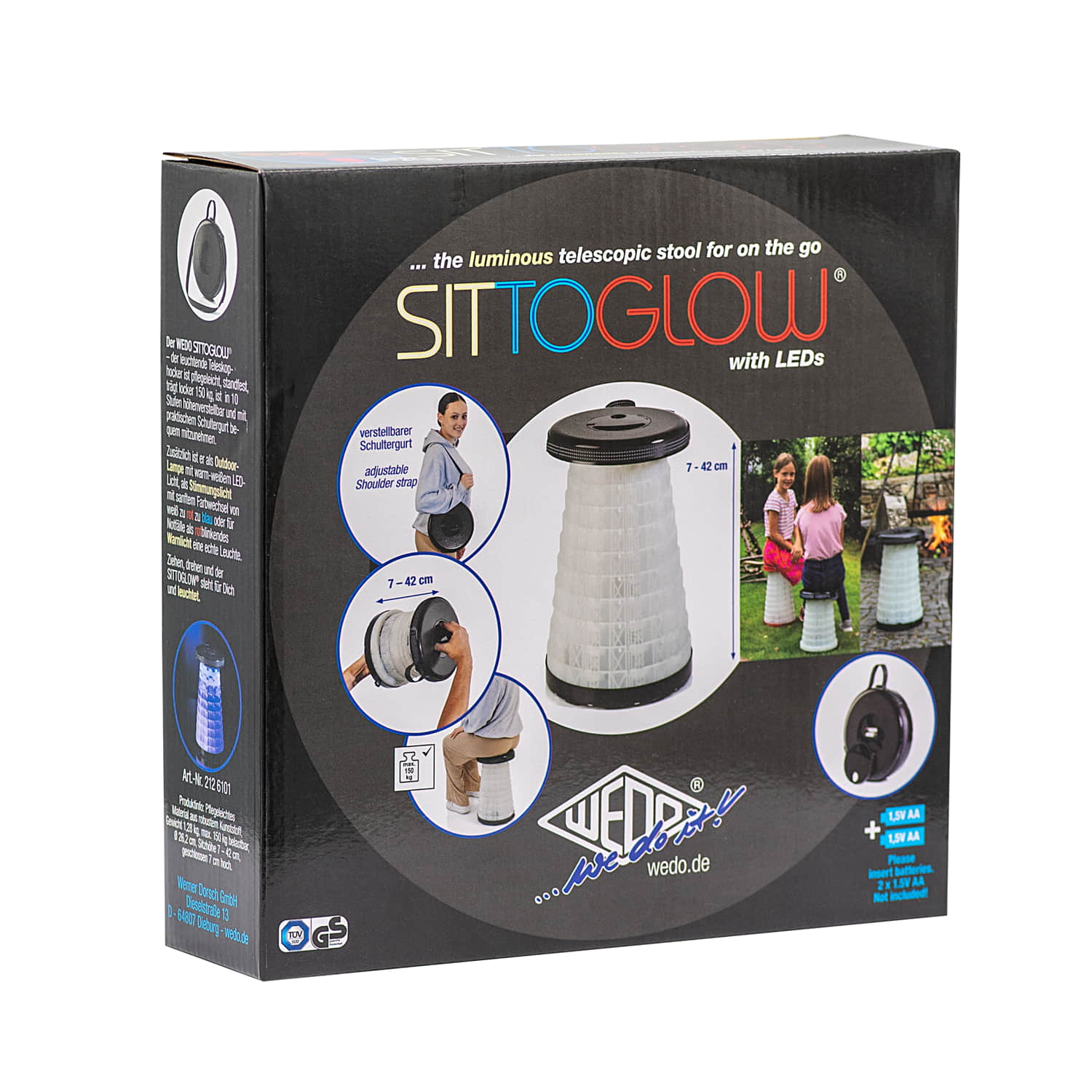 WEDO Teleskophocker SITTOGLOW Der leuchtende Teleskophocker – pflegeleicht, standfest, in 10 Stufen höhenverstellbar, mit praktischem Schultergurt. Als spritzwassergeschützte Outdoor-Lampe leuchtet der weiße Fuß des Hockers je nachdem wie oft der Schalter im Sitz gedrückt wird in drei Varianten: als Outdoorlampe durchgehend mit warm-weißem LED-Licht, als Party-Stimmungslicht mit sanftem Farbübergang von Weiß zu Rot zu Blau oder rot als blinkendes Warnlicht für Notfälle. Batteriefach im Sitz: 2 x 1,5V AA Batterien (nicht im Lieferumfang enthalten). Pflegeleichtes Material aus ABS-Kunststoff, Trageriemen aus Nylon PA6. Produktgewicht 1,28 kg, mit einem Maximalgewicht von 150 kg belastbar. Spritzwassergeschützt und TÜV-GS geprüft! Fuß weiß, Sitzfarbe schwarz. Maße: max. 42 x 26,2 cm. Geschlossen 7 cm hoch. Sitzhöhe 42 cm. Einzeln in farbiger Kartonverpackung.