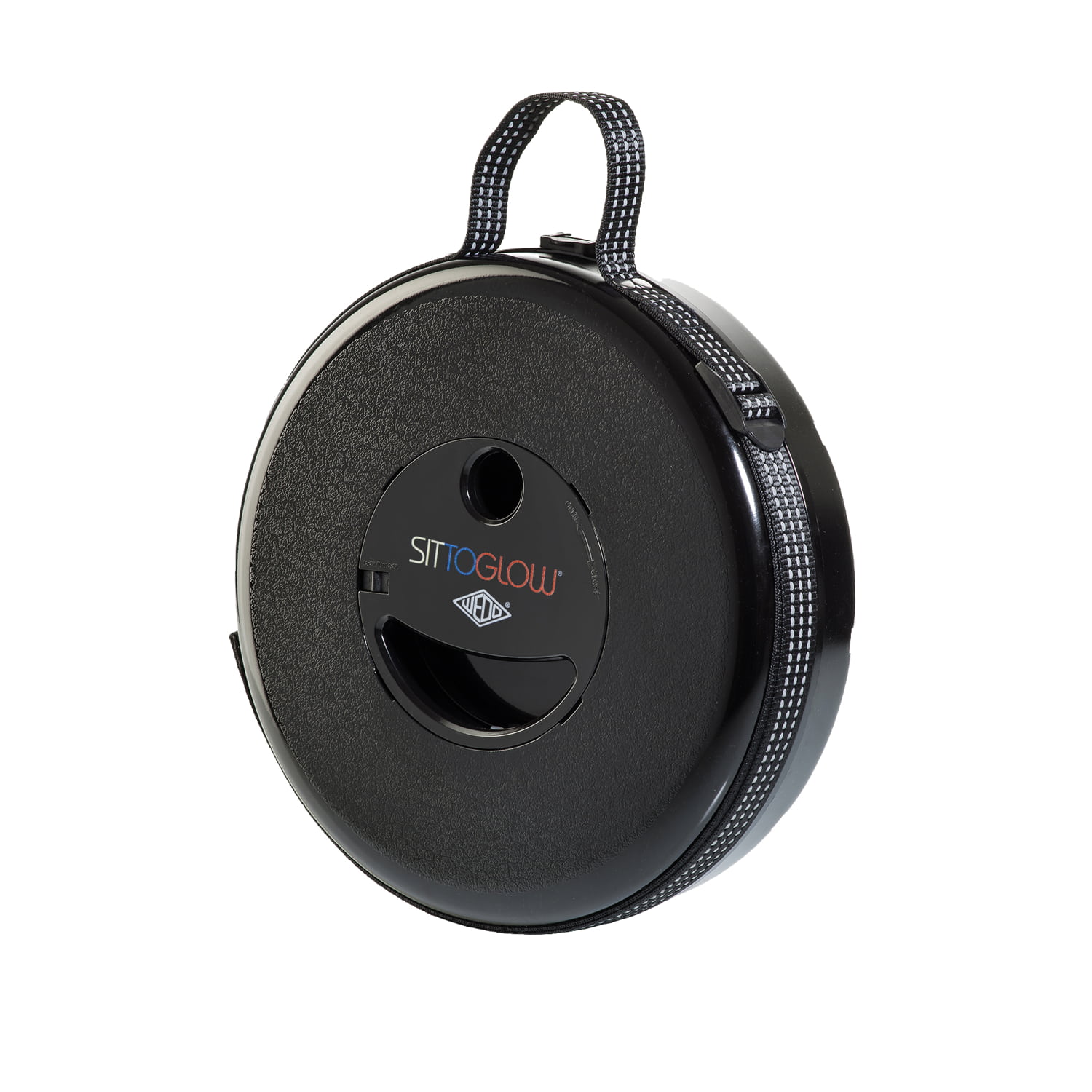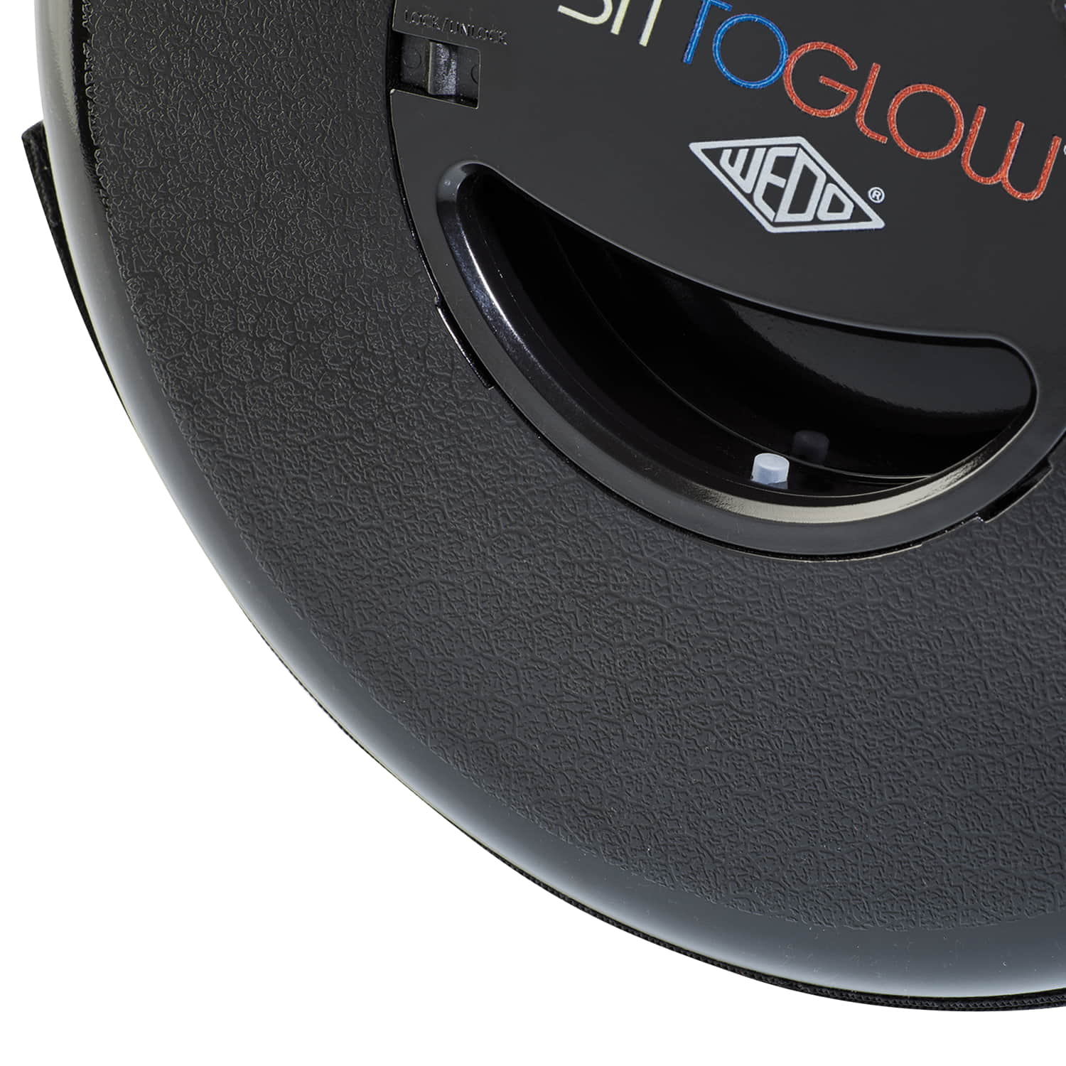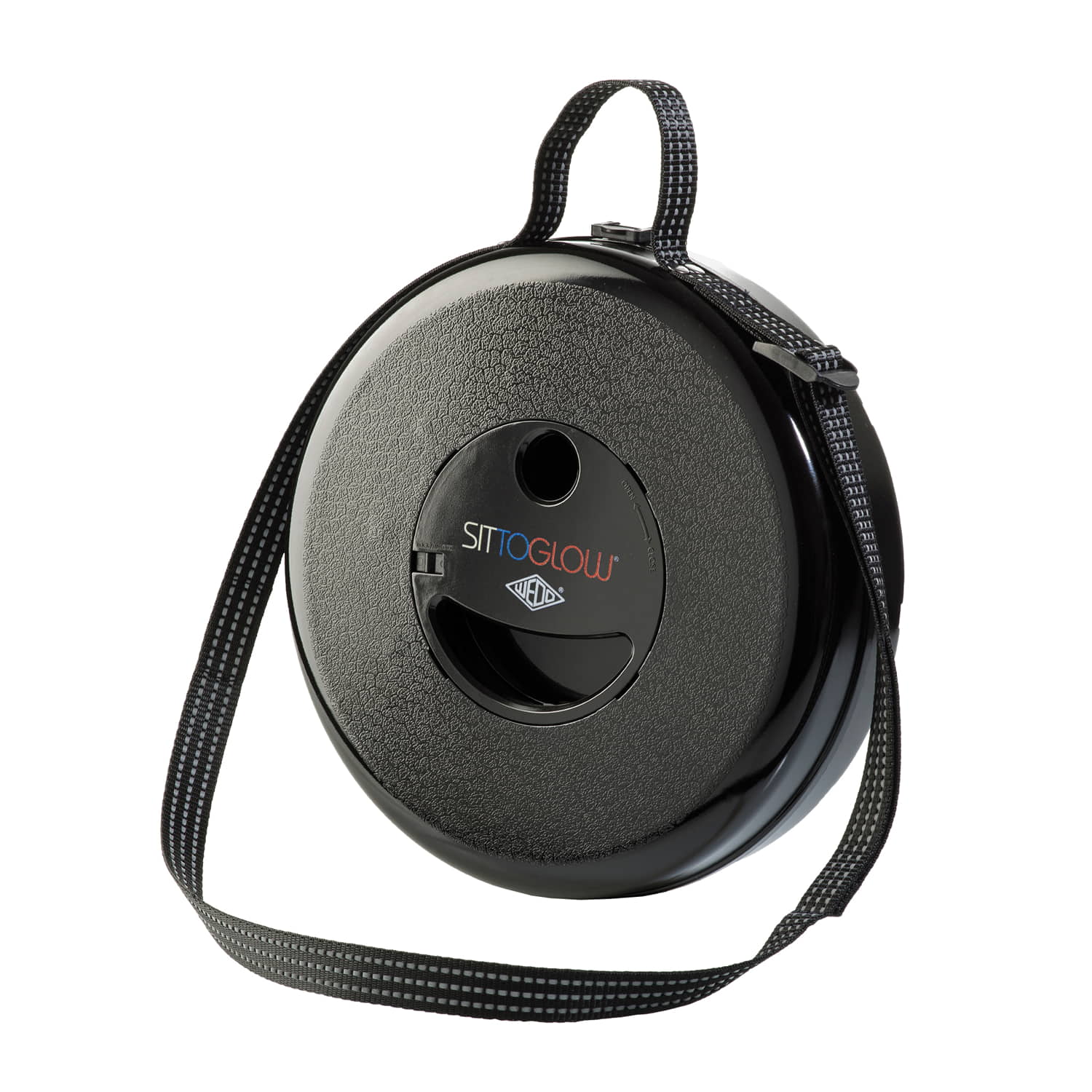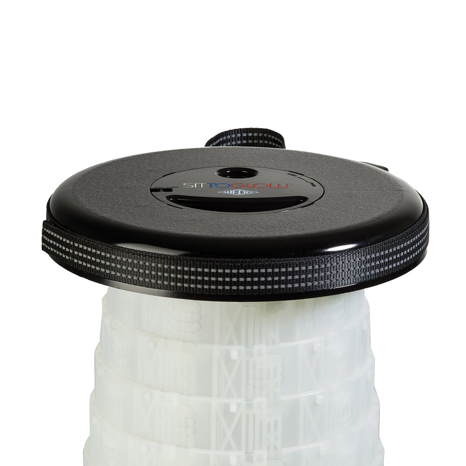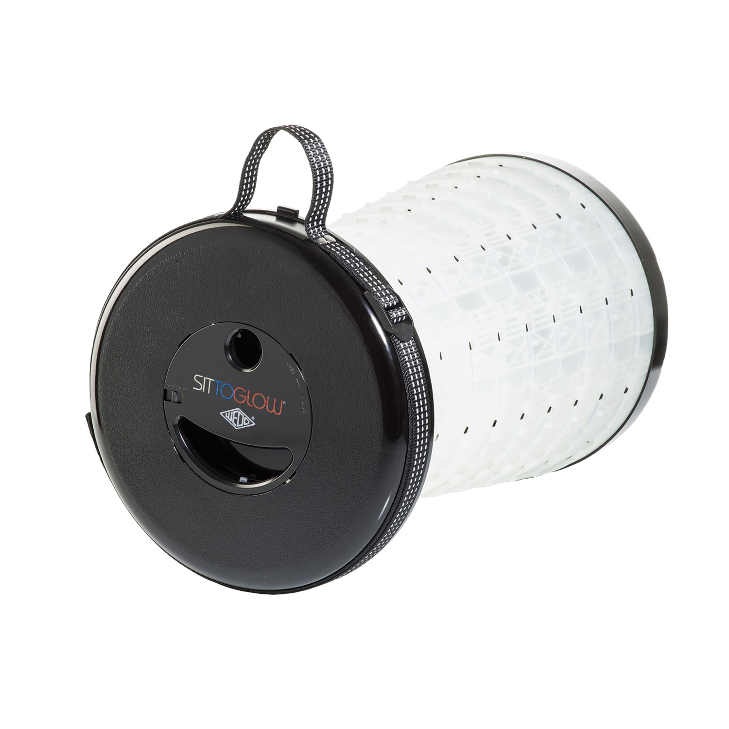 WEDO Teleskophocker SITTOGLOW Der leuchtende Teleskophocker – pflegeleicht, standfest, in 10 Stufen höhenverstellbar, mit praktischem Schultergurt. Als spritzwassergeschützte Outdoor-Lampe leuchtet der weiße Fuß des Hockers je nachdem wie oft der Schalter im Sitz gedrückt wird in drei Varianten: als Outdoorlampe durchgehend mit warm-weißem LED-Licht, als Party-Stimmungslicht mit sanftem Farbübergang von Weiß zu Rot zu Blau oder rot als blinkendes Warnlicht für Notfälle. Batteriefach im Sitz: 2 x 1,5V AA Batterien (nicht im Lieferumfang enthalten). Pflegeleichtes Material aus ABS-Kunststoff, Trageriemen aus Nylon PA6. Produktgewicht 1,28 kg, mit einem Maximalgewicht von 150 kg belastbar. Spritzwassergeschützt und TÜV-GS geprüft! Fuß weiß, Sitzfarbe schwarz. Maße: max. 42 x 26,2 cm. Geschlossen 7 cm hoch. Sitzhöhe 42 cm. Einzeln in farbiger Kartonverpackung.