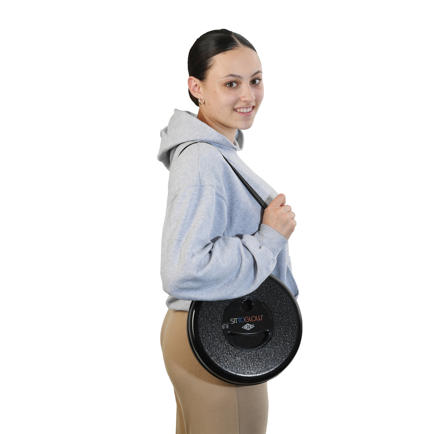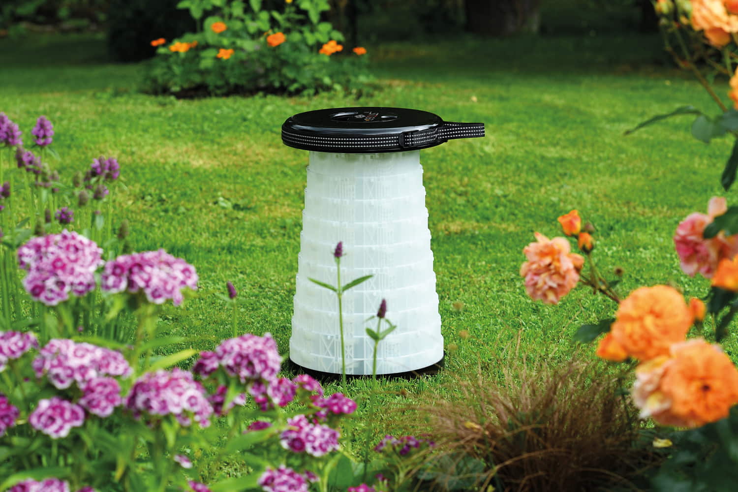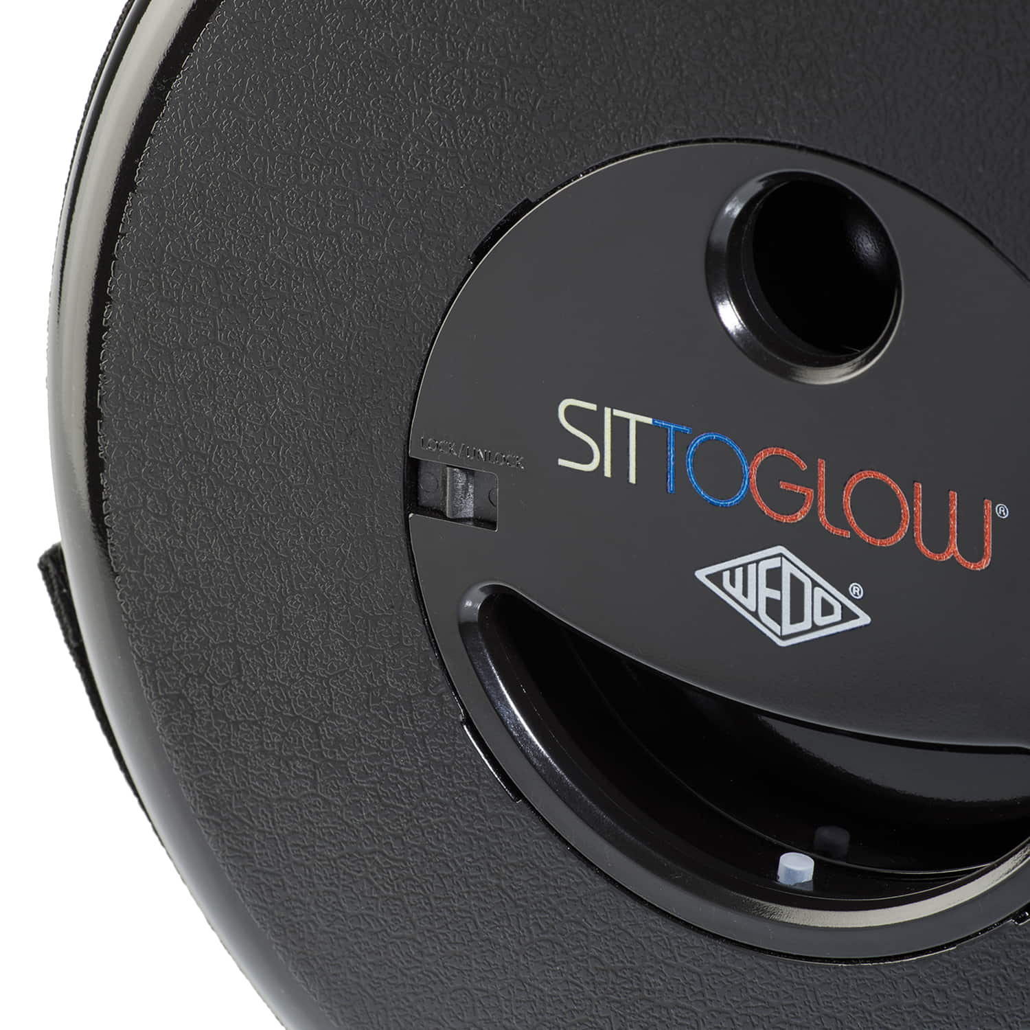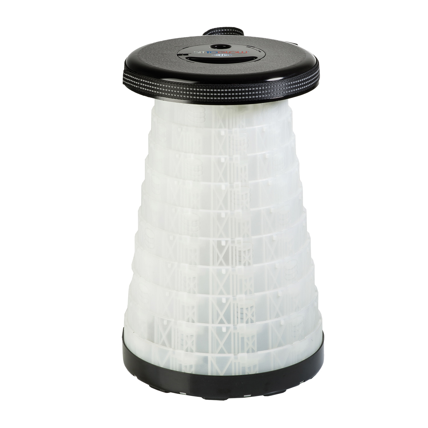 WEDO Teleskophocker SITTOGLOW Der leuchtende Teleskophocker – pflegeleicht, standfest, in 10 Stufen höhenverstellbar, mit praktischem Schultergurt. Als spritzwassergeschützte Outdoor-Lampe leuchtet der weiße Fuß des Hockers je nachdem wie oft der Schalter im Sitz gedrückt wird in drei Varianten: als Outdoorlampe durchgehend mit warm-weißem LED-Licht, als Party-Stimmungslicht mit sanftem Farbübergang von Weiß zu Rot zu Blau oder rot als blinkendes Warnlicht für Notfälle. Batteriefach im Sitz: 2 x 1,5V AA Batterien (nicht im Lieferumfang enthalten). Pflegeleichtes Material aus ABS-Kunststoff, Trageriemen aus Nylon PA6. Produktgewicht 1,28 kg, mit einem Maximalgewicht von 150 kg belastbar. Spritzwassergeschützt und TÜV-GS geprüft! Fuß weiß, Sitzfarbe schwarz. Maße: max. 42 x 26,2 cm. Geschlossen 7 cm hoch. Sitzhöhe 42 cm. Einzeln in farbiger Kartonverpackung.