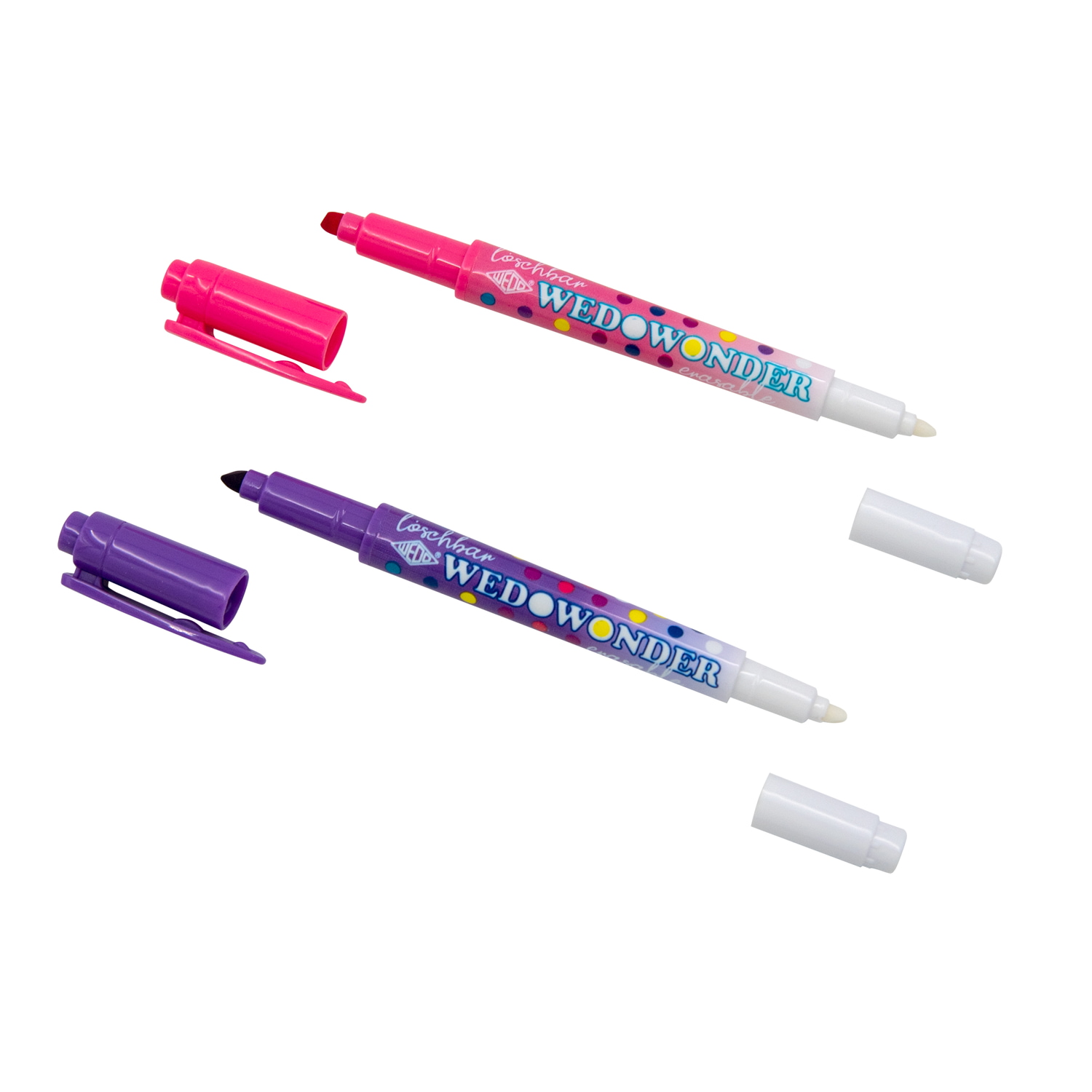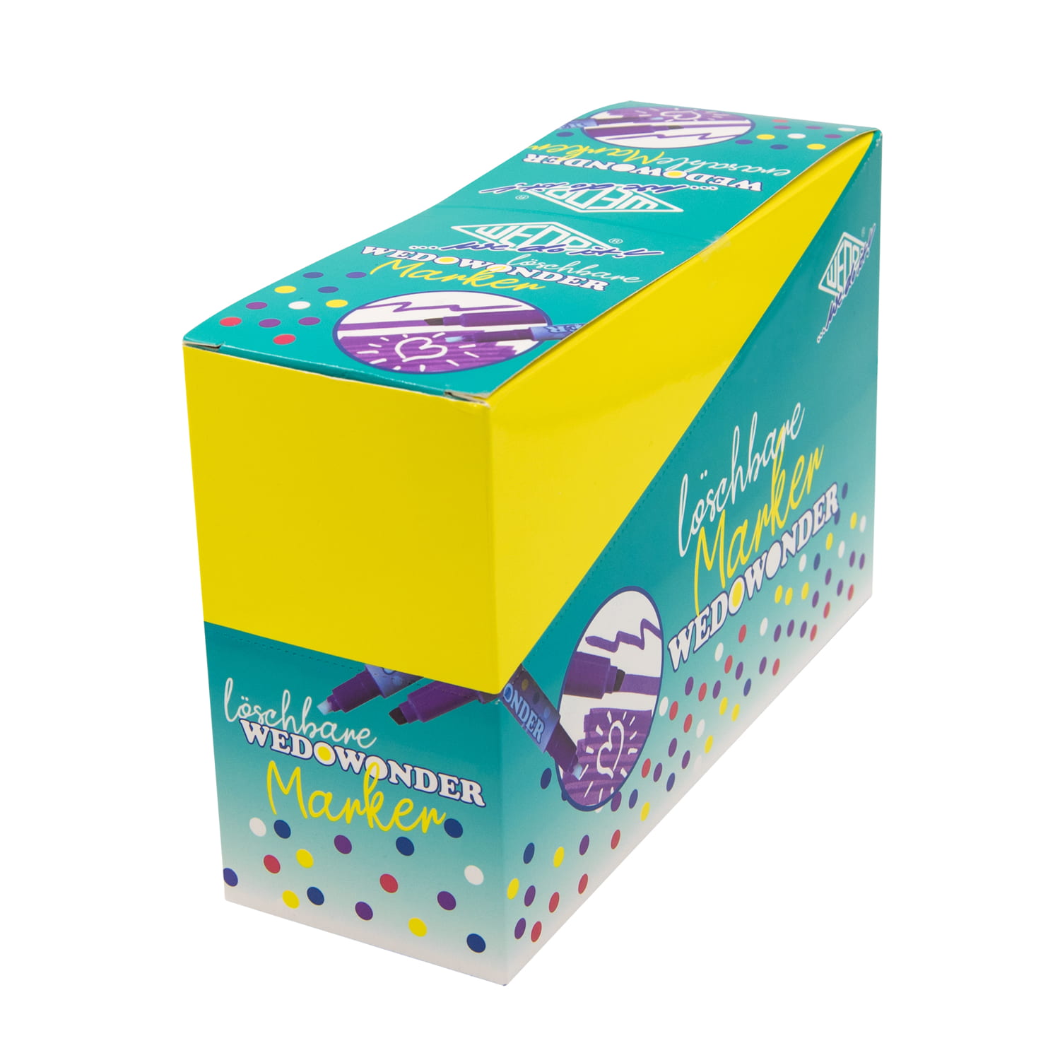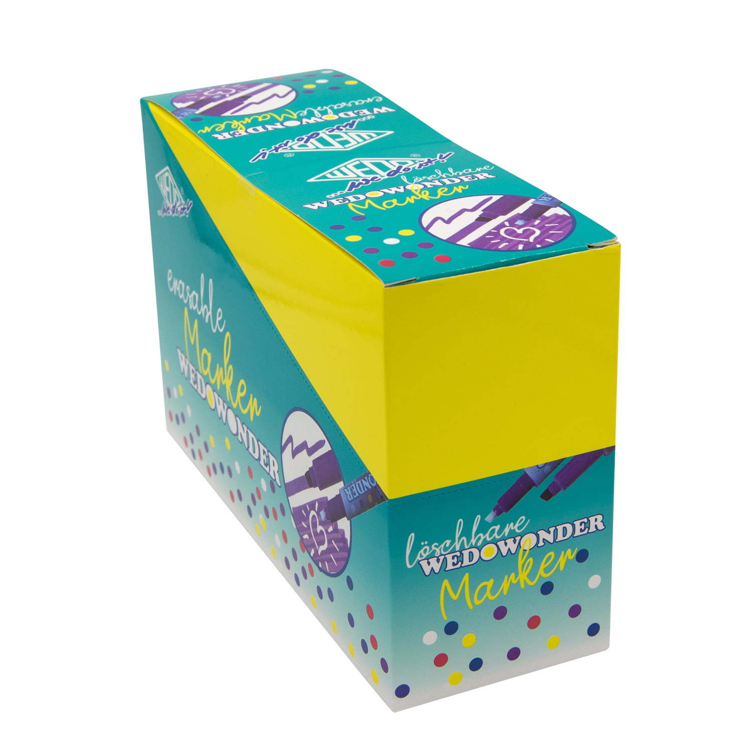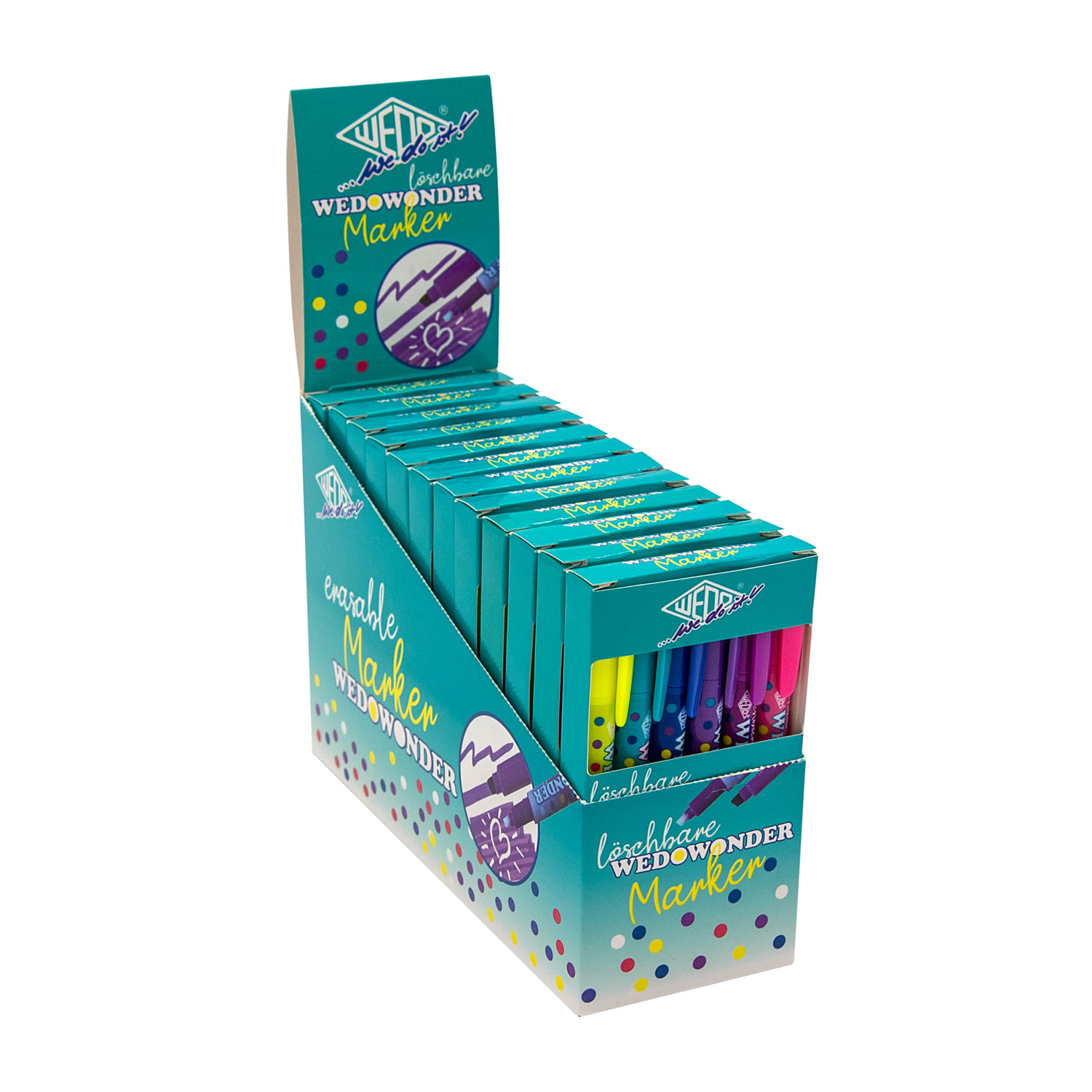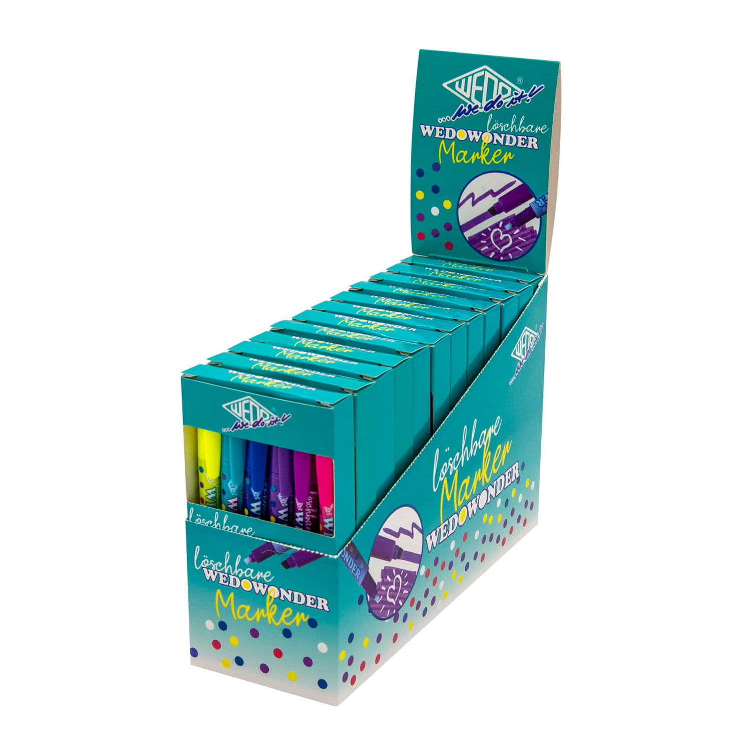 WEDO löschbarer Textmarker „wedowonder“. 6 Marker im Set in attraktiven Farben (gelb, rosa, lila, violett, blau, türkis), die ähnlich wie mit einem Tintenkiller, weg zu löschen sind … Die jeweilige Farbe verschwindet, wenn die Rückseite des jeweiligen Markers eingesetzt wird, praktisch spurlos. Lösungsmittelfrei. 6 Marker im Set. Maße Einzelstift: L= 13,40 cm Ø1,60 cm, Verpackung 6er-Set: 7,50 x 1,60 x 13,60 cm. 12 Sets im kleinen, kompakten Theken-Display. Display geschlossen: 21,50 x 7,70 x 14,00 cm, aufgestellt: 21,50 × 7,70 × 24,50 cm.