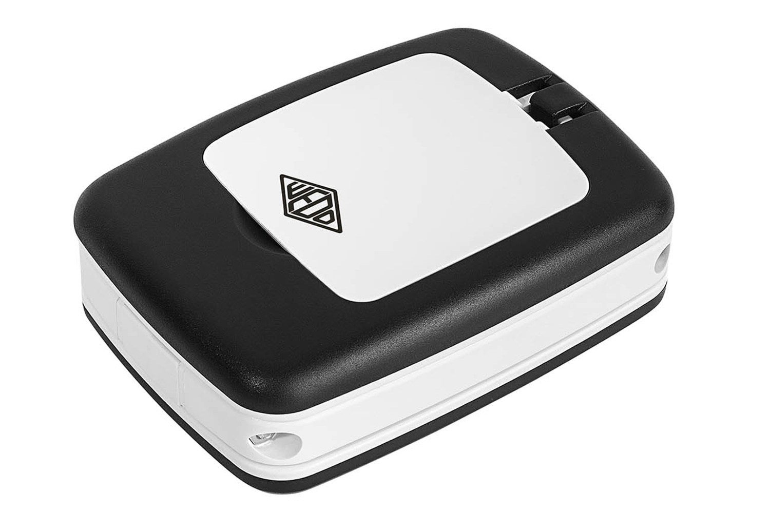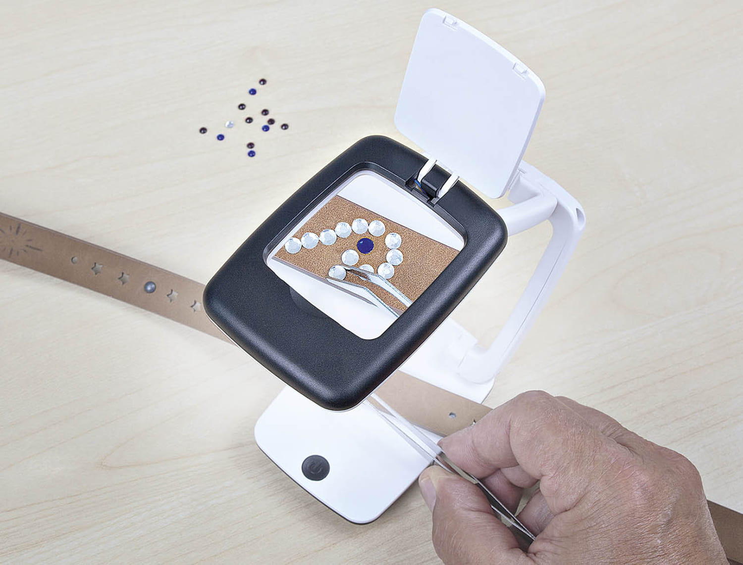 WEDO Tischlupe Pocket mit LED-Licht. Mit dieser zusammenklappbaren Tischlupe haben Sie stets beide Hände frei für filigrane Arbeiten im Haushalt und Hobby. Sie vergrößert 3-fach und spendet über 2 separate LED-Lampen wahlweise Licht mit breitem oder schmalem Kegel. Schnell ist sie über 3 Gelenke aufgestellt und der Lupenkopf optimal ausgerichtet. Ebenso schnell ist sie wieder platzsparend verstaut. Mit aufklappbarer Linsenabdeckung. Die rechteckige Kunststofflinse ist 47 x 52 mm groß. Maße: ca. 9,5 x 6,7 x 3,5 cm (zusammengeklappt). Lieferung mit 3 x 1,5 V AAA Micro-Batterien. Farbe: weiß/schwarz. Lieferung im attraktiven SB-Karton.