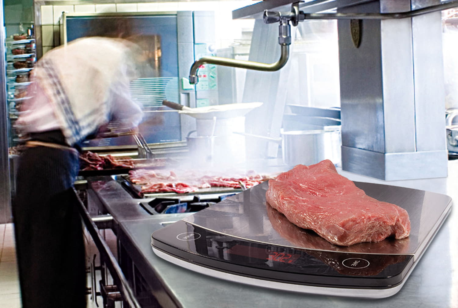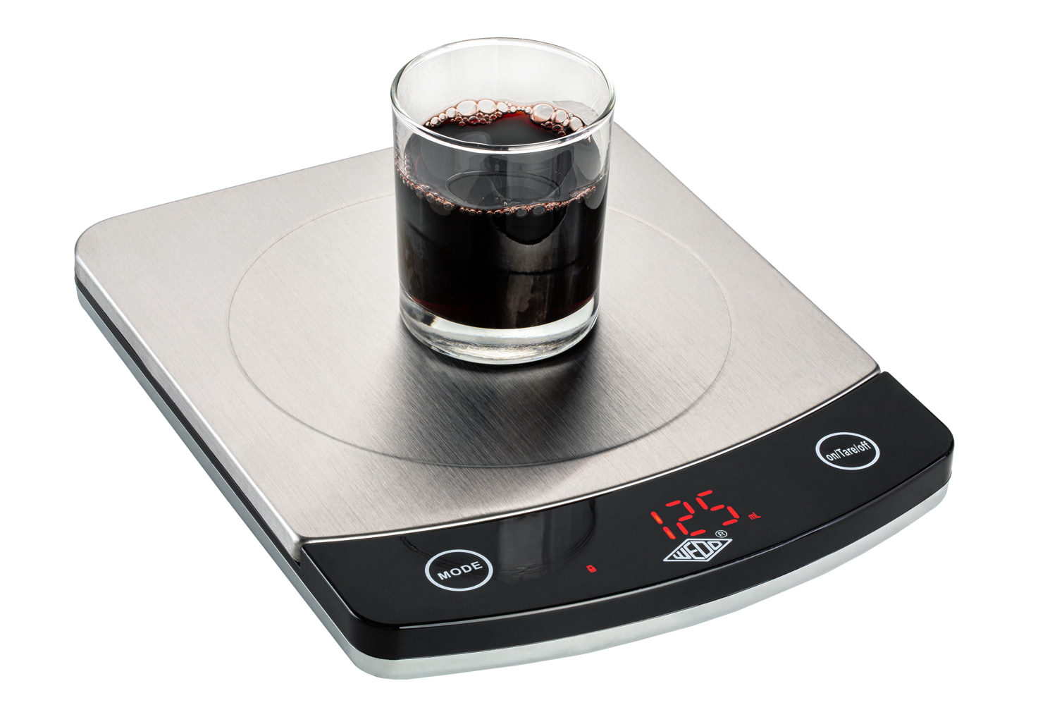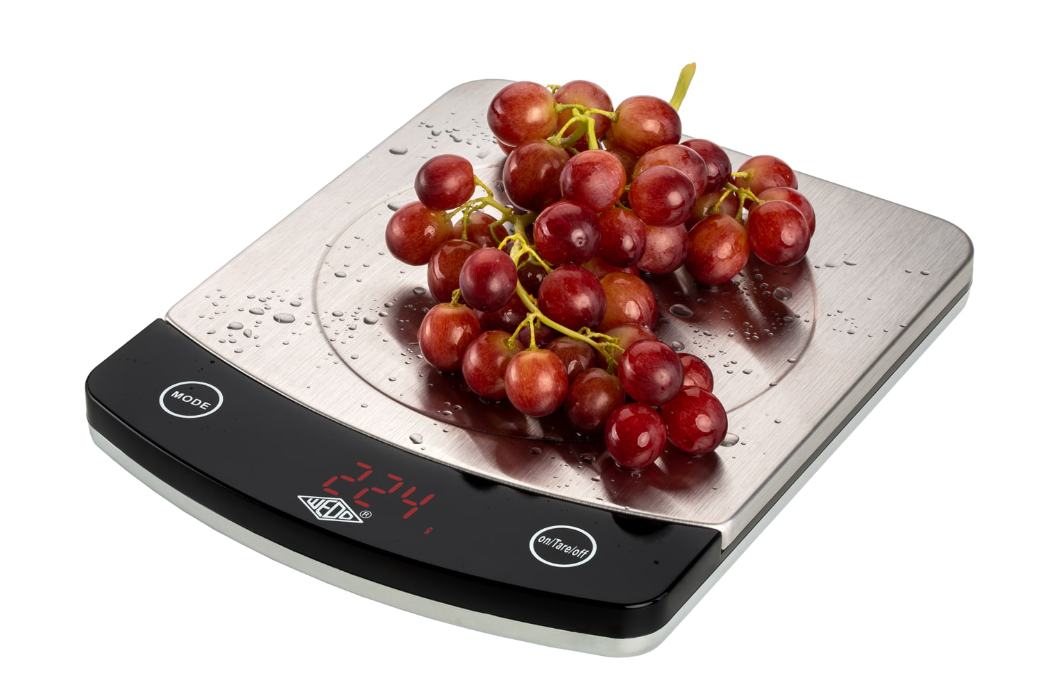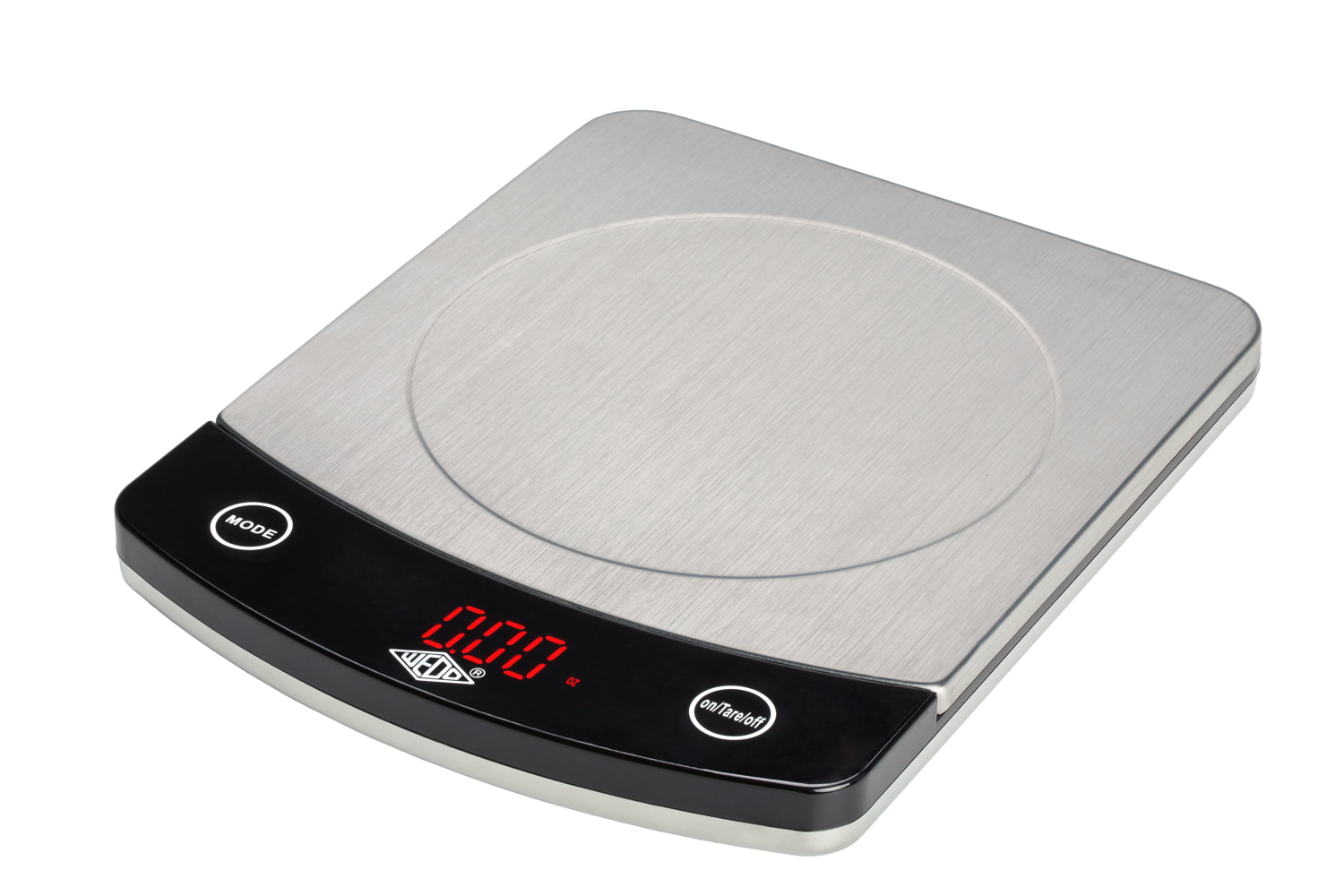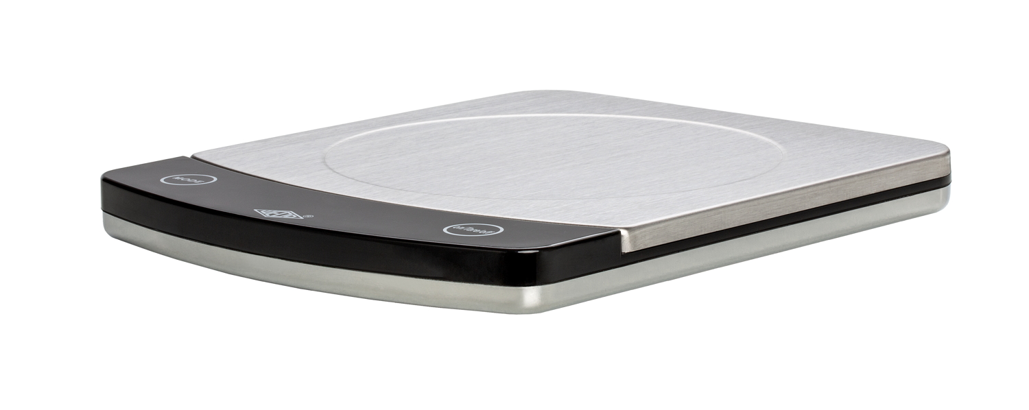 WEDO Profi-Steel - Diese robuste, superflache Waage ist mit einem Wiegeteller aus rostfreiem Edelstahl gefertigt und spritzwassergeschützt gemäß IPX2. Die Profi-Steel wiegt bis zu 10 kg: bis 5 kg in 1-Gramm-Schritten, von 5 - 10 kg in 2-Gramm-Schritten. Sie ist zusätzlich mit einer Tarafunktion ausgestattet. Die Wiegeeinheiten sind g, kg, oz, lb und ml. Die Waage arbeitet mit vier Standardbatterien, ohne Netzanschluss. Die Lieferung erfolgt mit 4 x 1,5 V AAA Micro-Batterien. Bei Nichtbenutzung schaltet die Waage nach ca. 60 Sekunden automatisch ab. Mindestlast: 20 g. Farbe: silber/schwarz. Maße: Waage 25,0 x 20,0 x 2,6 cm, Wiegeteller 20,5 x 20,0 cm. 3 Jahre Garantie!
