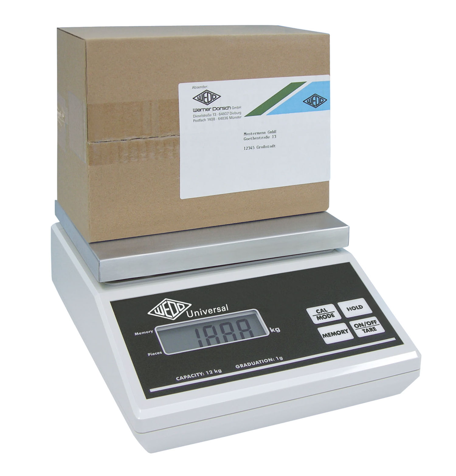 WEDO UniversalL Wiege- und Stückzählwaage für präzise nicht eichpflichtige Wägungen im Industriebereich und im Lager. Tragkraft 12 kg, Teilung 1 g. Gut lesbare LCD-Anzeige mit 24 mm hohen Ziffern. Wiegeteller aus Edelstahl. Stückzählfunktion mit hoher Genauigkeit. Mindeststückgewicht 2 g. Referenzstückzahlen 5, 10, 25 oder 50 Stück. Weitere Funktionen: Tara / Halten / Speichern / Justieren. Lieferung inkl. Arbeitsschutzhaube und Netzgerät 9V/300mA. Batteriebetrieb ist über eine 9 V Blockbatterie möglich. Eine automatische Abschaltung erfolgt dann nach ca. 3 Minuten. Maße: 31,5 x 24,5 x 11,9 cm, Wiegeteller 23,0 x 18,0 cm. 3 Jahre Garantie